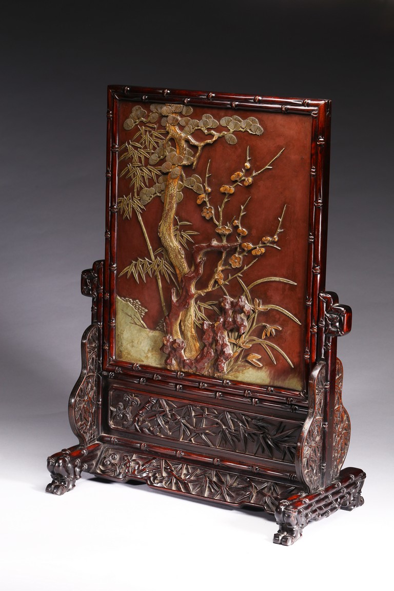 The screen is of rectangular shape and carved in high relief depicting bamboo, chrysanthemum, pines, and orchids branches all issuing from rocks. The stone is of three colors, consisting of dark red, light green and sand yellow color. The stone is set into a bamboo trunk shaped and decorated rosewood stand with scrolling supports. Mid-Qing Dynasty period.