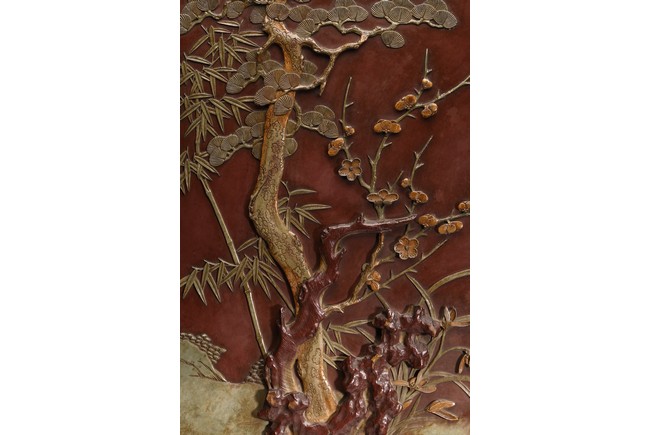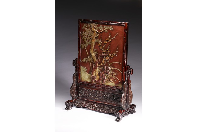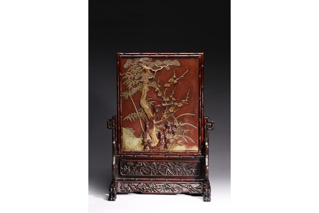 Provenance: Property from a private collection, Los Angeles 祁陽石因產湖南祁陽而得名,明清以來備受文人雅士喜愛和推崇,祁陽石質地細滑而沉,可用於琢製硯台,以此大材製座屏,亦別有趣味。此件插屏由上等祁陽石製成,石質精良,溫潤細膩,肌理瑩透,色澤深沉。採用俏色高浮雕技法,描繪松竹梅圖,畫面層次豐富,線條流暢,靜中似動。屏座也雕出竹節、竹子紋樣,為材、工、氣、意俱佳的文房陳設用器。 來源:洛杉磯私人藏家提供