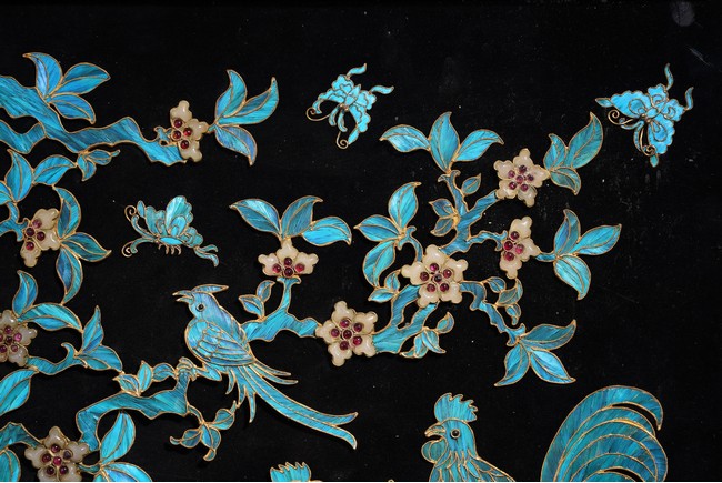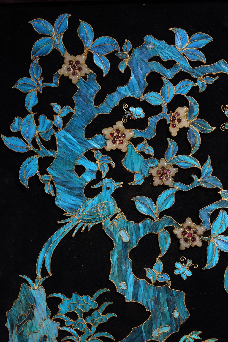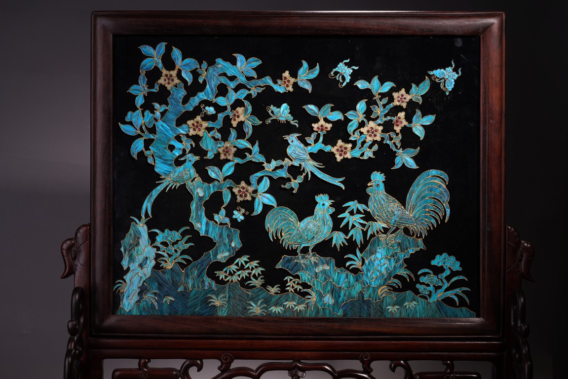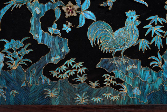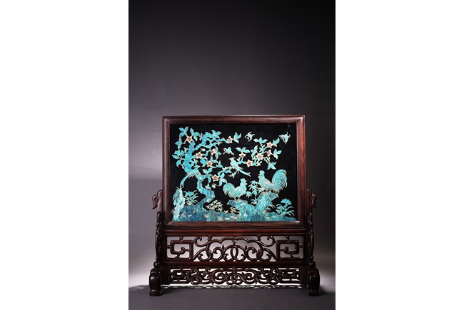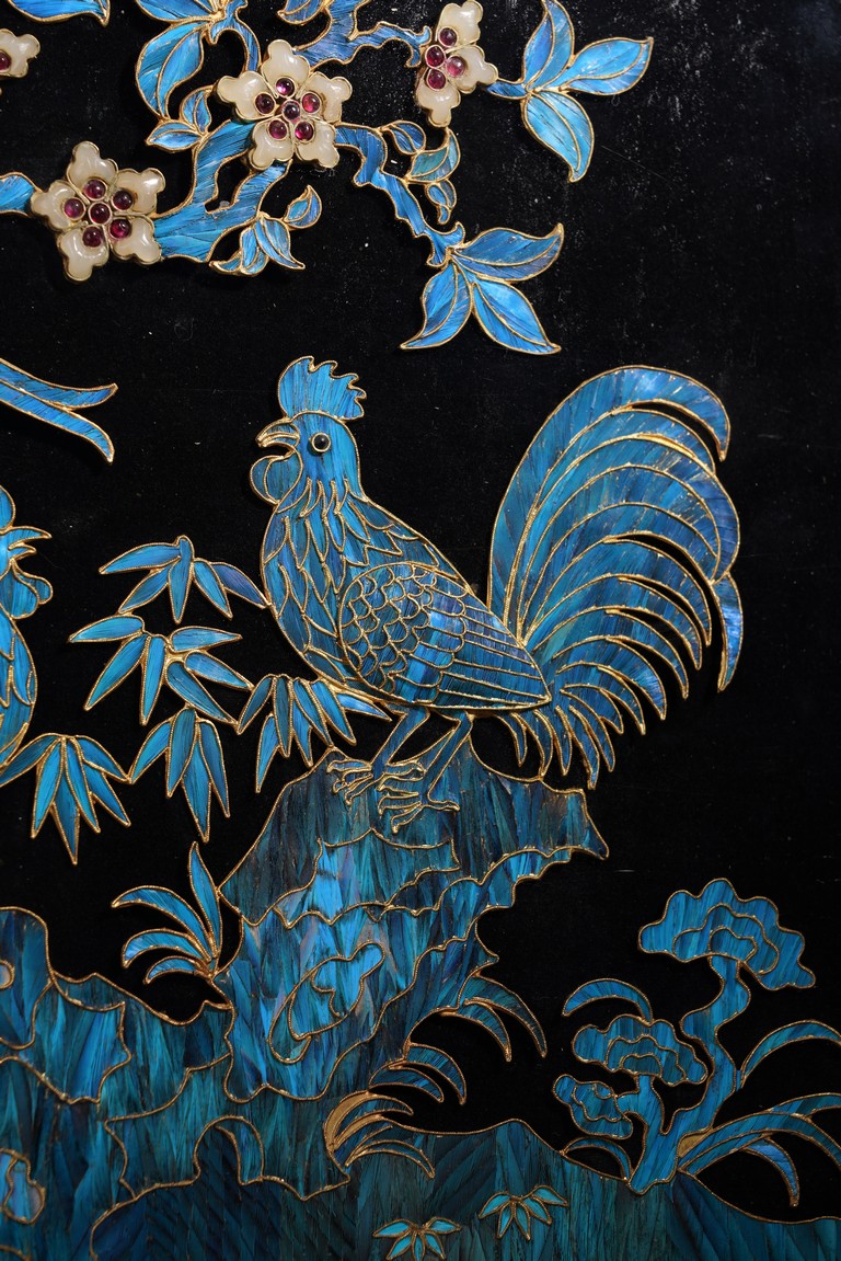 此插屏邊框以硬木為材,其屏芯黑漆為底,上嵌翠“冠上加冠圖”,兩隻公雞遙目相望,花草綻放其間,又有蝴蝶飛舞空中,整體畫面結構緊湊,佈局合理,寓意美好,有陞官發財之意。