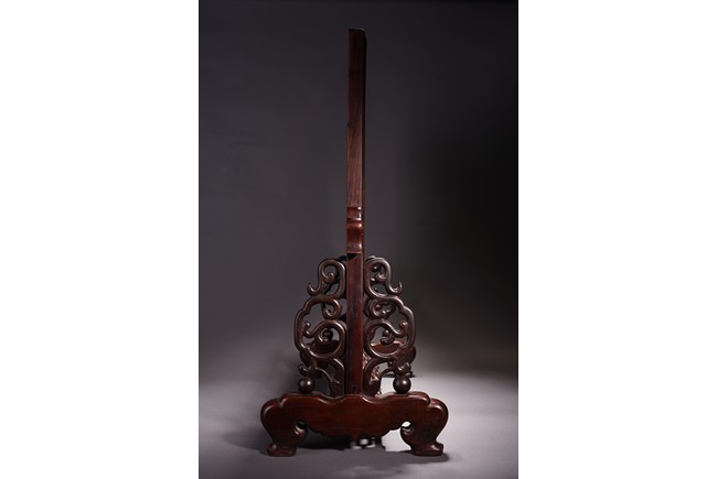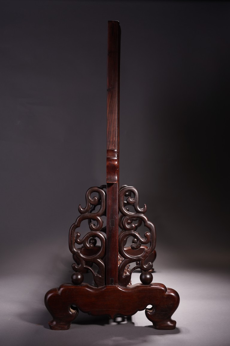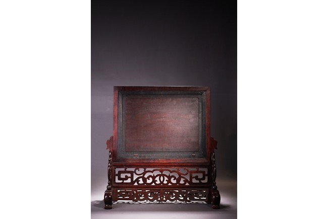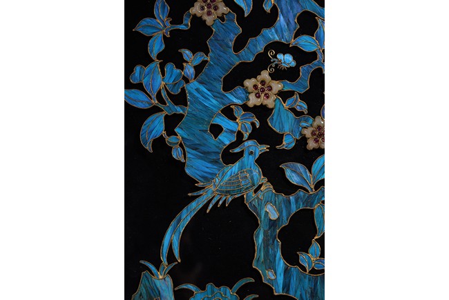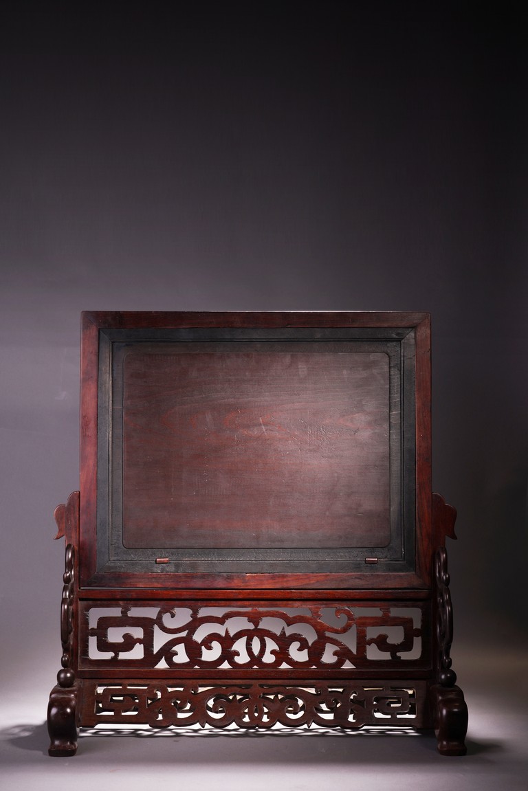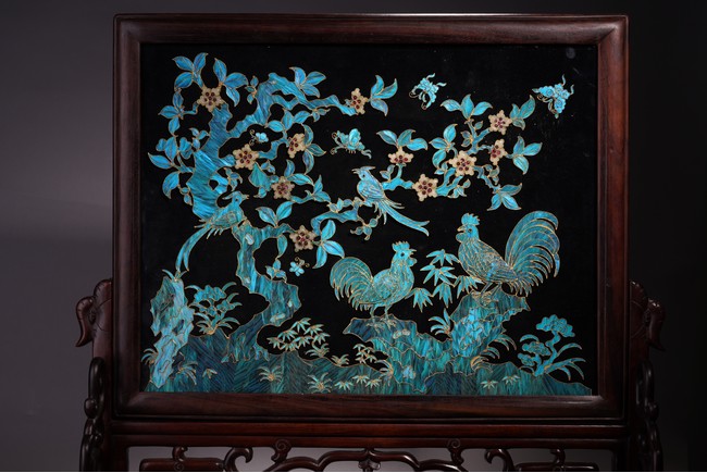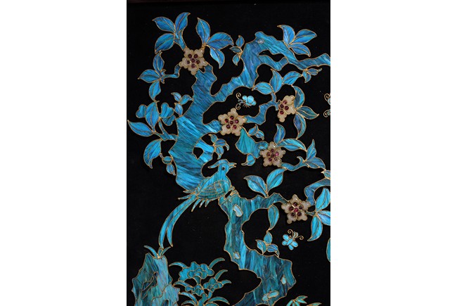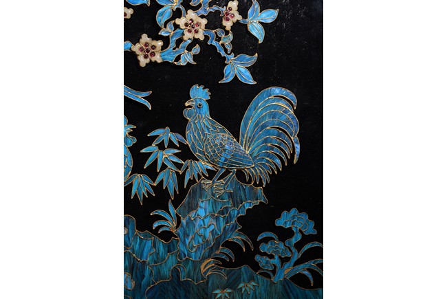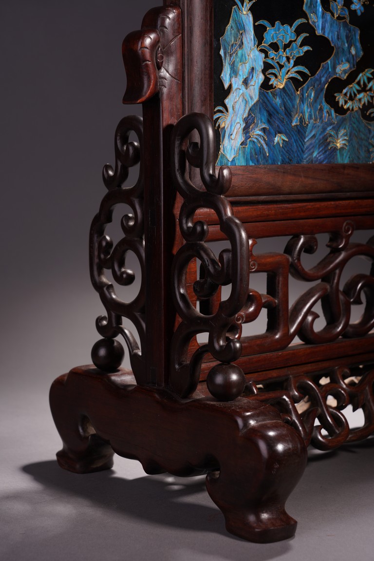 此插屏邊框以硬木為材,其屏芯黑漆為底,上嵌翠“冠上加冠圖”,兩隻公雞遙目相望,花草綻放其間,又有蝴蝶飛舞空中,整體畫面結構緊湊,佈局合理,寓意美好,有陞官發財之意。
