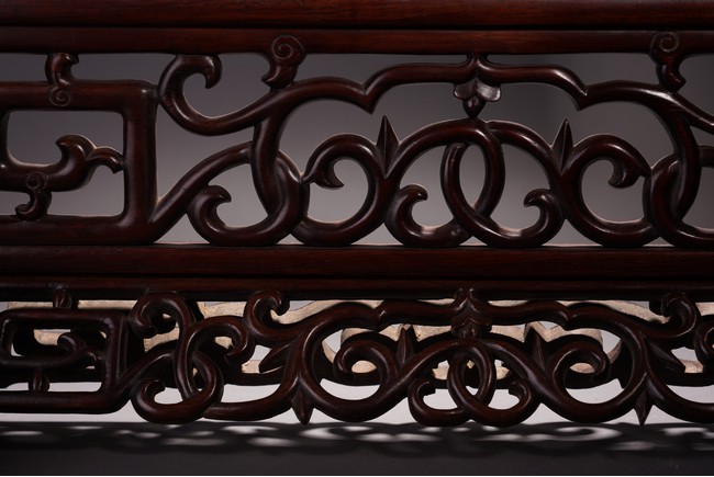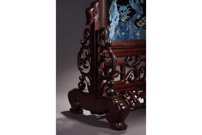The horizontal rectangular panel delicately crafted in kingfisher feather to depict chicken, birds, and butterflies in a setting of rockworks and trees, the wood stand enclosing a lower openwork panel. Qing Dynasty period.
