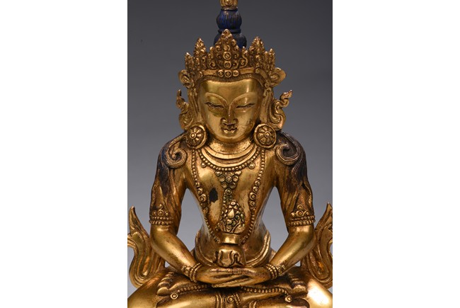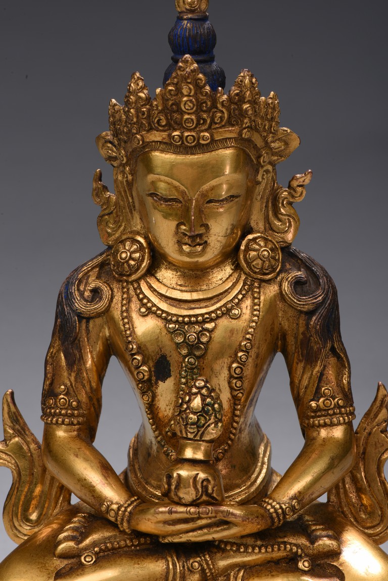 The bodhisattva is shown seated upon a double lotus throne in dhaynasana, hands in dhyana mutra holding a vessel , wearing dhoti and revealing the adorned chest, face with benevolent expression and topped tall ushnisha. Qing Dynasty period.