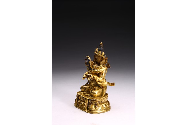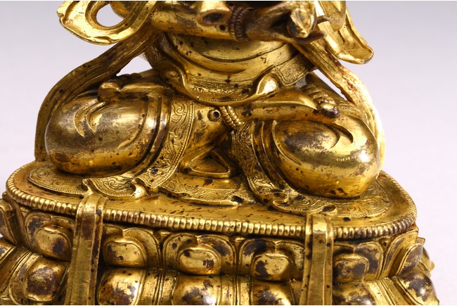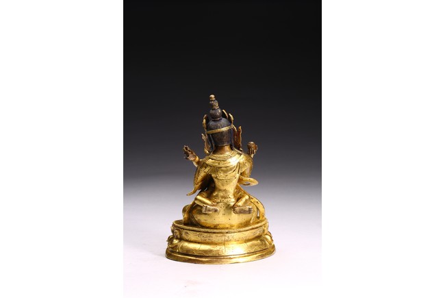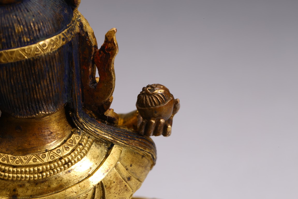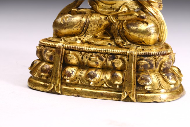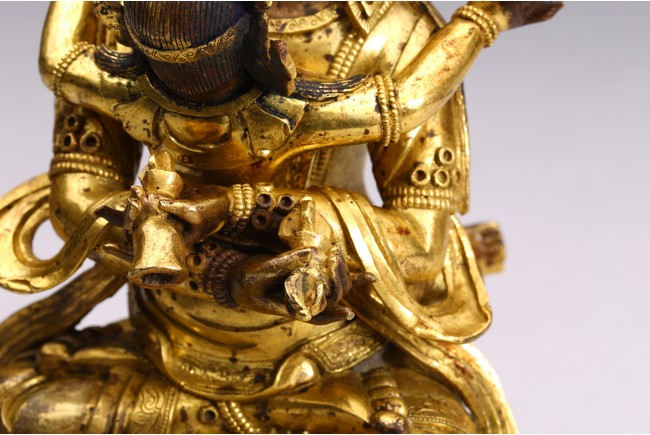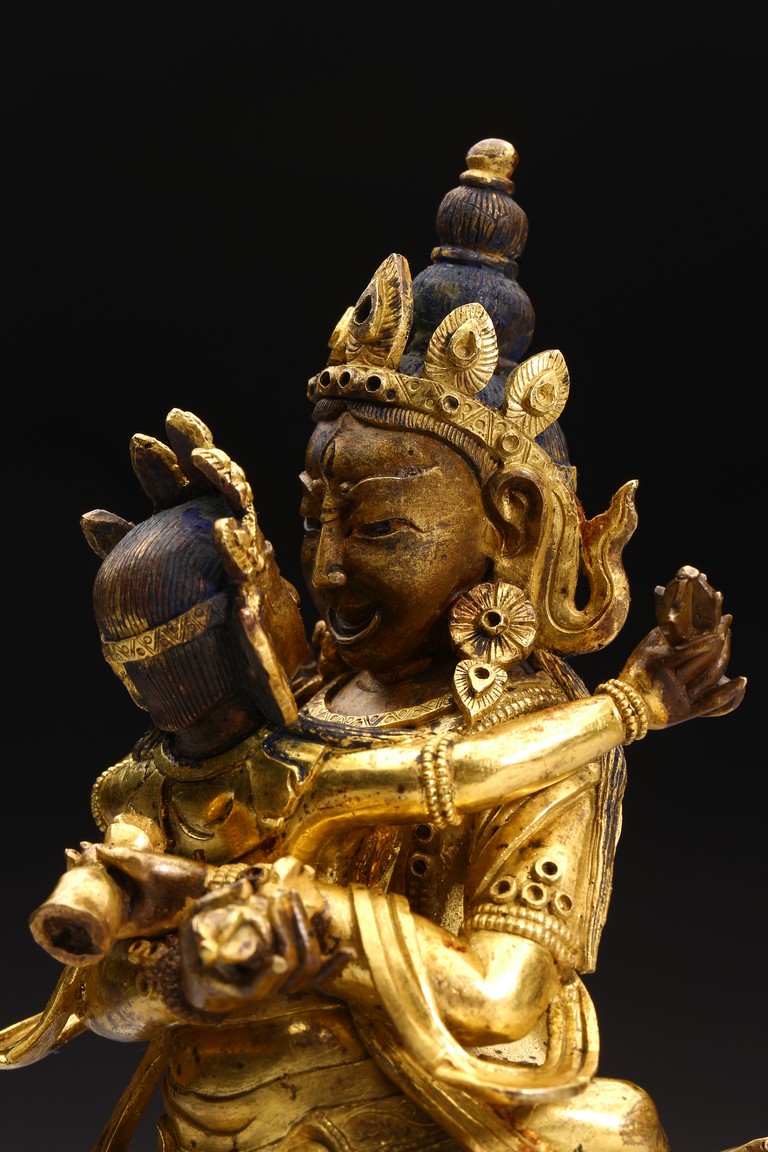 The bodhisattva is shown seated upon double lotus throne and holding a vajra in each hand, engaged in union with Vajravarahi. Qing Dynasty period.