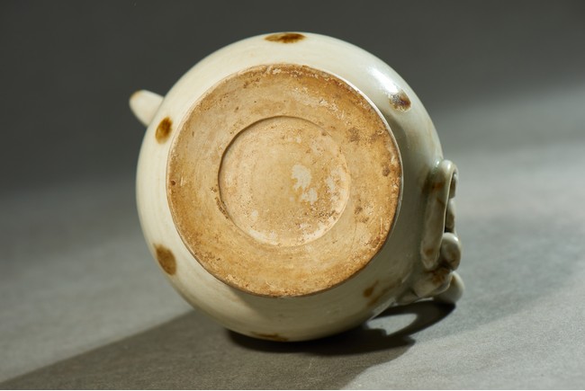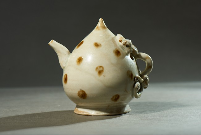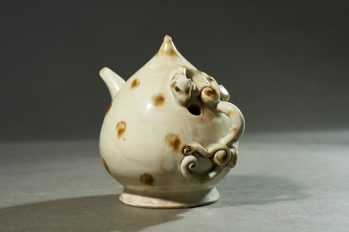 In the shape of a peach raised on a spreading foot, with chilong-form handle and spout, overall in creamy white glaze with russet splashes. Base unglazed.
