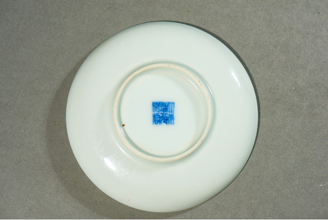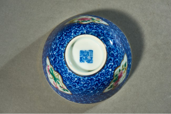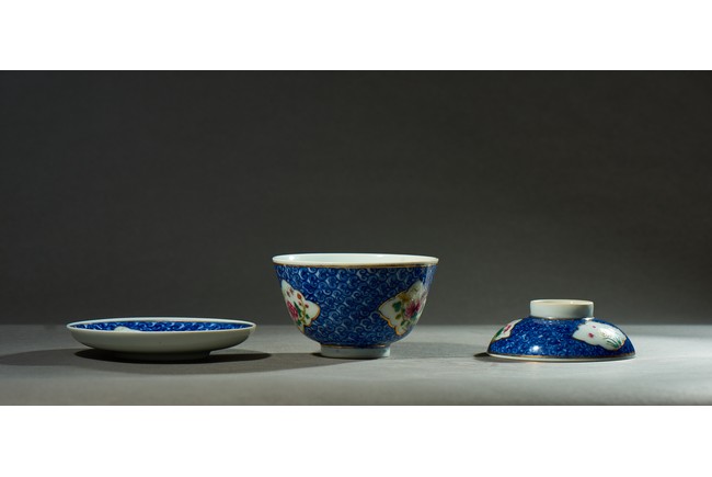 The cup body decorated with shaped cartouches enclosing flowers surrounded by dense cloud pattern, the cover and stand decorated with similar pattern, the base and cover top inscribed with marks. Qing Dynasty period.