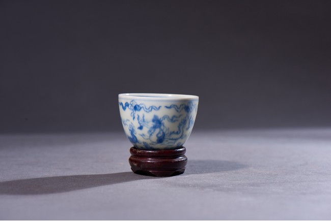 撇口,深腹,小圈足。用青花繪“雲龍紋”,龍長頭扁嘴,威武霸氣,龍身矯健。 “大明成化年制”款識。
