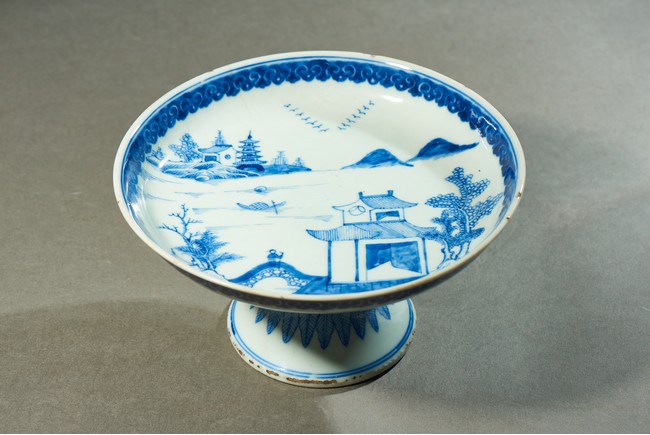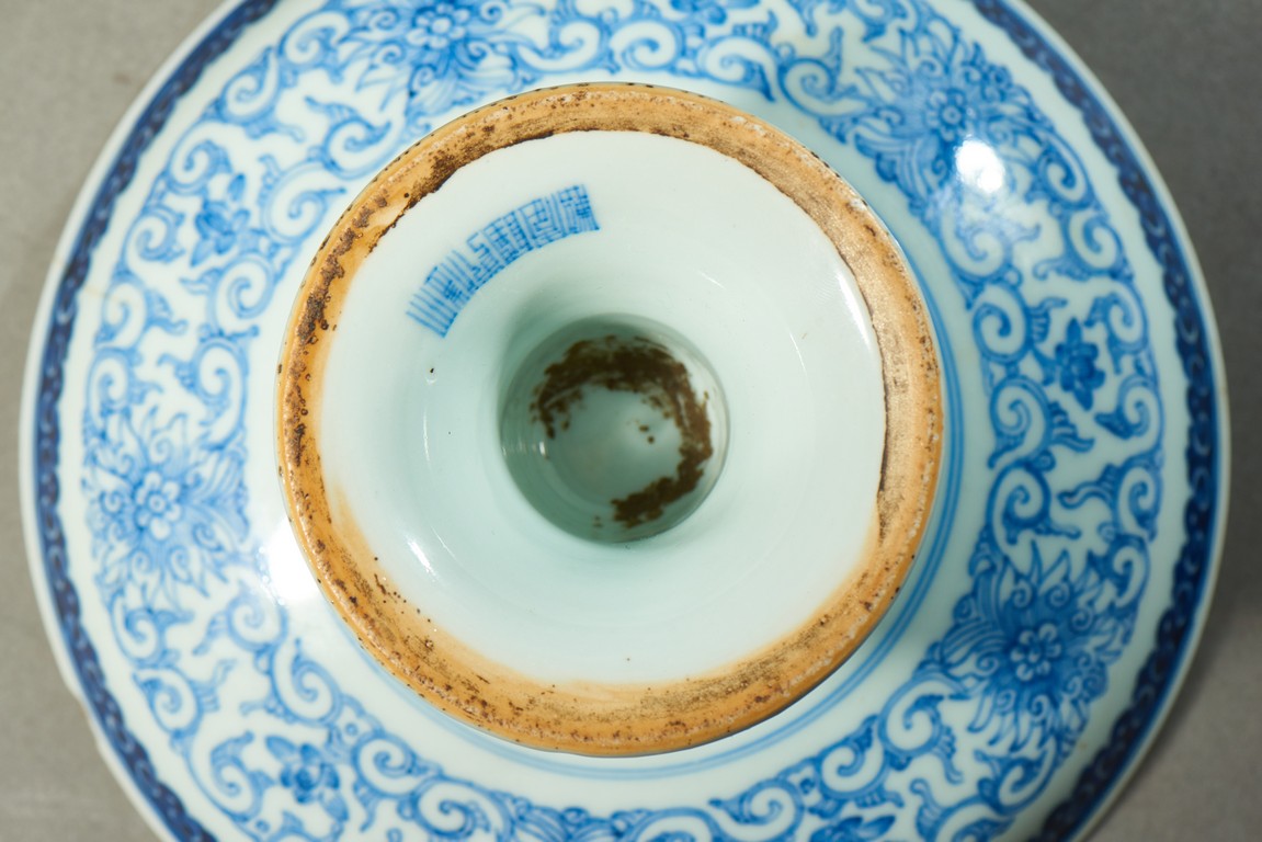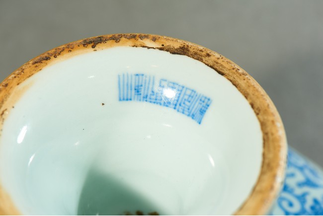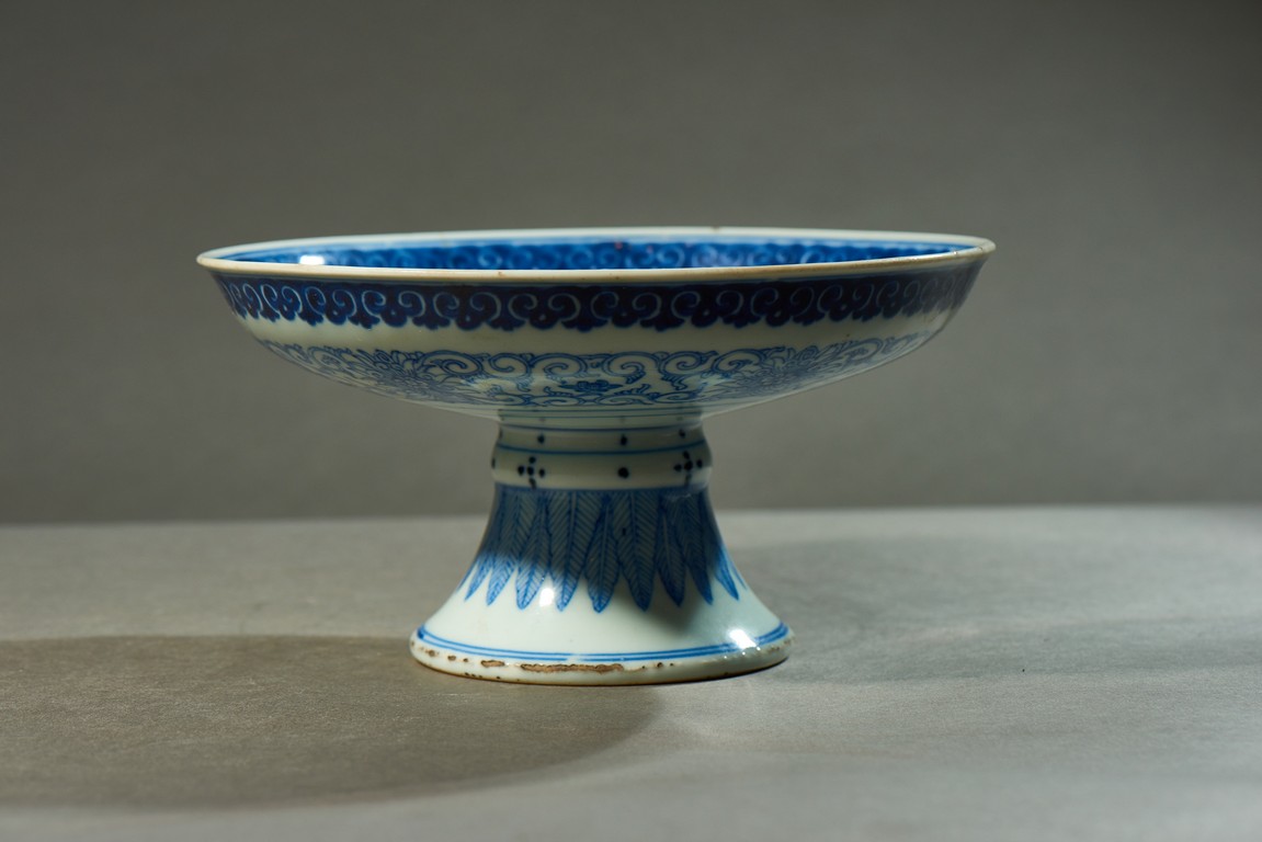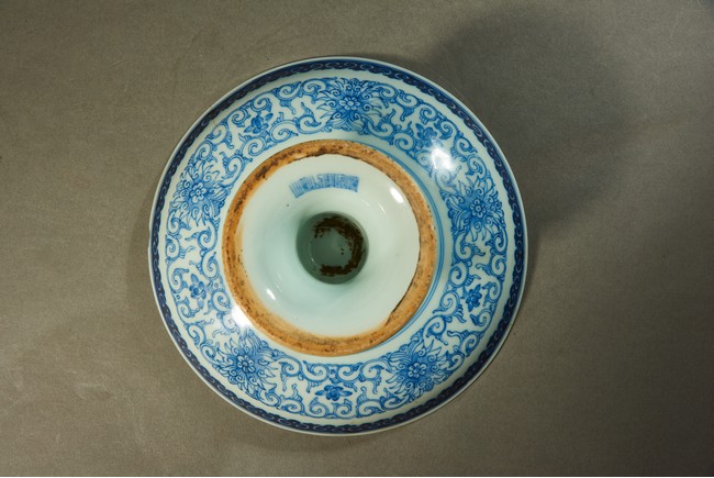 圓弧壁,敞口,高足外撇,通體以青花為飾,繪山水人物紋、靈芝如意紋、芭蕉紋。整體青花髮色鮮亮,人物構圖清晰,“大清乾隆年制”款識。