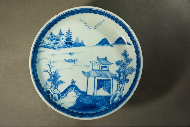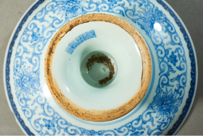 The interior of the dish painted with landscape scene, the exterior decorated with stylized lotus scrolls, the foot interior with six character mark.