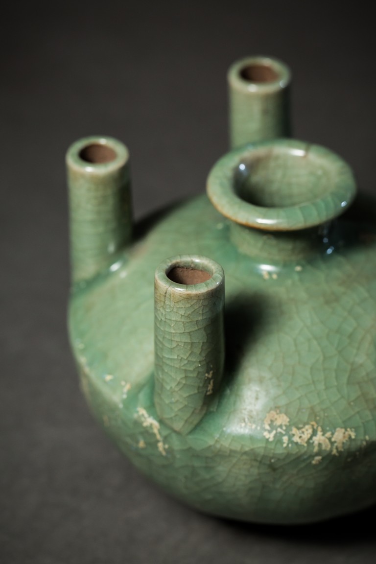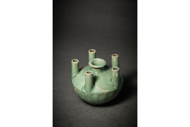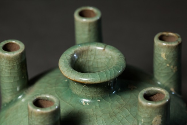 Of bombe form, the body rising to a straight neck and everted mouth rim, surrounded by five straight necks to around the shoulder, overall in attractive green glaze. Song Dynasty period.