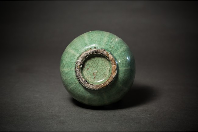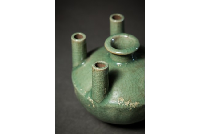 Provenance: Private collection, Boston 此器直頸,口沿外折,折肩上豎立五個細長小管,均勻分佈在瓶口周圍。圓鼓腹,下腹內收,胎體厚重,胎質潔白細膩,通體施晶瑩潤澤的梅子青,器身滿佈紋片,龍泉地區自北宋起便常出現多管造型的器皿,寓意“五穀豐登” 。 來源:波士頓私人藏家舊藏