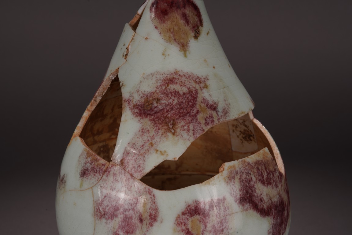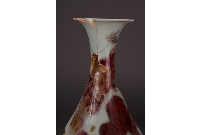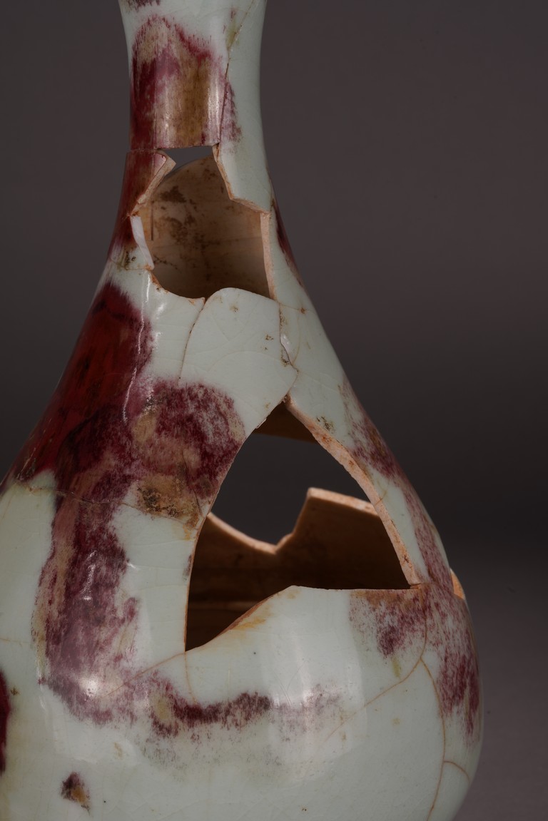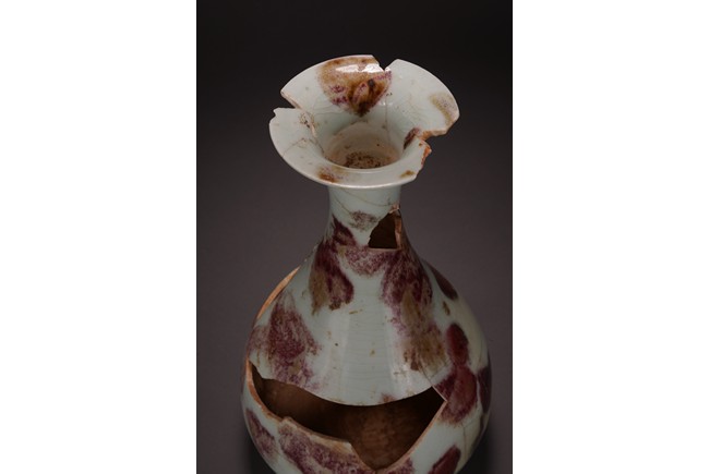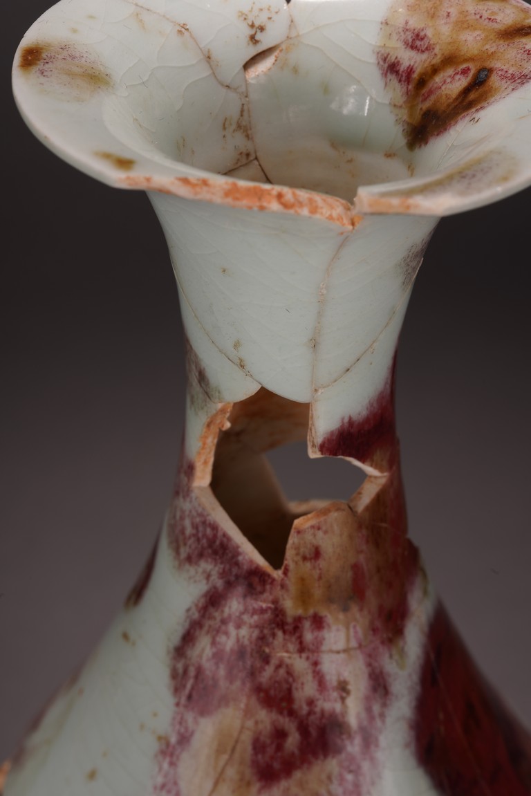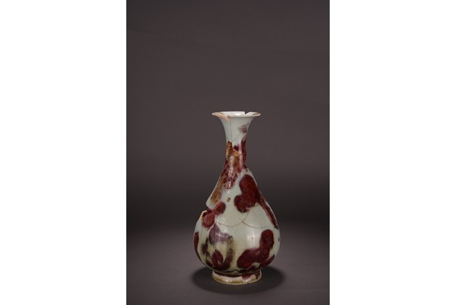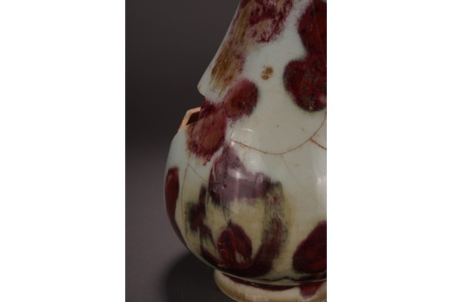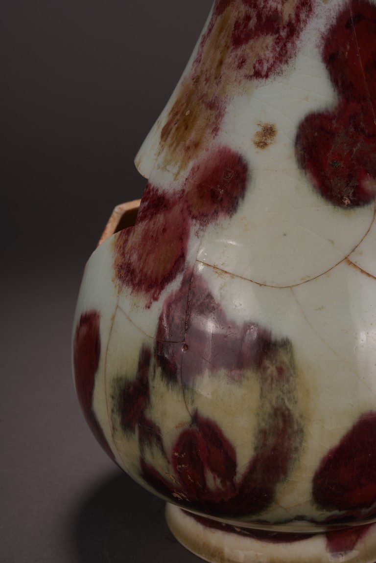 The gently rounded sides rising from a spreading foot to a waisted neck and everted rim, applied overall with a lustrous lavender-blue glaze embellished with purplish-red splashes on the body and neck, with extensive restorations. Song Dynasty period.