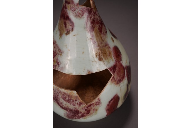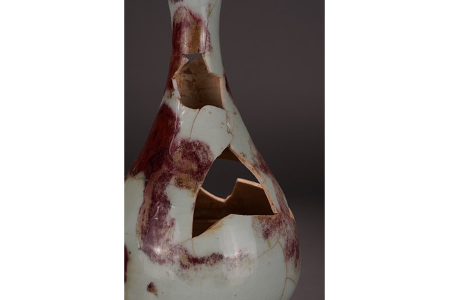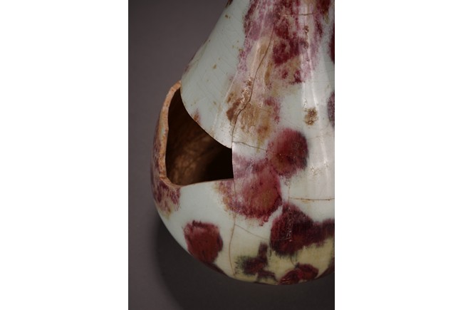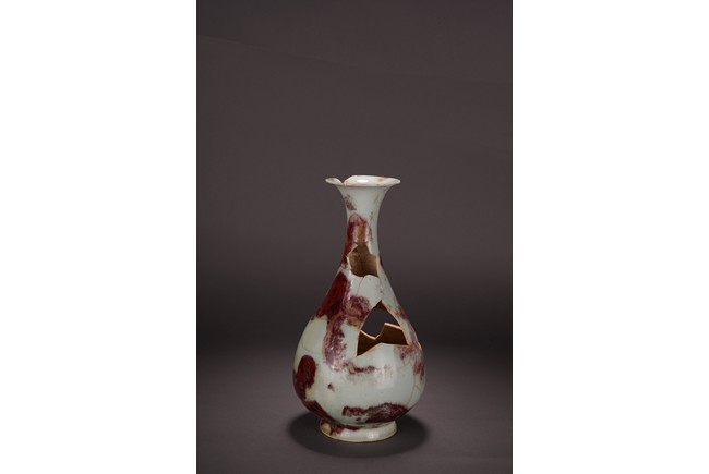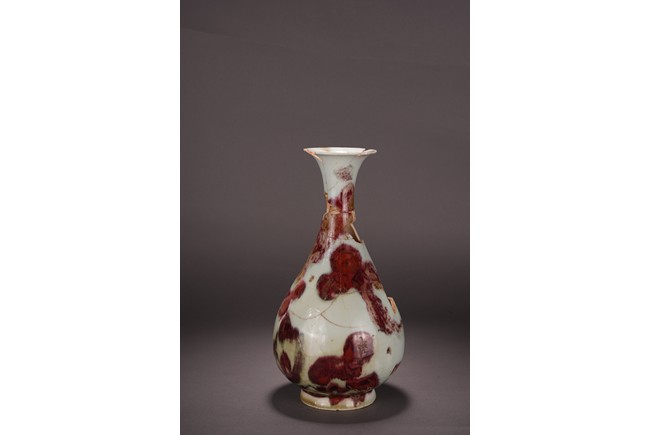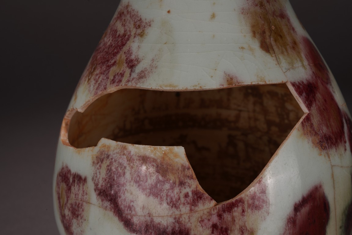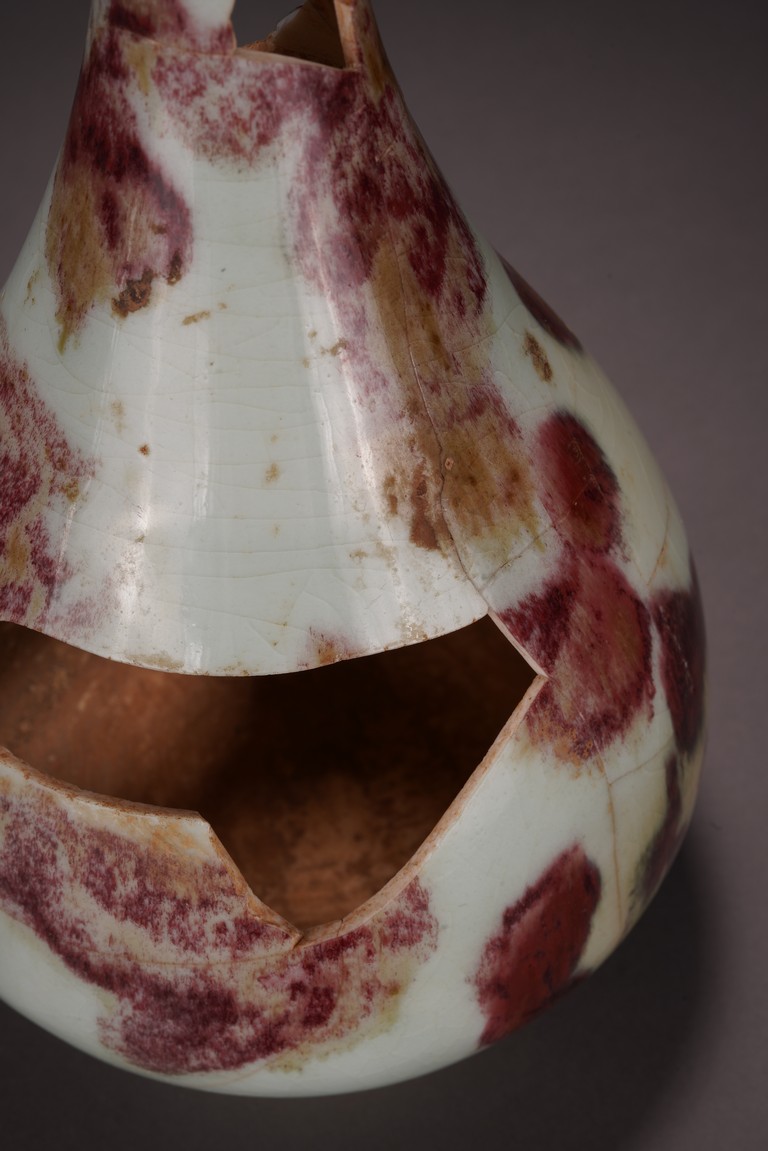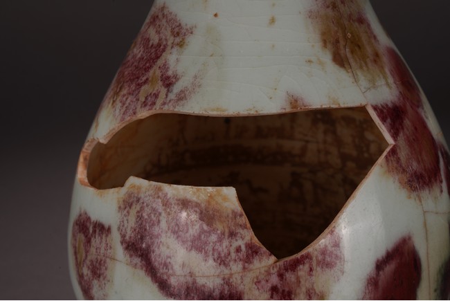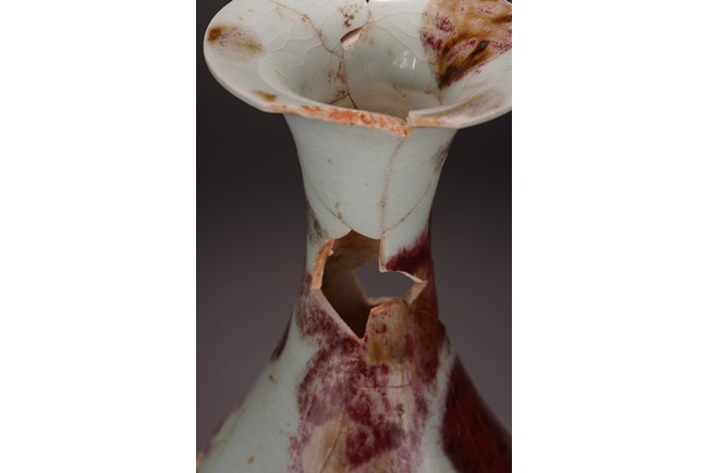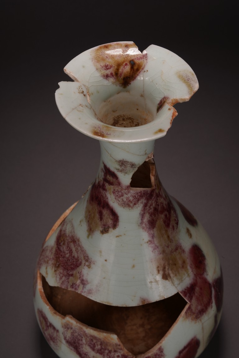 The gently rounded sides rising from a spreading foot to a waisted neck and everted rim, applied overall with a lustrous lavender-blue glaze embellished with purplish-red splashes on the body and neck, with extensive restorations. Song Dynasty period.