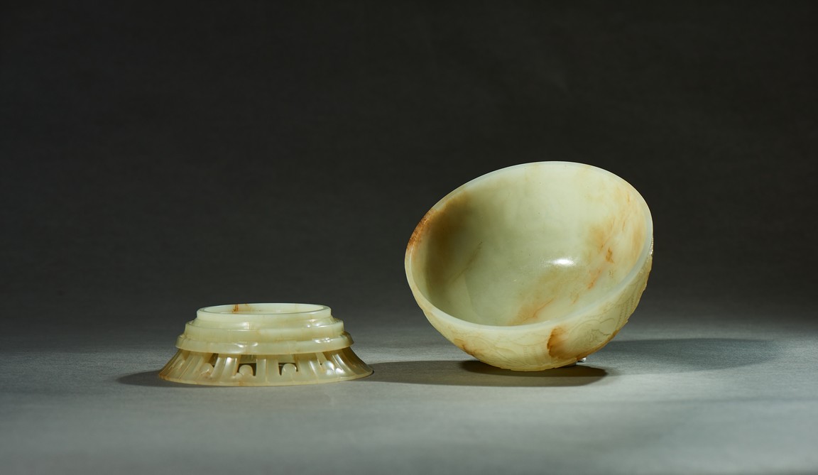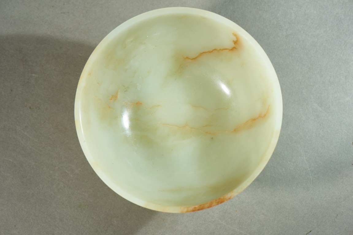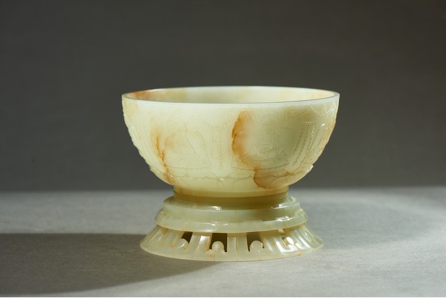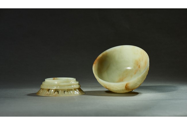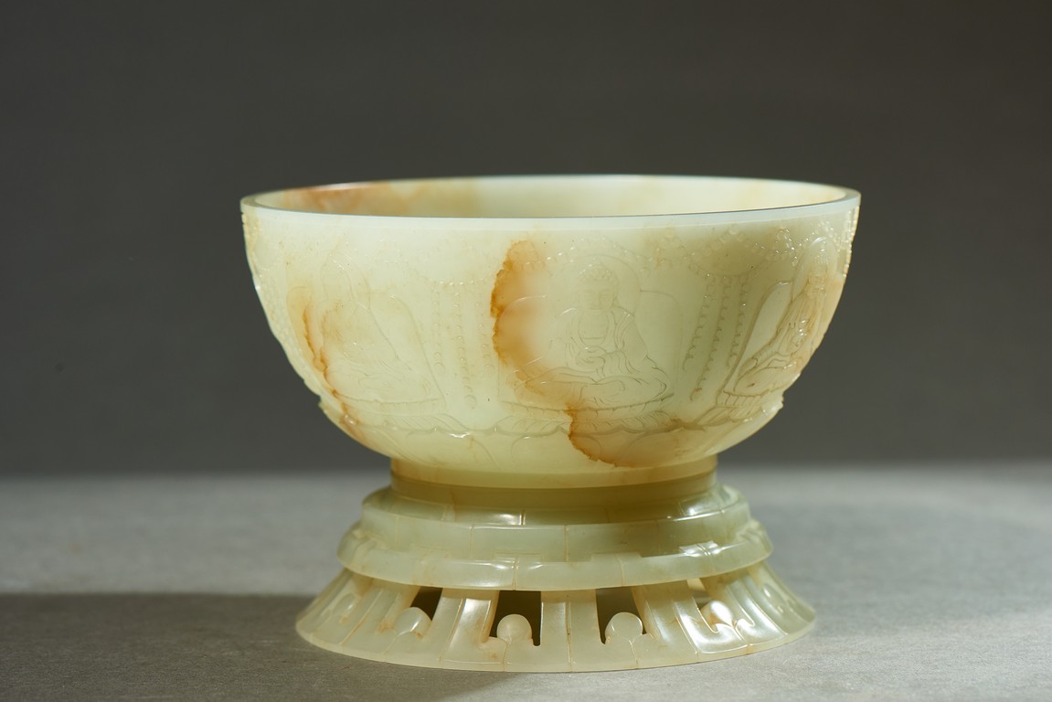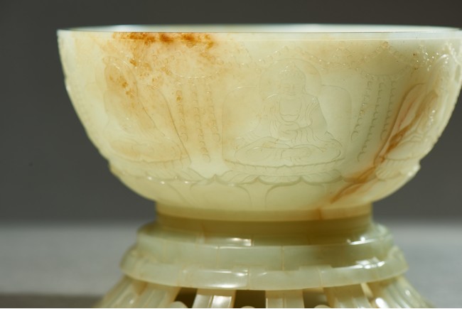 The bowl of deep sides from straight foot, the exterior carved in relief with seated buddha on lotus stand in each patel, all supported on fitted stand with spreading foot carved in the form of openwork lotus petals. The stone is of celadon white tone with russet veins and inclusions.