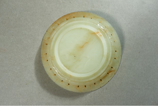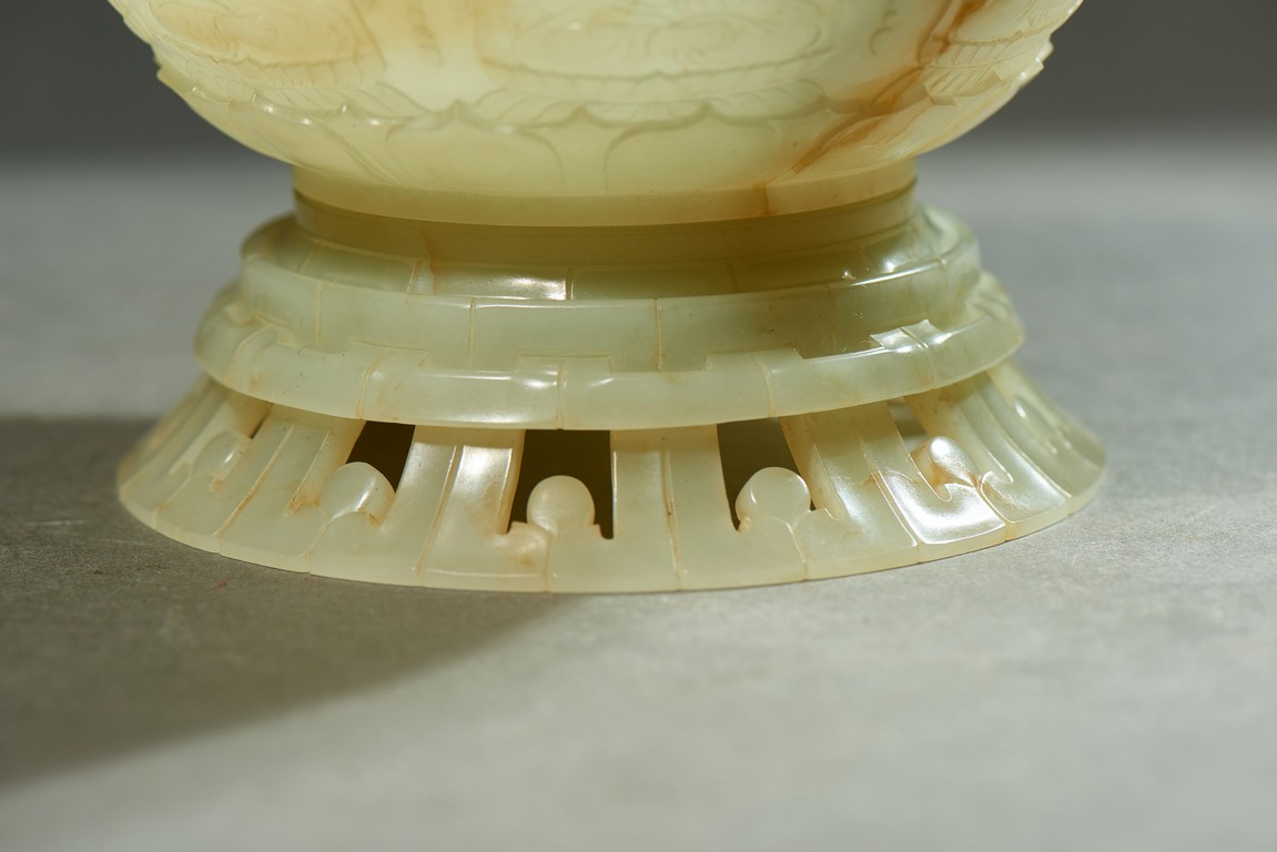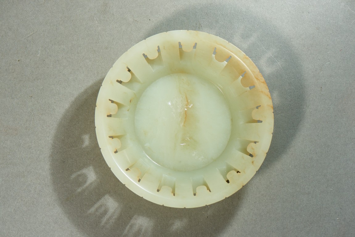 此鉢白玉材質,溫潤光瑩。敞口,腹部下收,圈足。用刀犀利,渾然天成,浮雕七佛坐像,精巧雅緻,惟妙惟肖。據《長阿含經》卷一記載,指釋迦牟尼佛之前有六位佛陀, 他們是毘婆屍佛、屍棄佛、毘舍浮佛、拘留孫佛、拘那含牟尼佛、迦葉佛,加上釋迦牟尼佛,通稱「過去七佛」。此鉢選料珍稀,雕工精美,造型別緻,拋光精細,帶有原配鏤空底座,實屬難得。