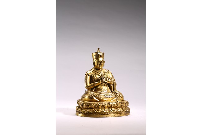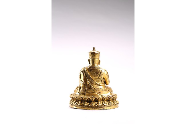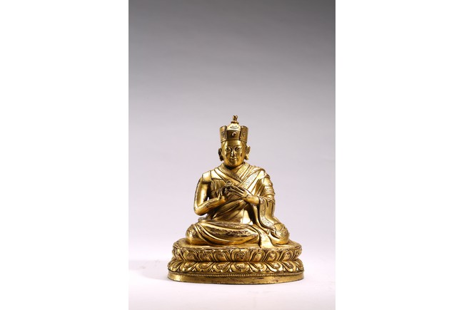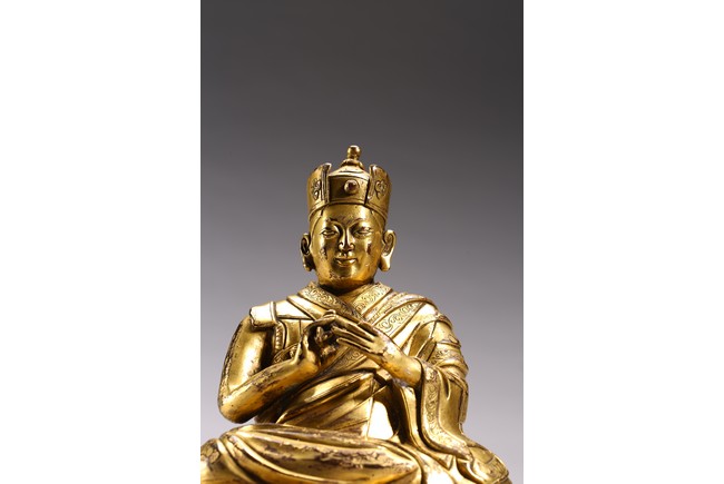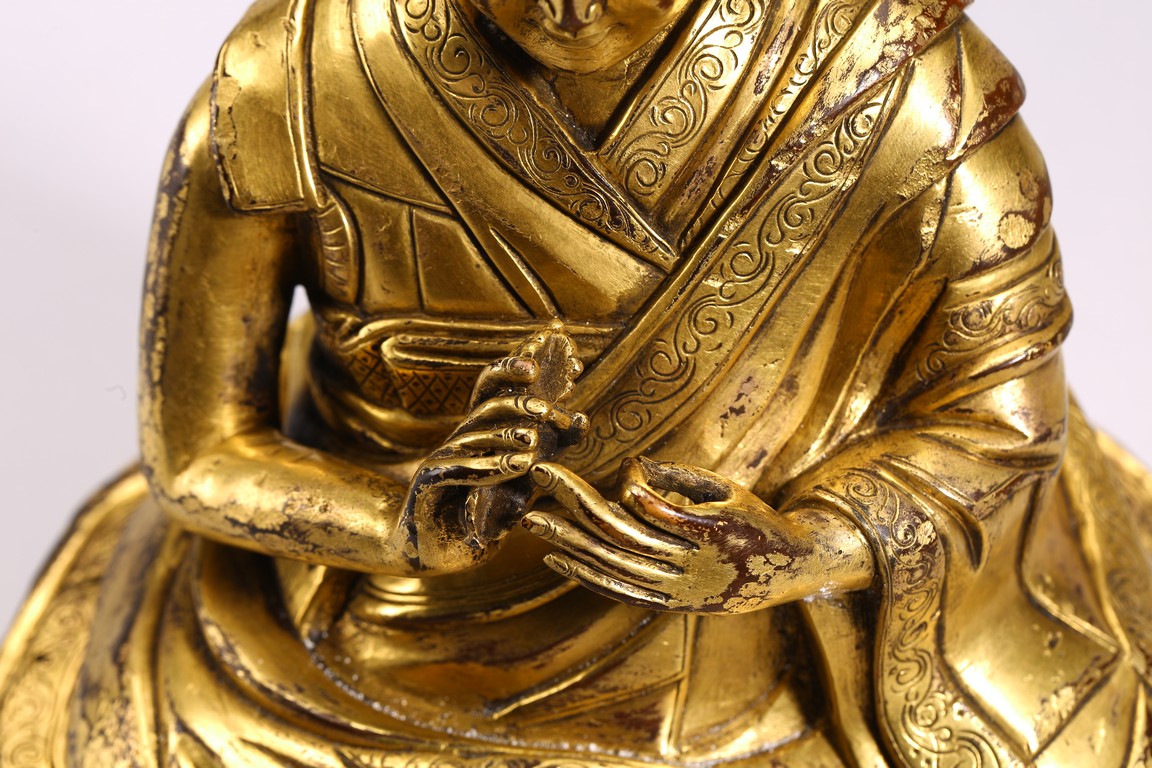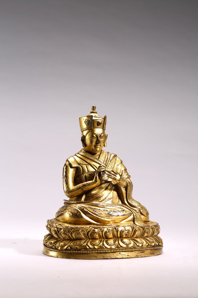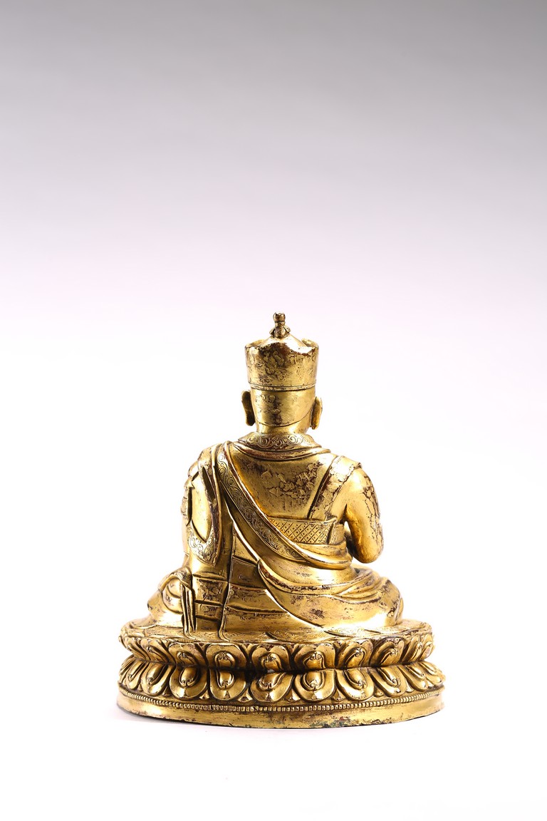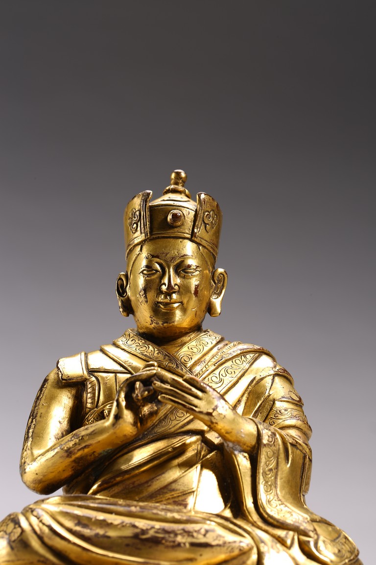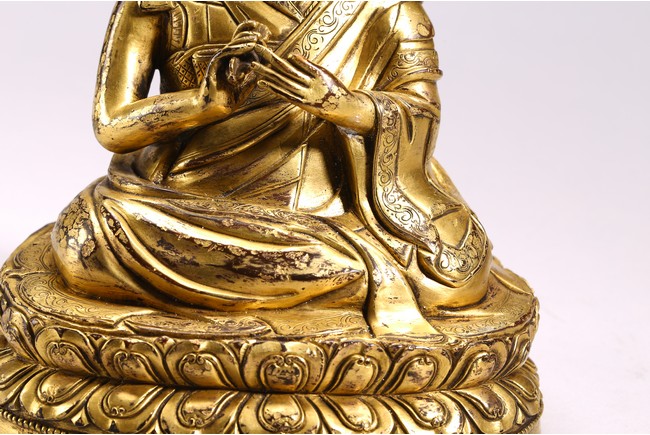 The lama seated on a double lotus throne, the hands raised in dharmachakra mudra, wearing upper and lower robes incised with a foliate motif, the facial expression rendered serene with a gentle smile and wearing a hat, the base sealed. Qing Dynasty period.