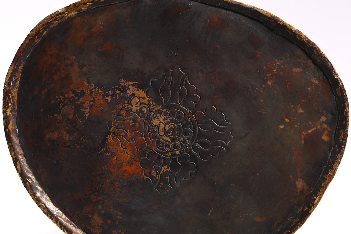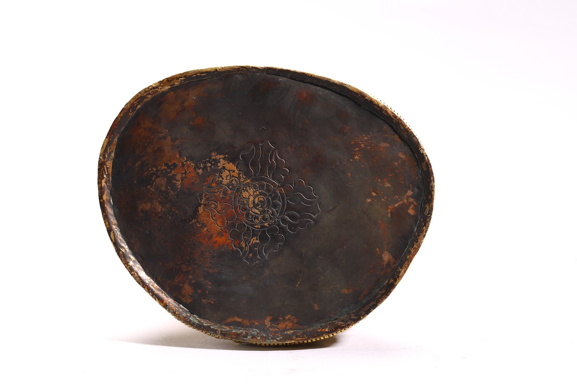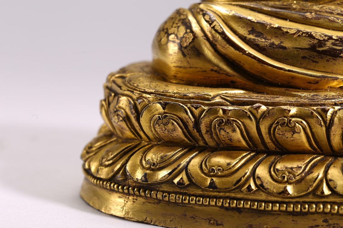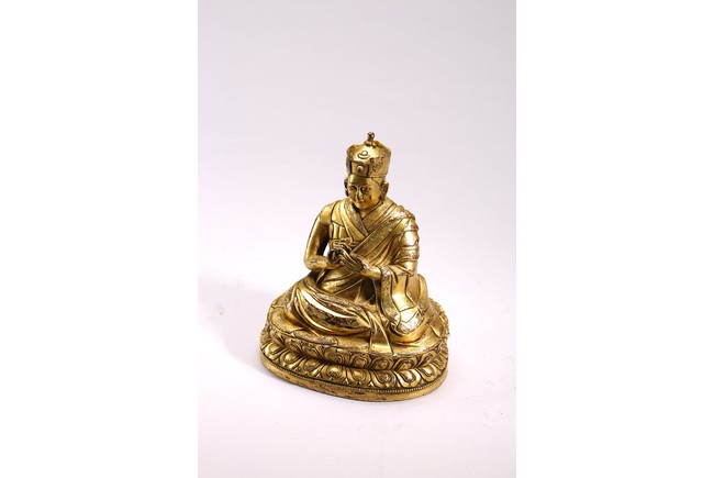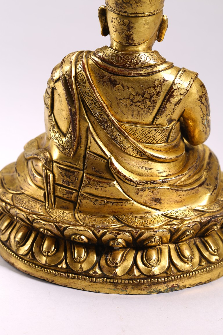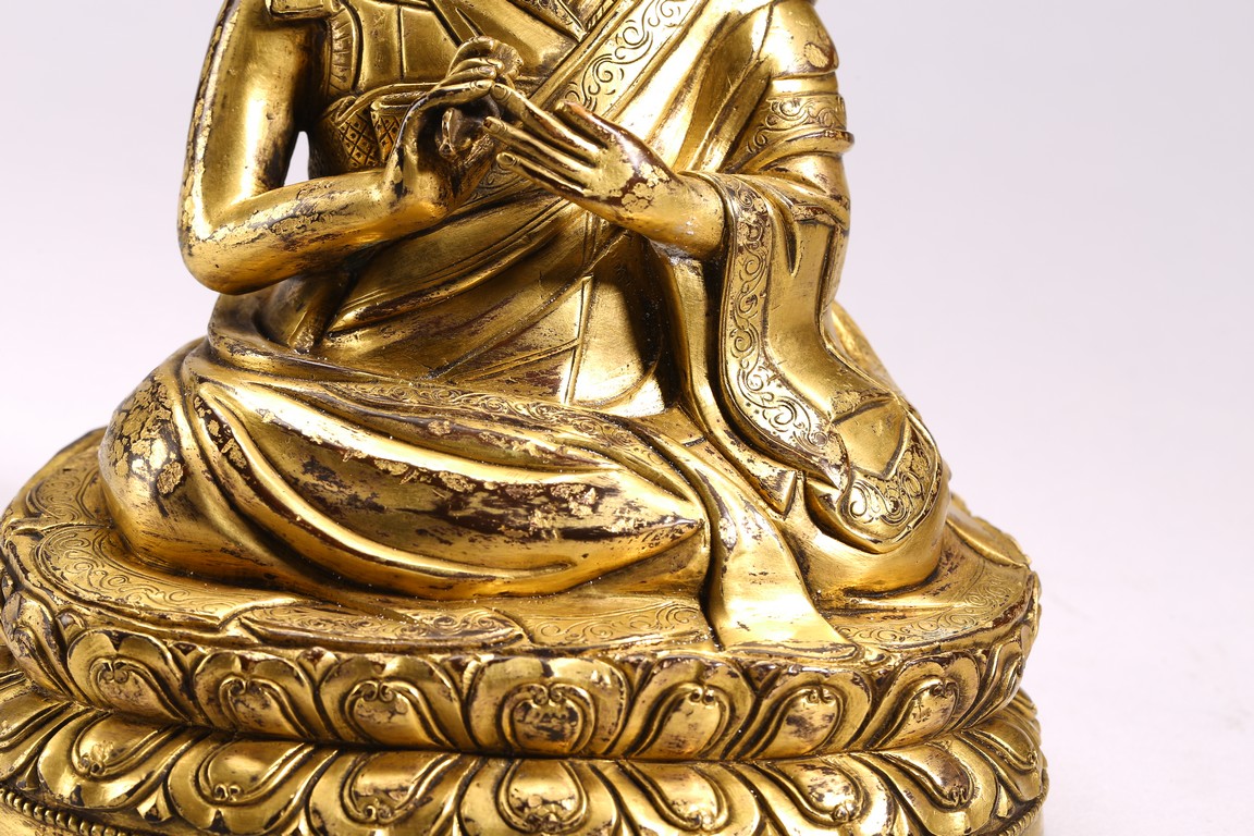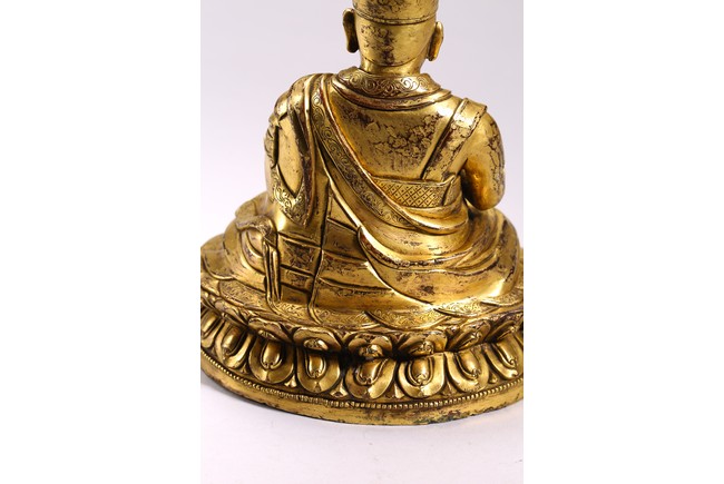 The lama seated on a double lotus throne, the hands raised in dharmachakra mudra, wearing upper and lower robes incised with a foliate motif, the facial expression rendered serene with a gentle smile and wearing a hat, the base sealed. Qing Dynasty period.