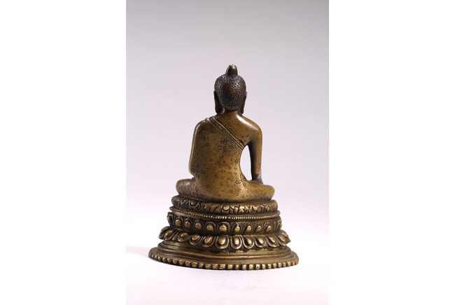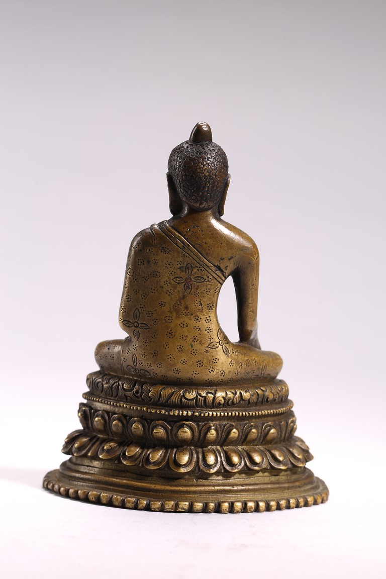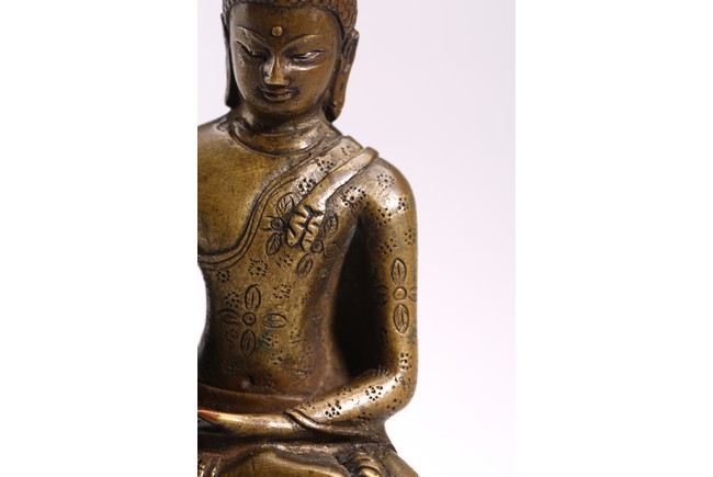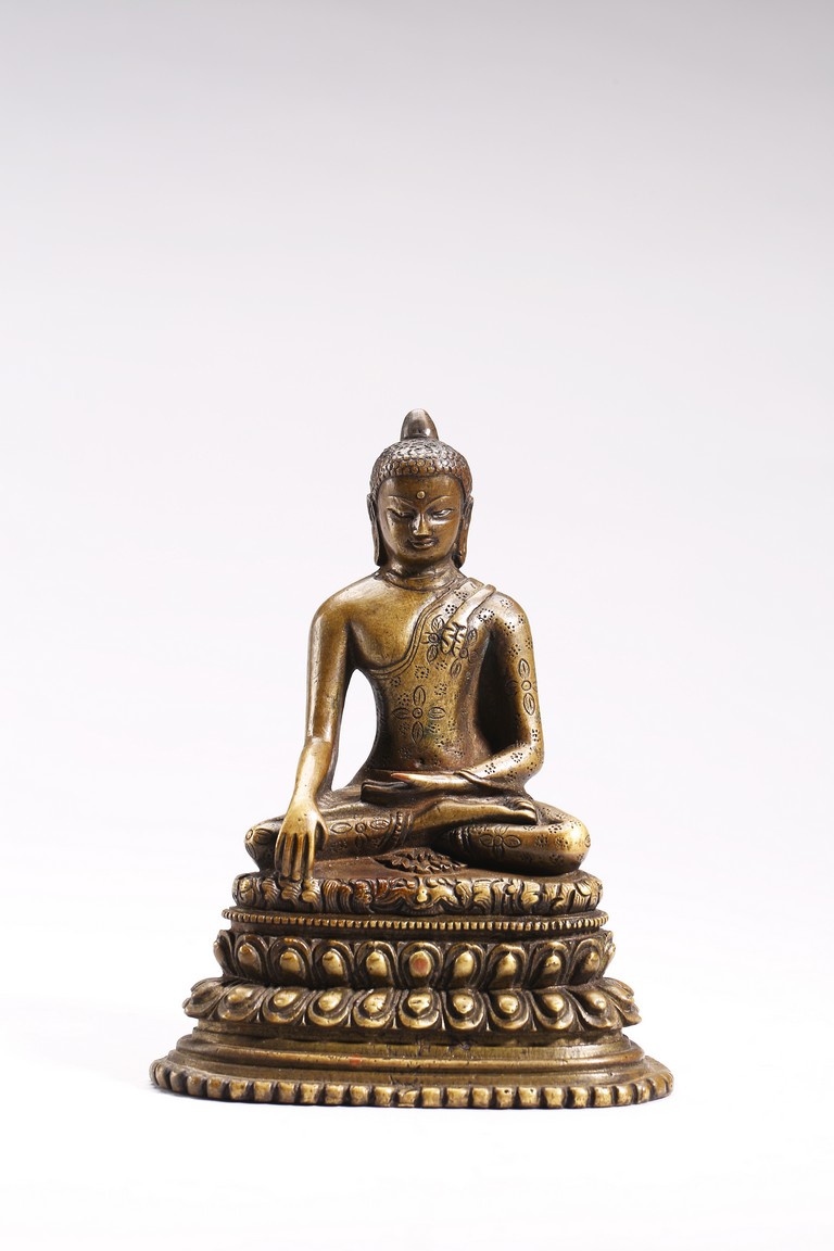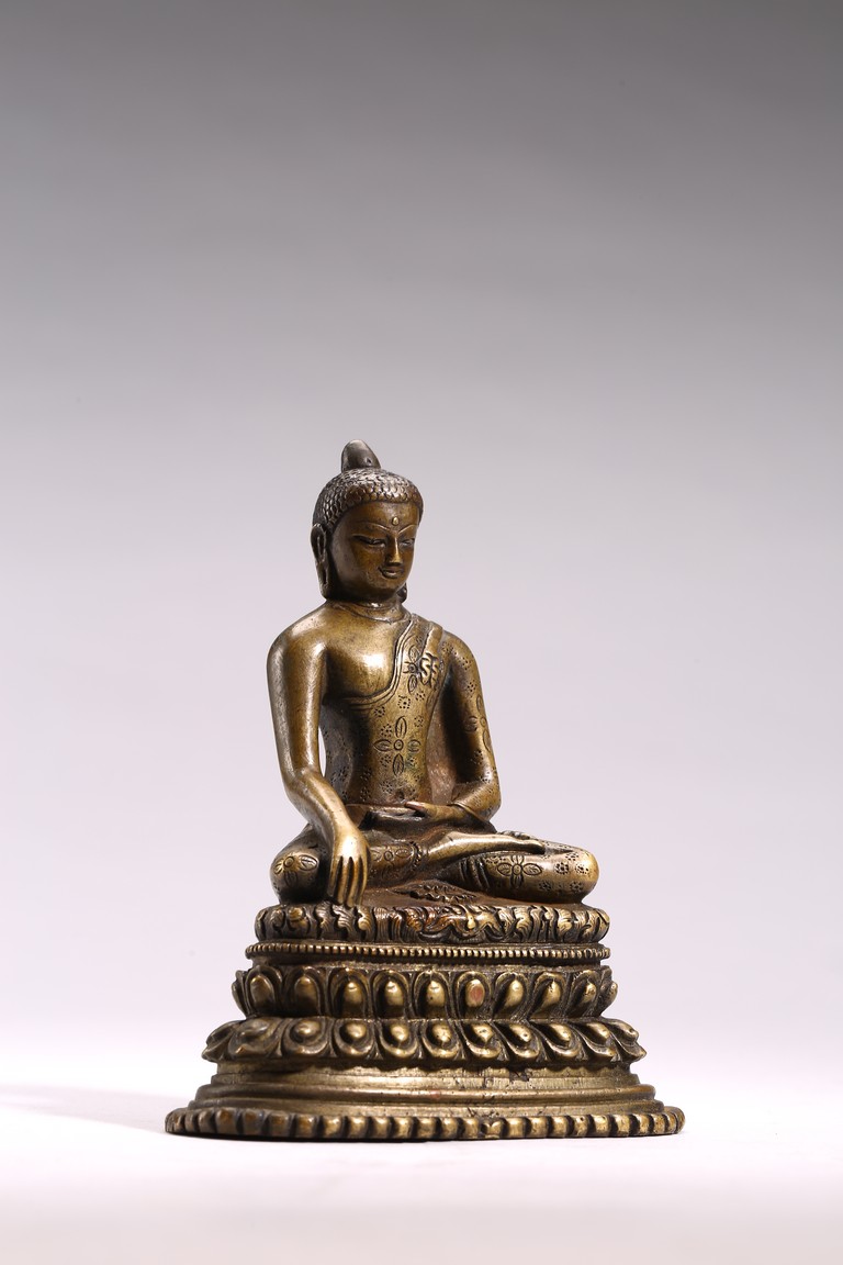 The deity seated in dhyanasana upon cushion atop double lotus throne with his left hand gently placed in bhumisparsa mudra and his right hand actively in dhyana mudra, his articulated features including heavily incised eyebrows and almond shaped eyes, with weighted elongated earlobes, in a relaxed smile, the hair arranged in tight curls with a stupa-shaped ushnisha. Ming Dynasty period.