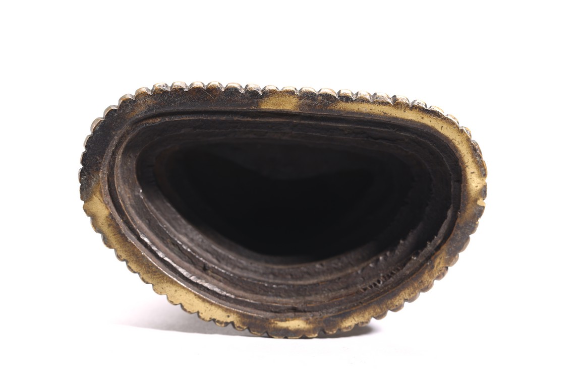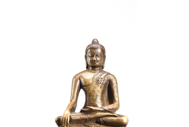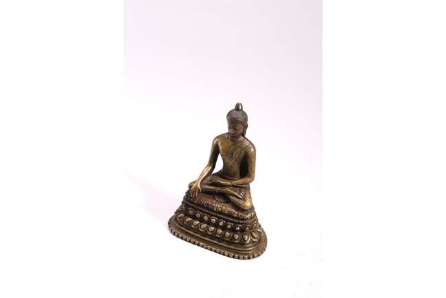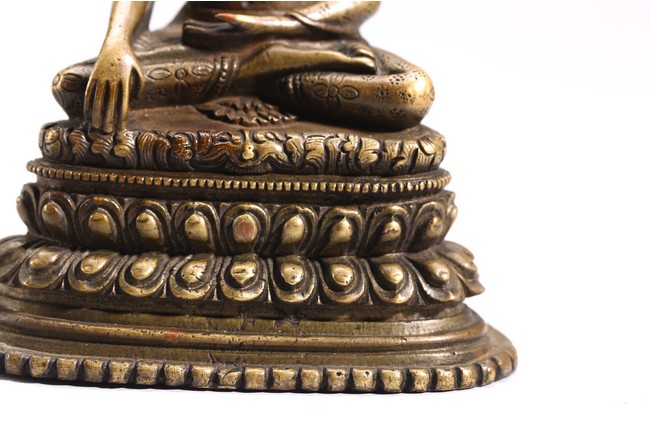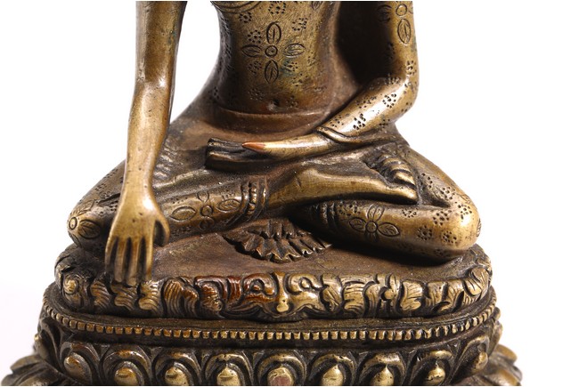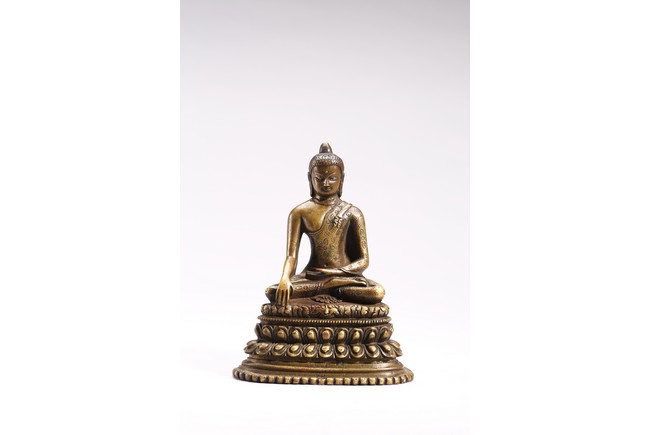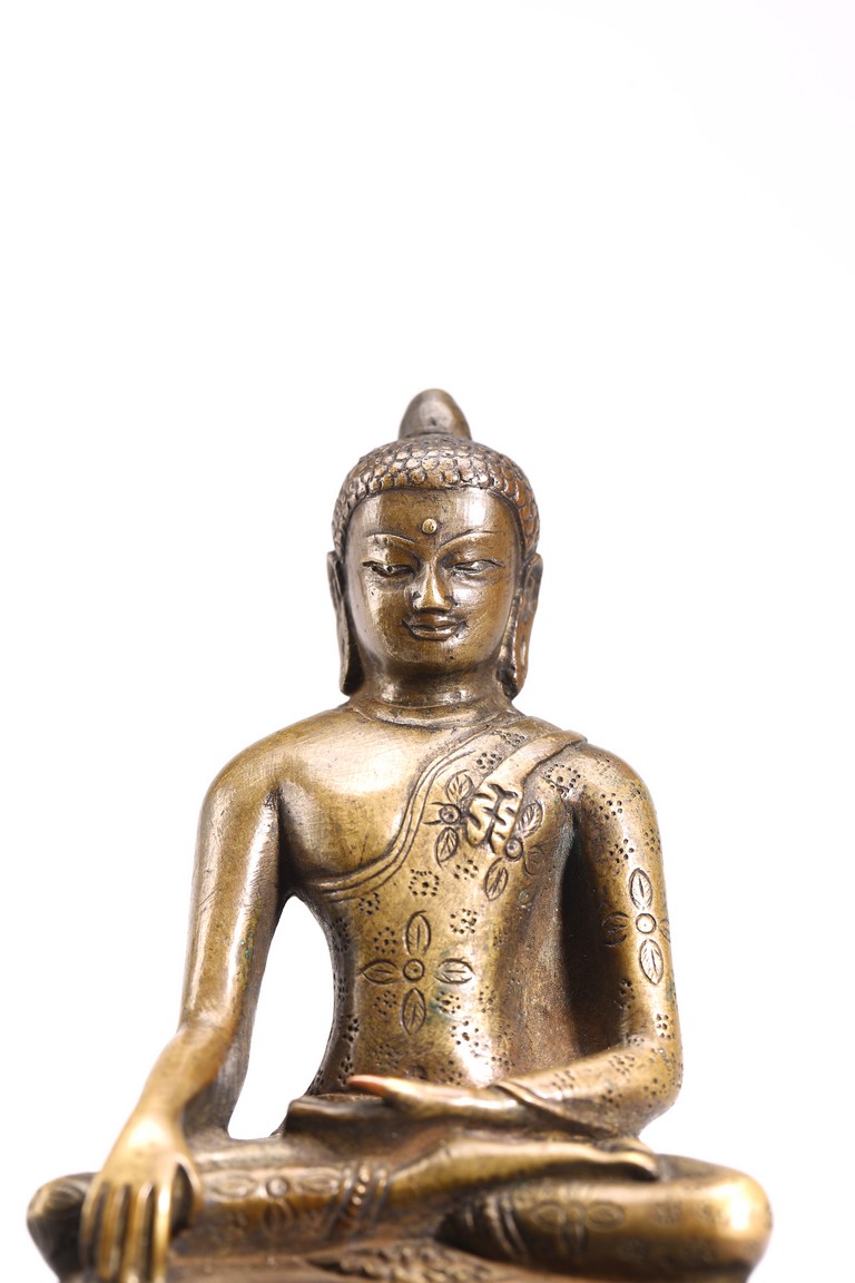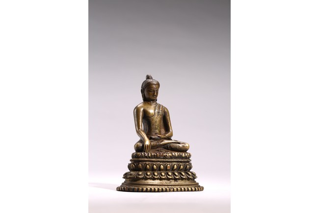The deity seated in dhyanasana upon cushion atop double lotus throne with his left hand gently placed in bhumisparsa mudra and his right hand actively in dhyana mudra, his articulated features including heavily incised eyebrows and almond shaped eyes, with weighted elongated earlobes, in a relaxed smile, the hair arranged in tight curls with a stupa-shaped ushnisha. Ming Dynasty period.