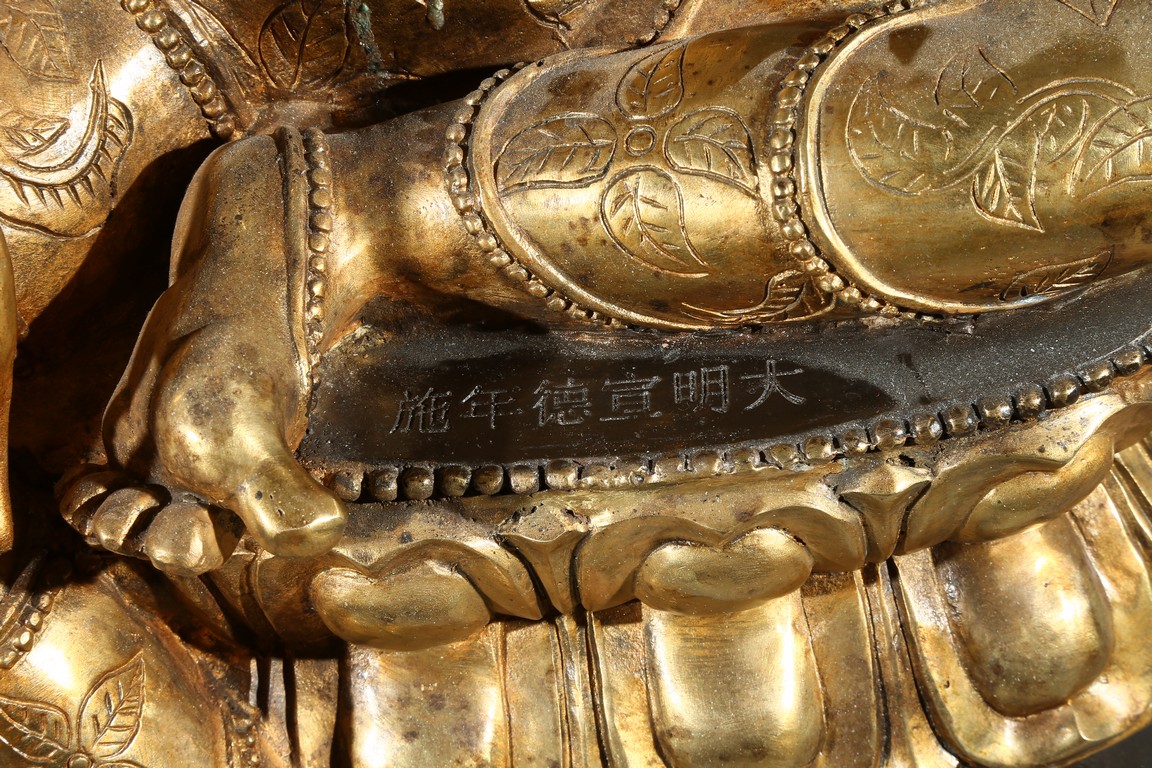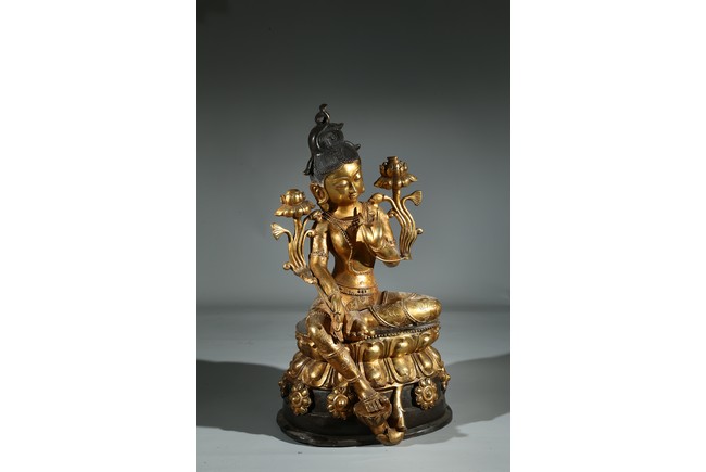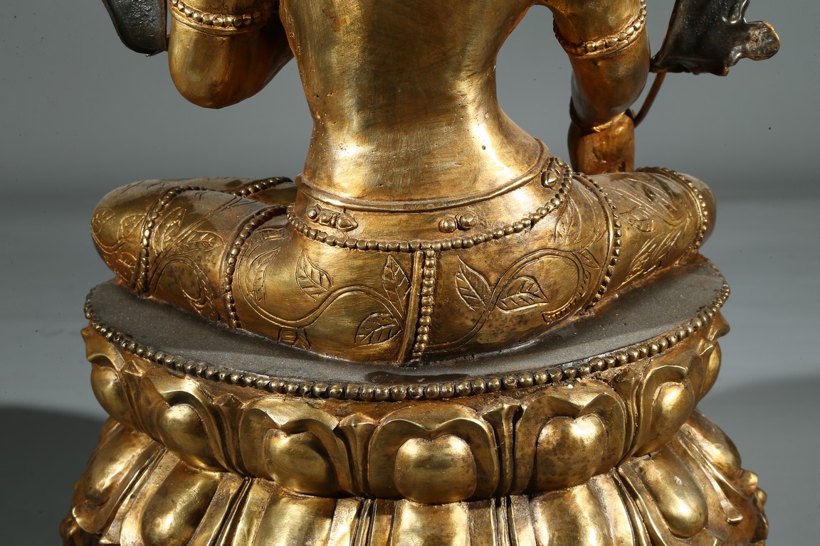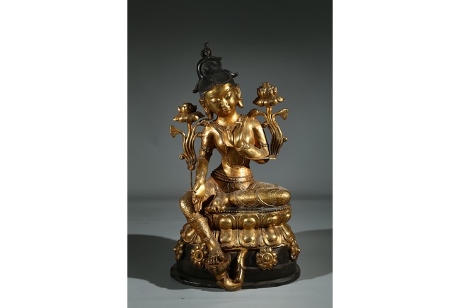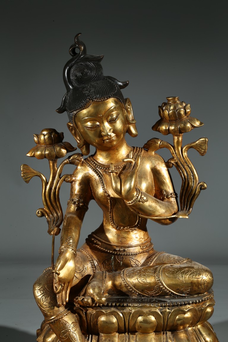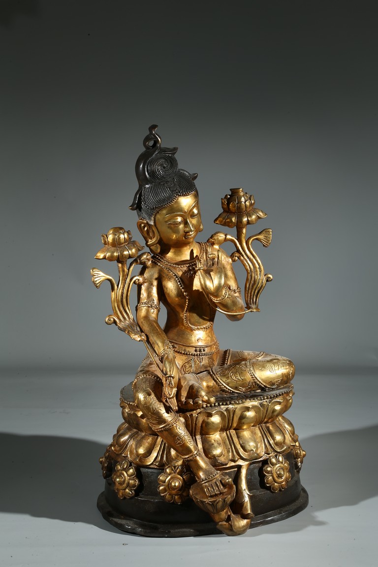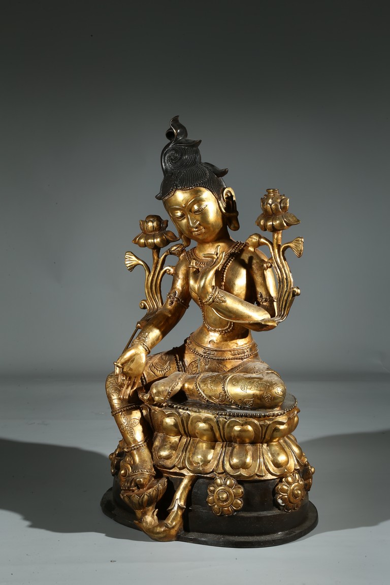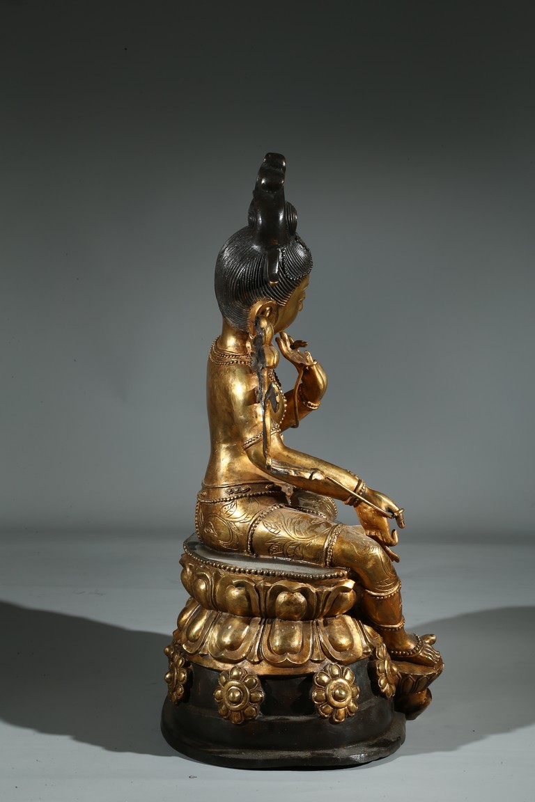 Cast seated in lalitasana on a double lotus base, the right hand lowered in varadamudra and the left raised to the chest, wearing dhoti and a beaded necklace, the face with downcast eyes and meditative expression, with apocryphal period mark.