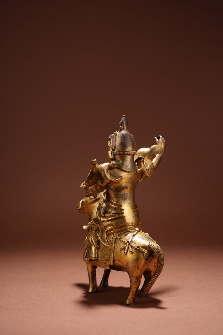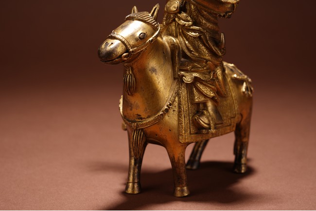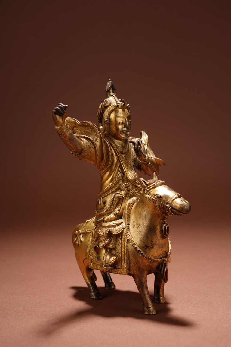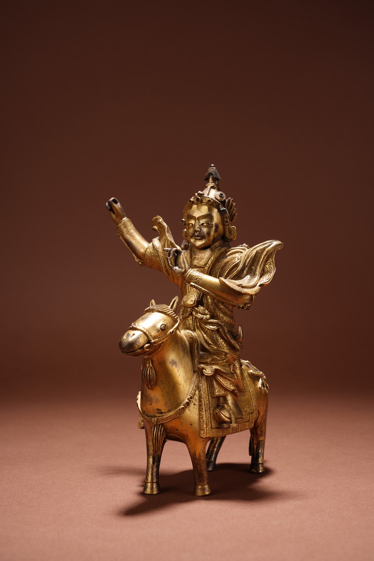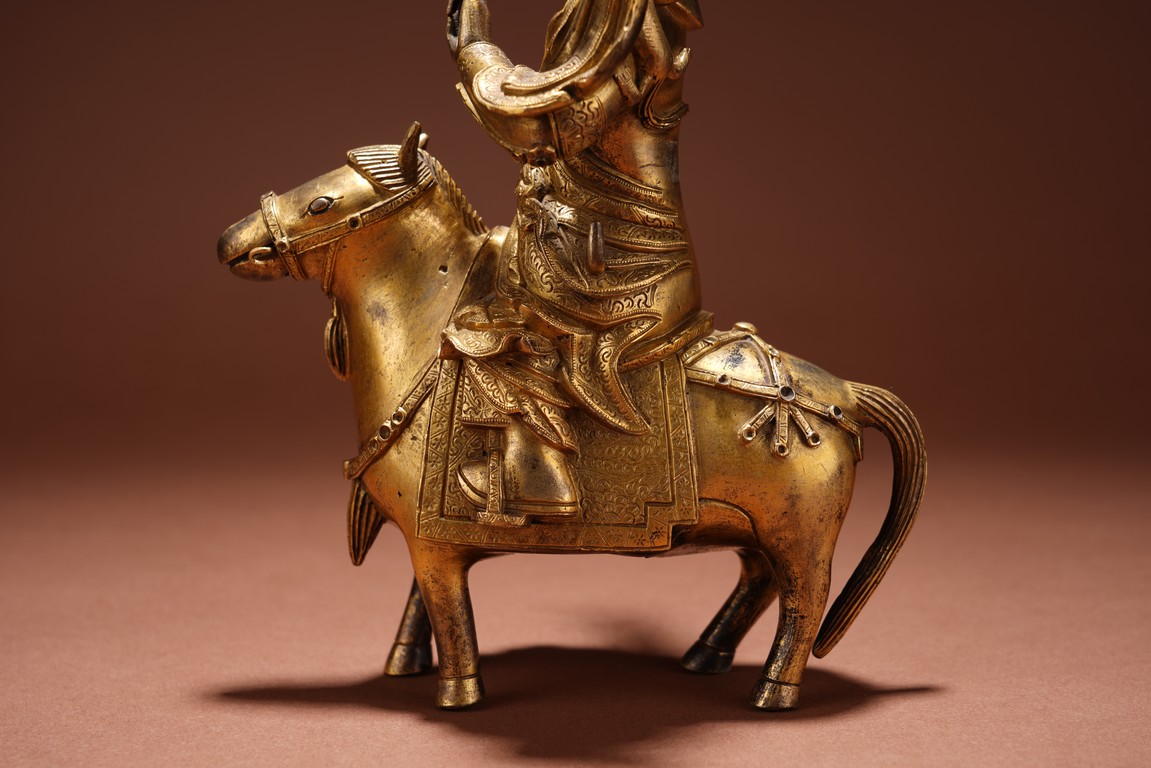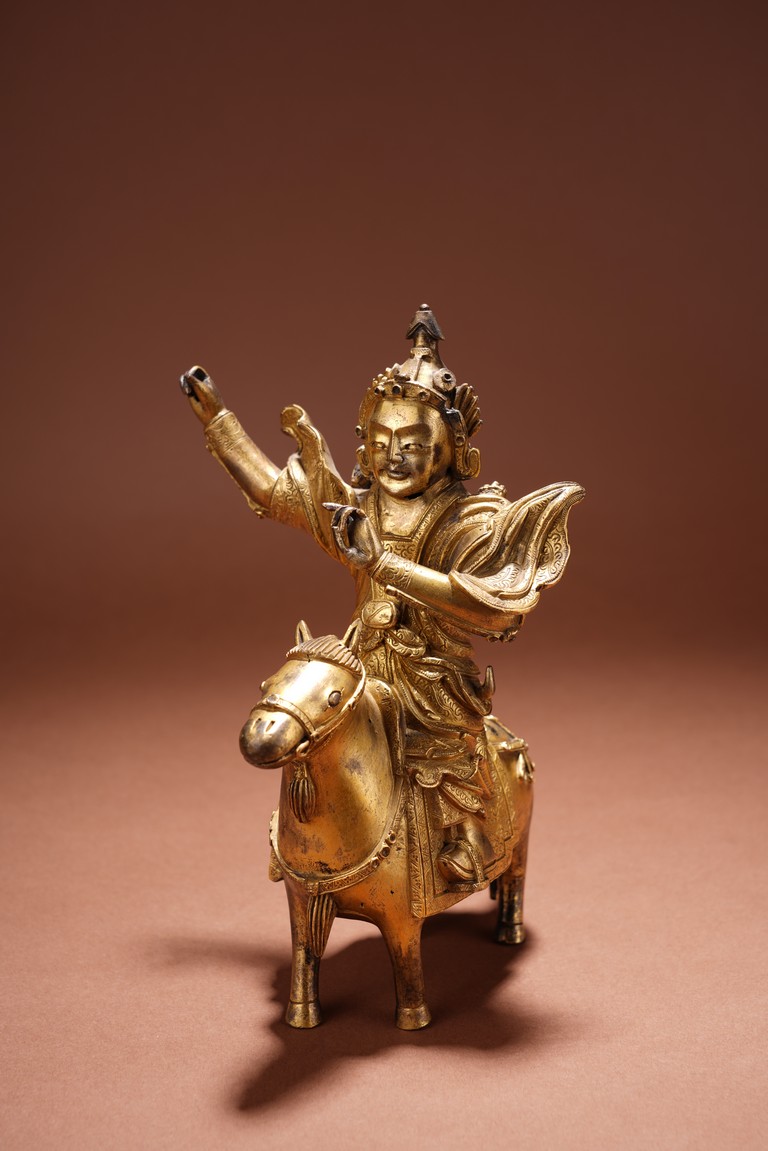 The deity shown wearing belted robe incised with floral decorations and seated astride a caparisoned horse, both hands raised in the air, the head wearing crown. Qing Dynasty period.