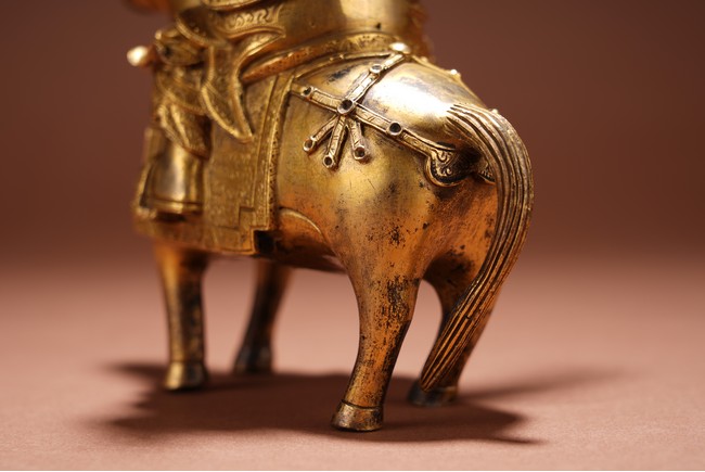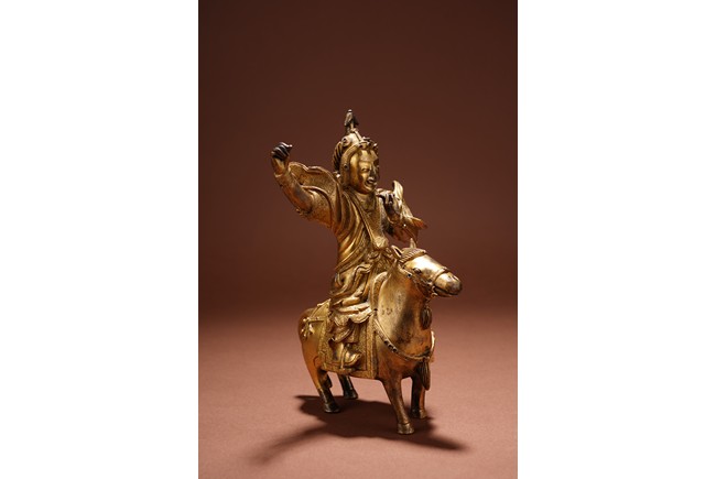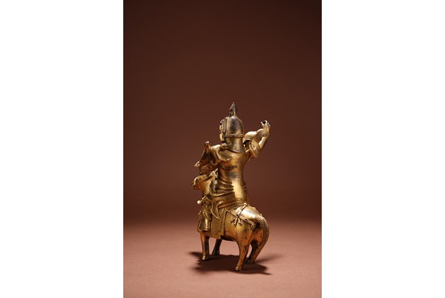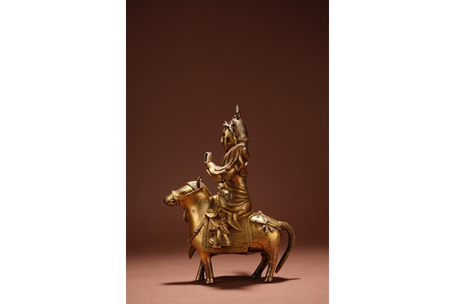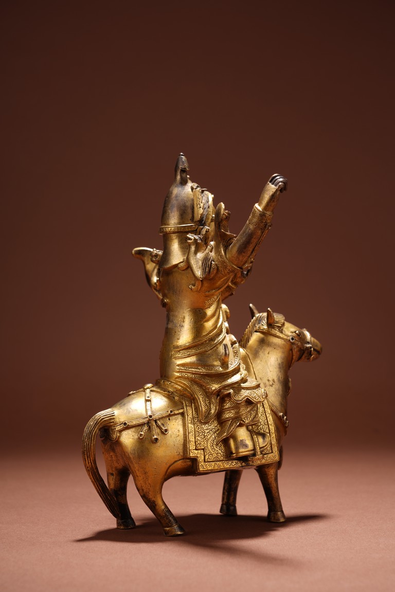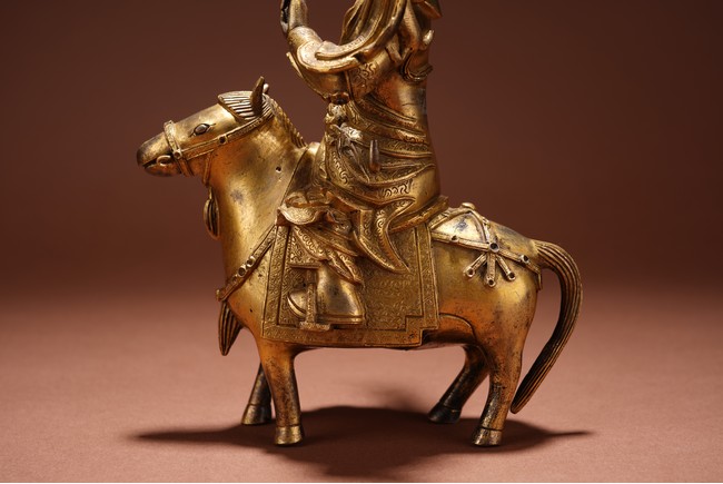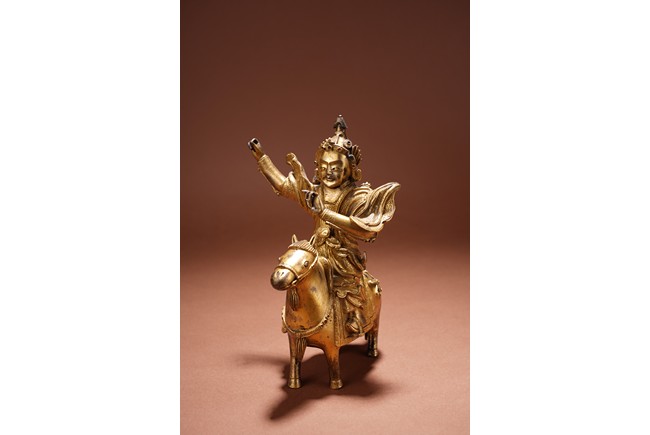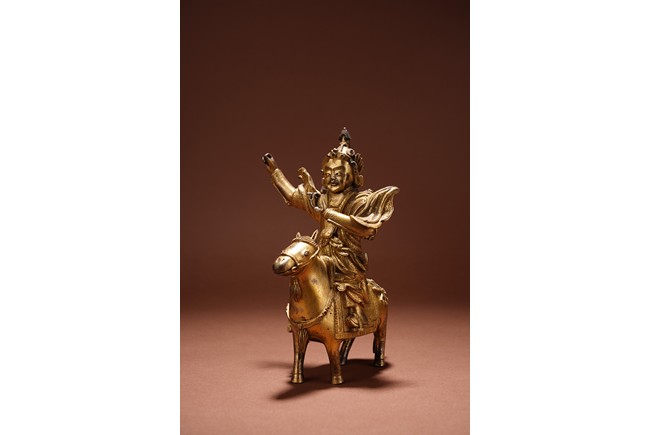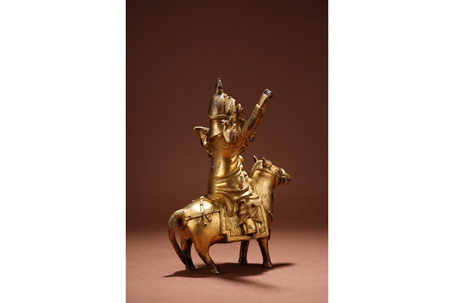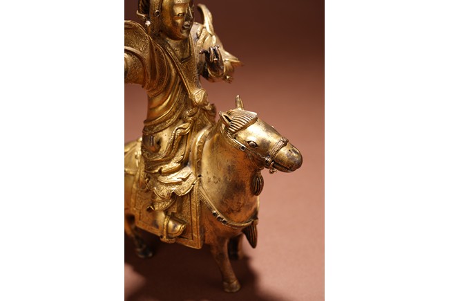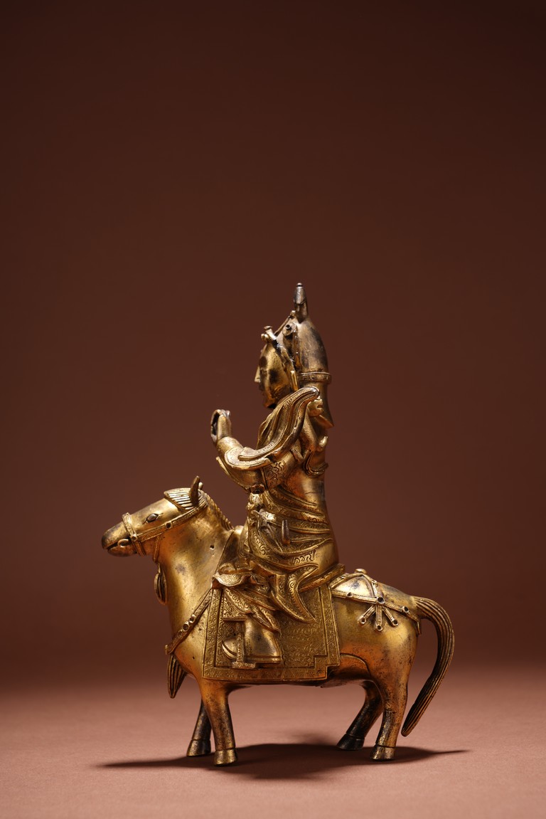 The deity shown wearing belted robe incised with floral decorations and seated astride a caparisoned horse, both hands raised in the air, the head wearing crown. Qing Dynasty period.