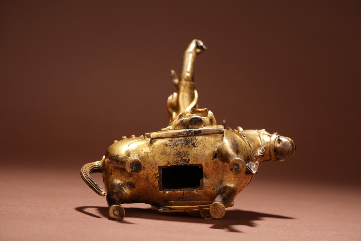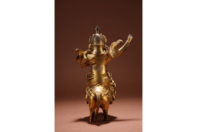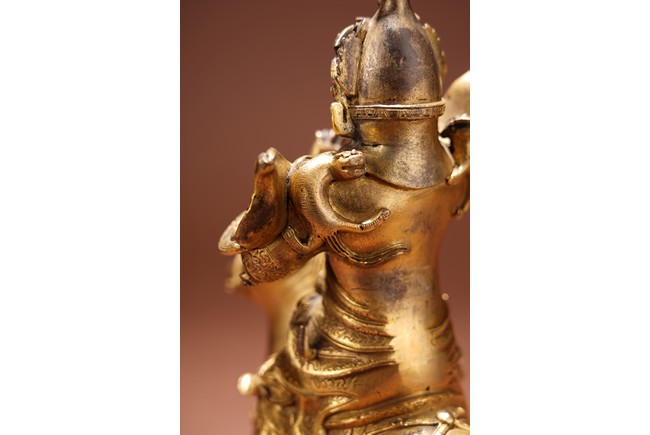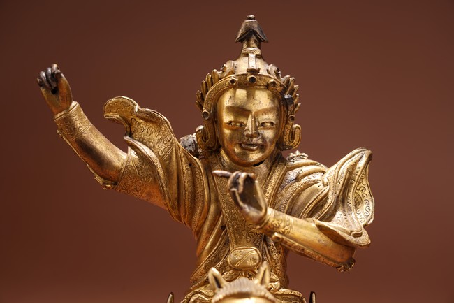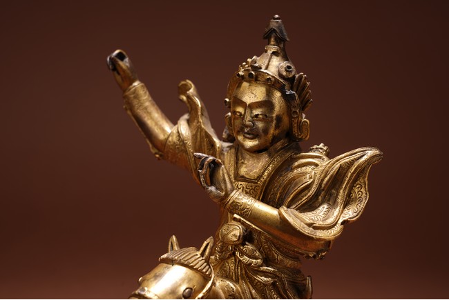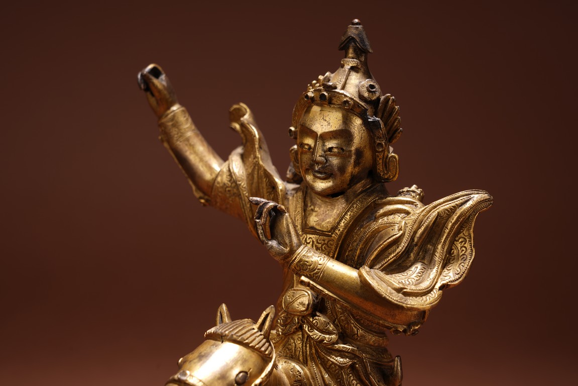 八駿財神,亦稱八路財神,為多聞天王之部屬。此相頭戴蒙古瓦楞式戰盔,頂飾元寶。身著鎧甲,足蹬戰靴。騎天馬,威風凜凜。其上下擺動的袍袖、繞臂穿肩向後飄拂的帛帶,與嘶鳴駿馬之奔姿相映成趣。八駿財屬財寶天王眷屬,同樣具有為供養者增福祿的功用。