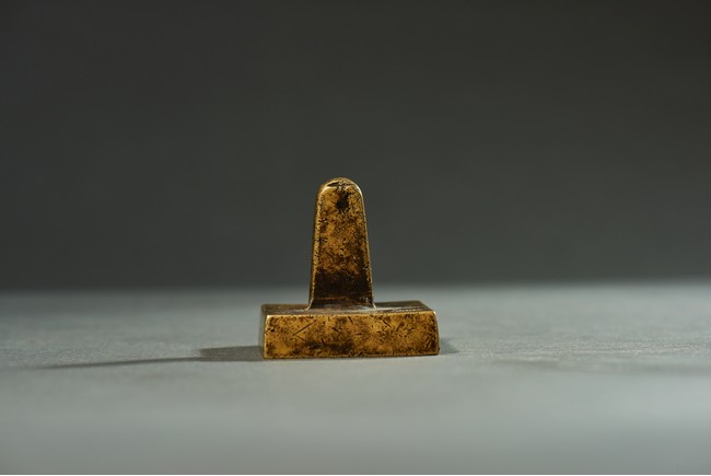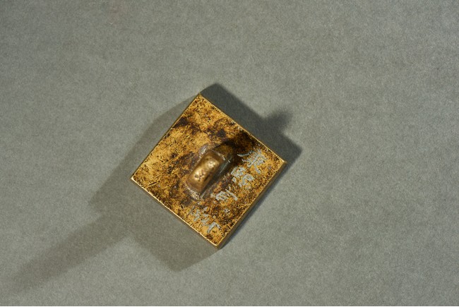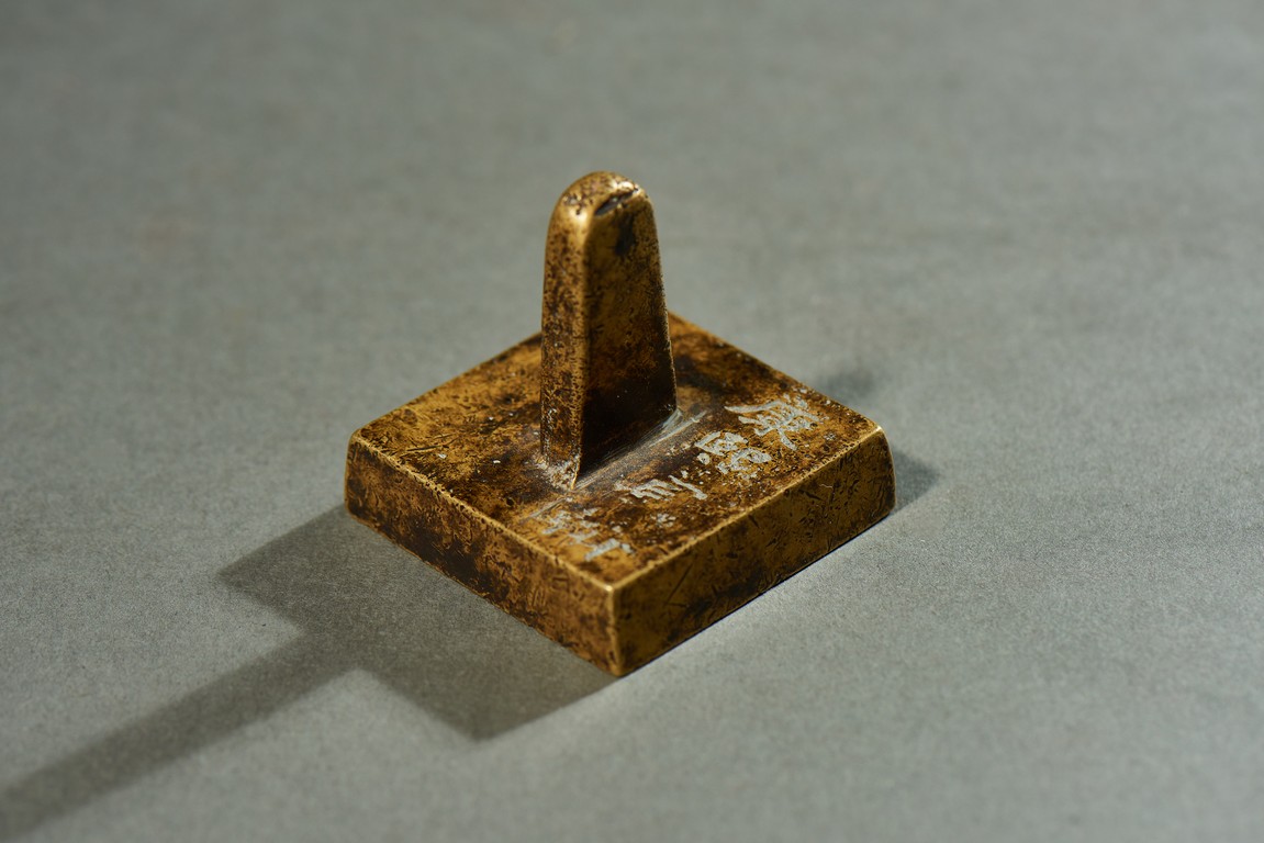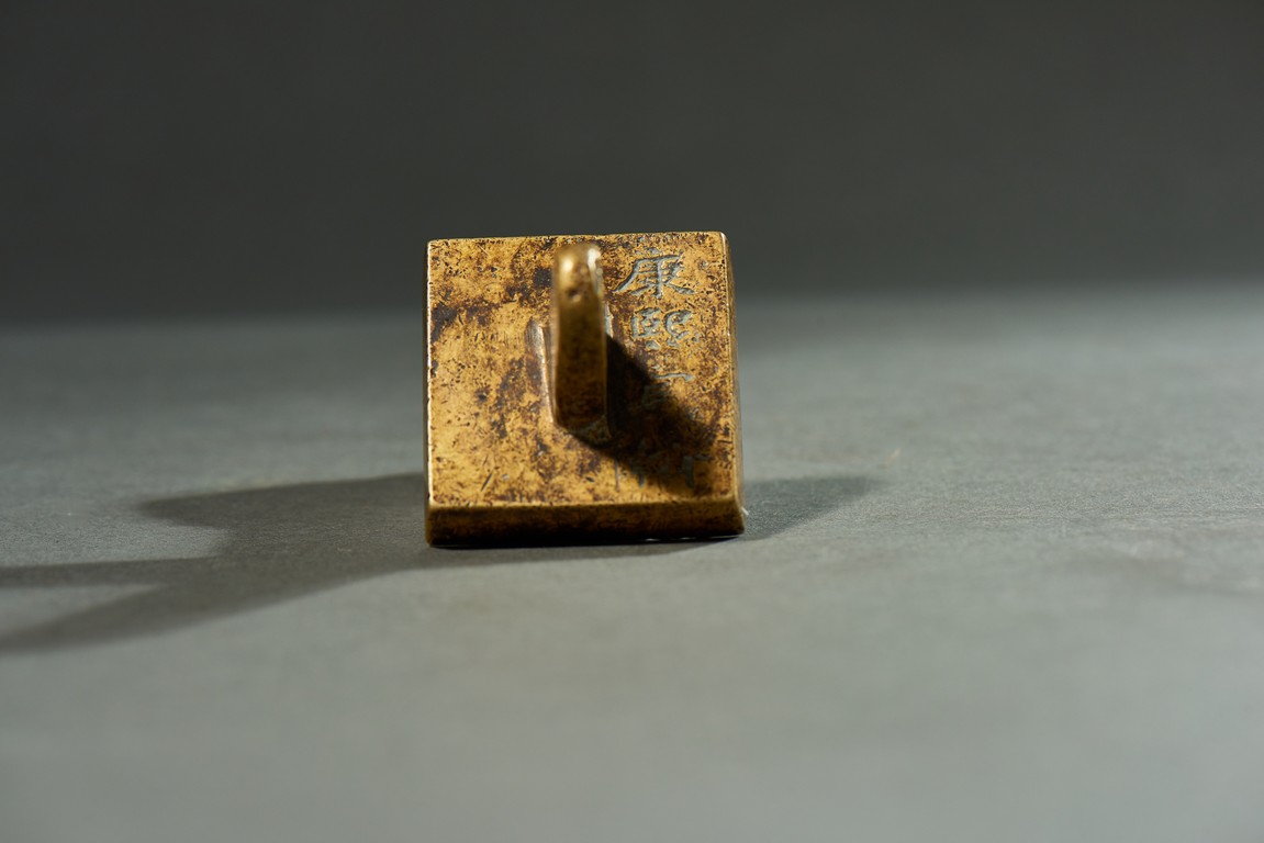 Of square form, top with inscription and surmounted with a tapering handle, seal base with four character.
