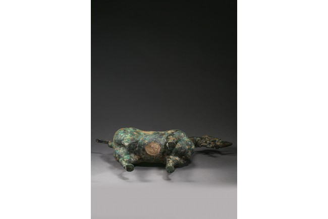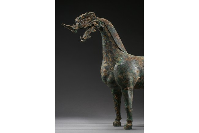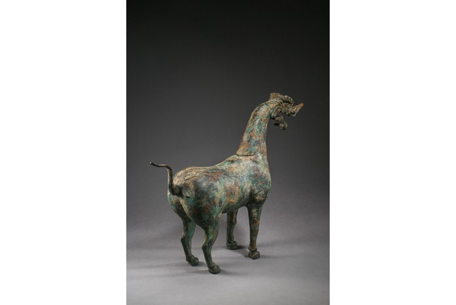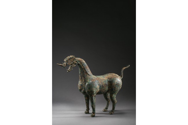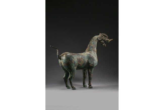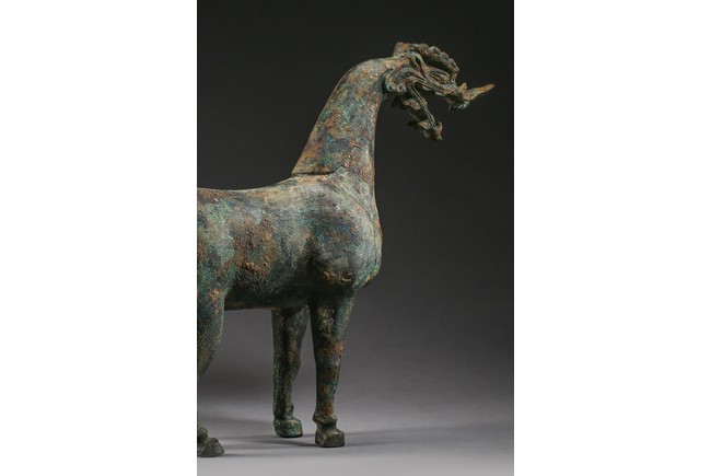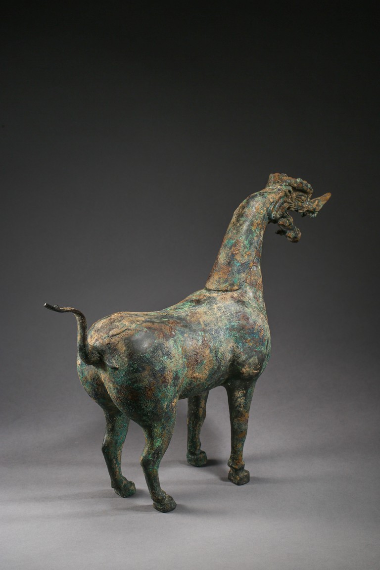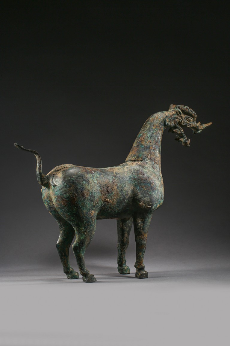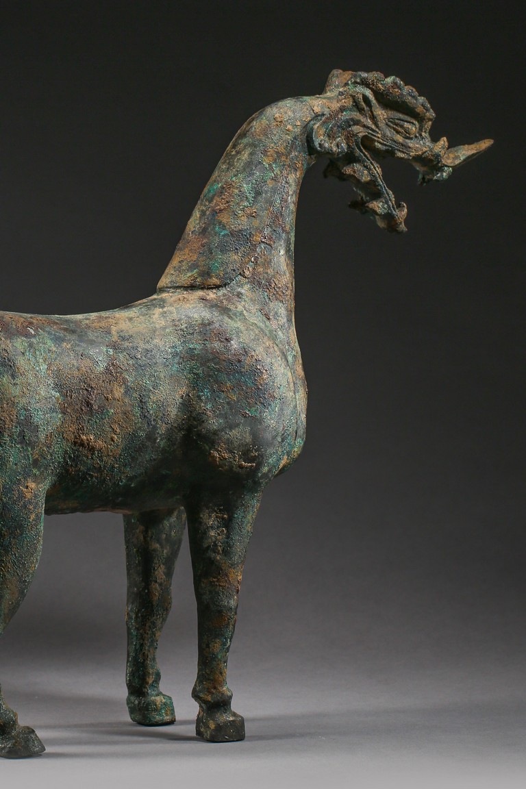 The mythical beast is modelled standing foursquare with its tail lifted in curve. The well-built body is supported on sturdy legs and the thick neck curves to support a well-defined 'dragon' head. The bronze has a green and russet patina and encrustation. Eastern Han Dynasty period.