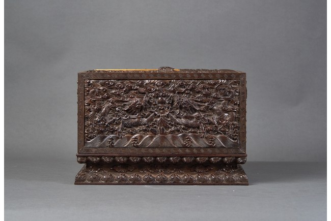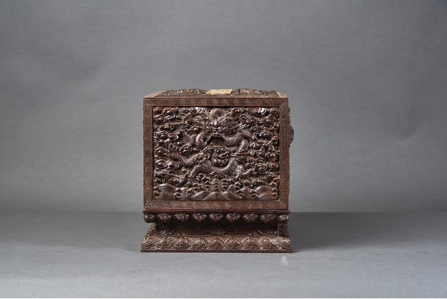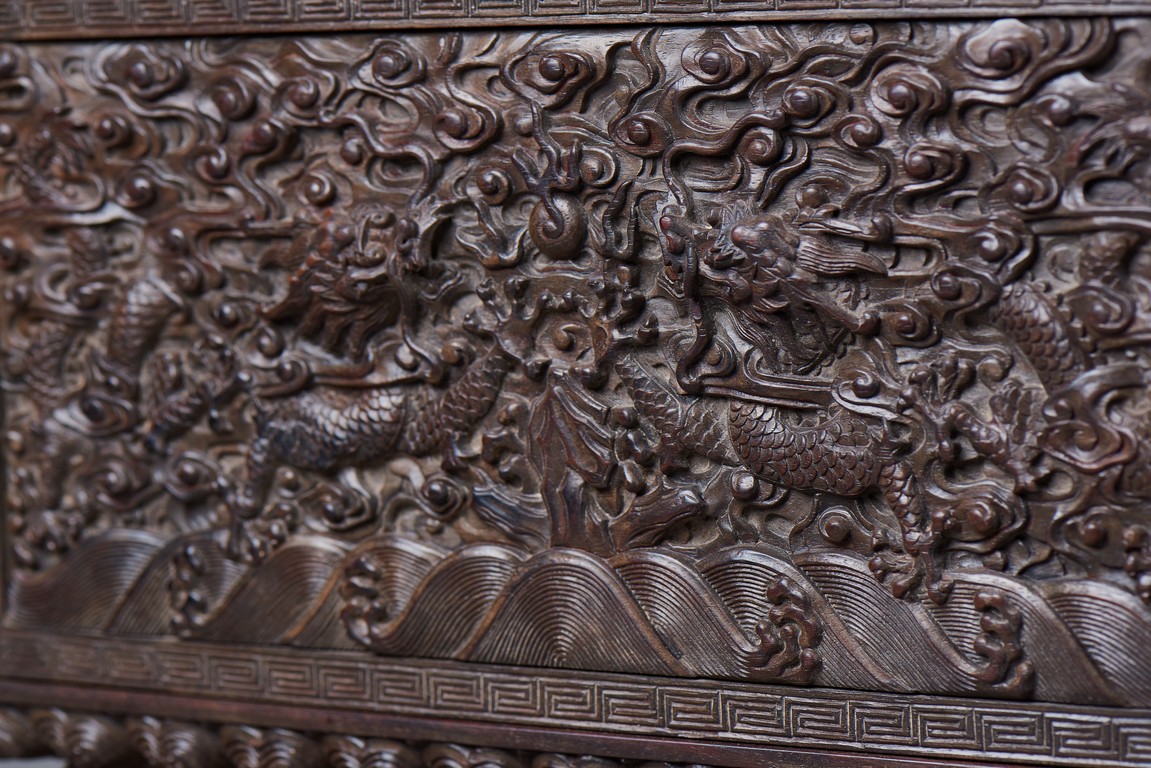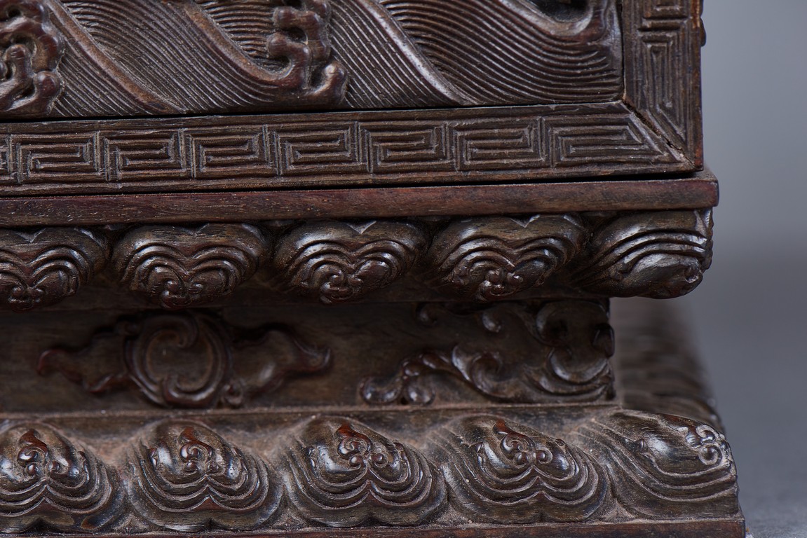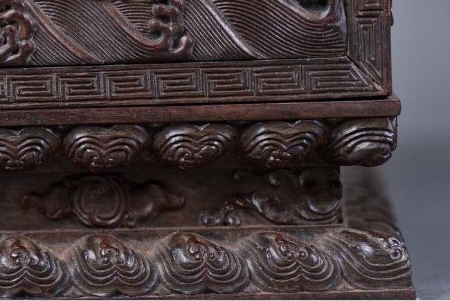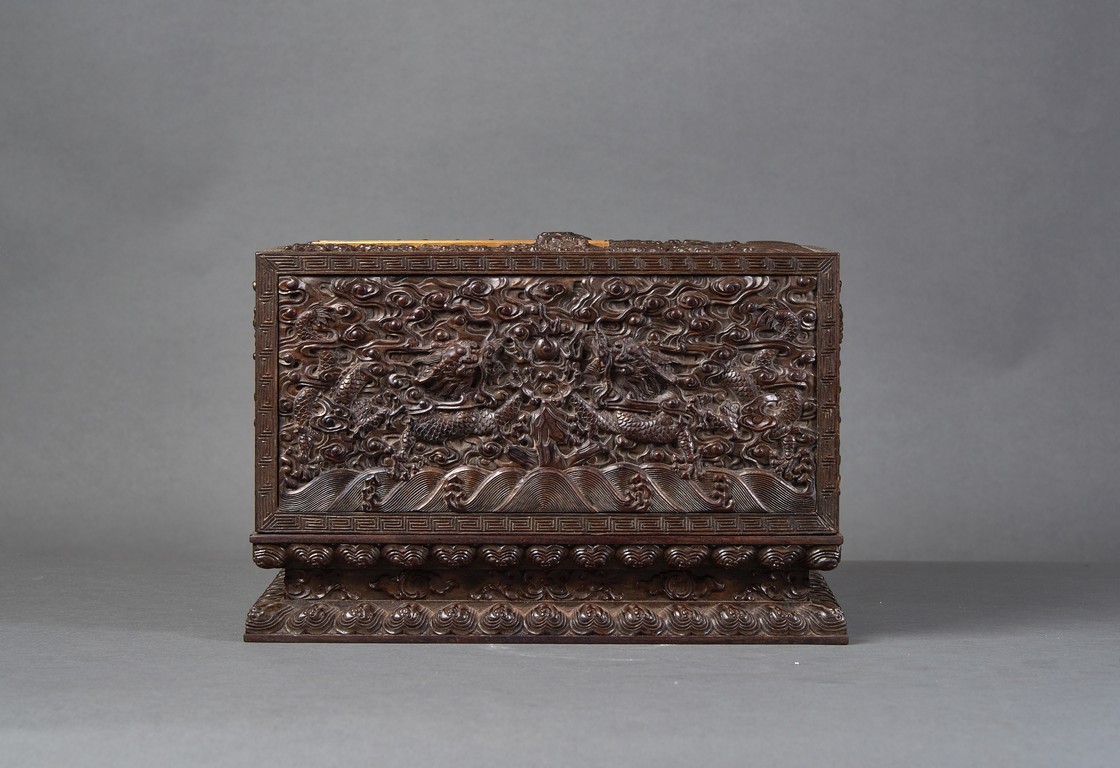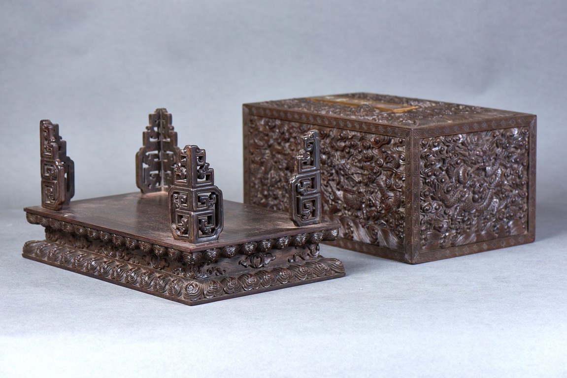 Of rectangular form, the top carved in relief with two scaly dragons descending amidst clouds above cresting waves and mountain and flanking a rectangular panel of four jade inlaid character 'Shen Gao Ji Qing', the cover sides similarly carved with dragon decorations, all supported on a waisted lotus stand with four openwork key-fret balustrades at each corner. Qing Dynasty period.