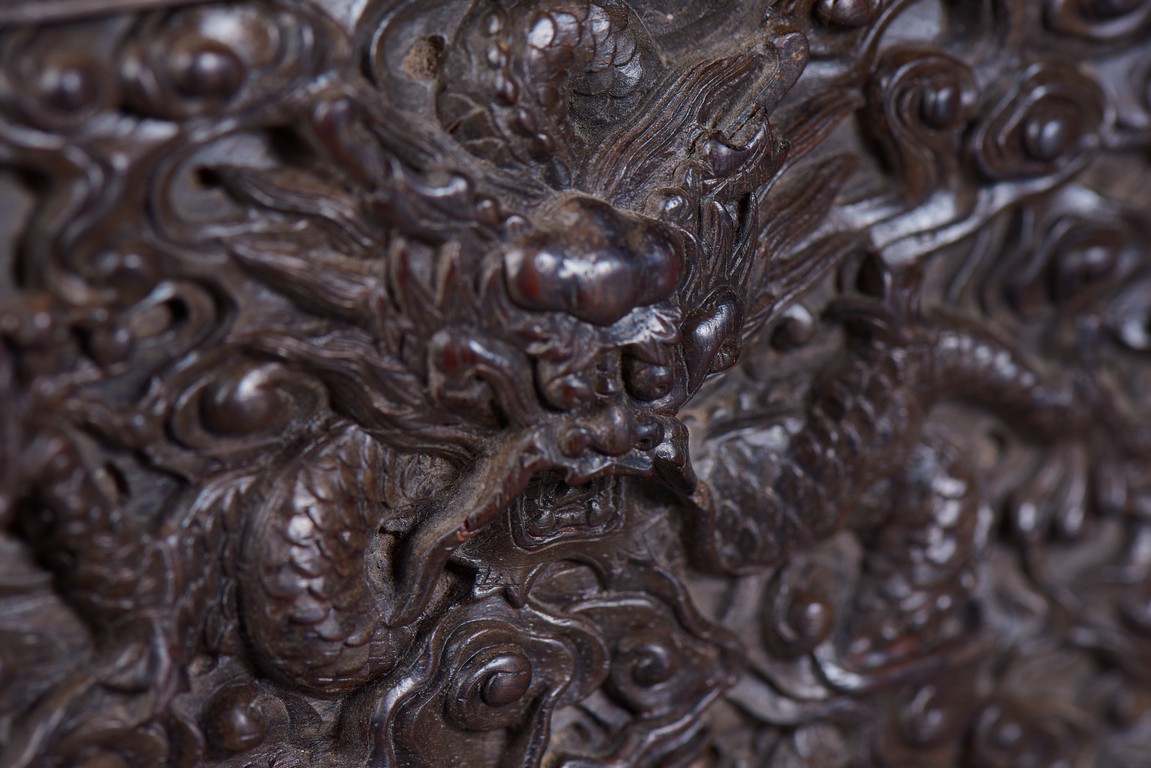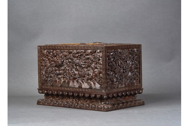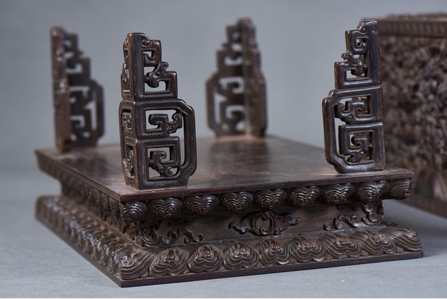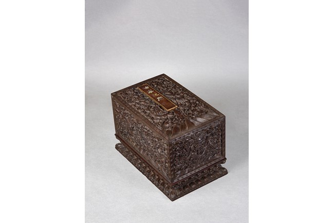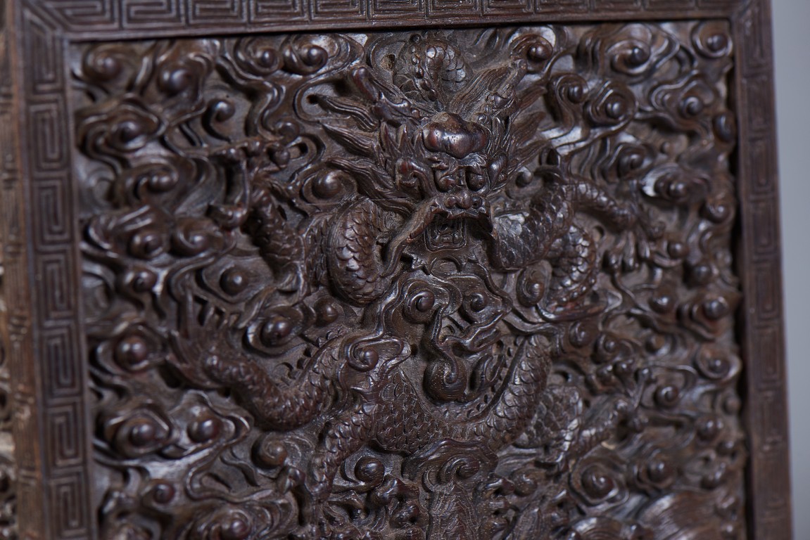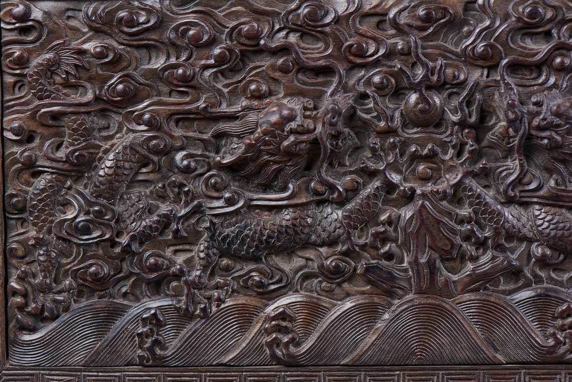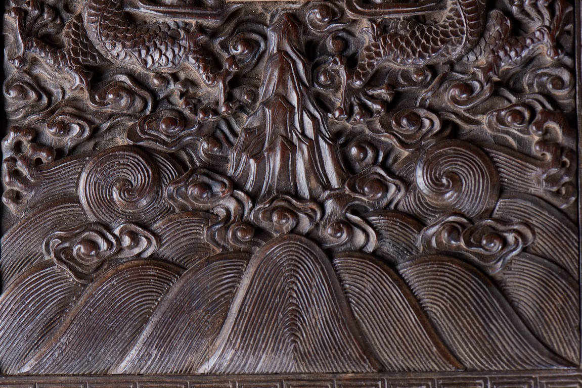 Of rectangular form, the top carved in relief with two scaly dragons descending amidst clouds above cresting waves and mountain and flanking a rectangular panel of four jade inlaid character 'Shen Gao Ji Qing', the cover sides similarly carved with dragon decorations, all supported on a waisted lotus stand with four openwork key-fret balustrades at each corner. Qing Dynasty period.