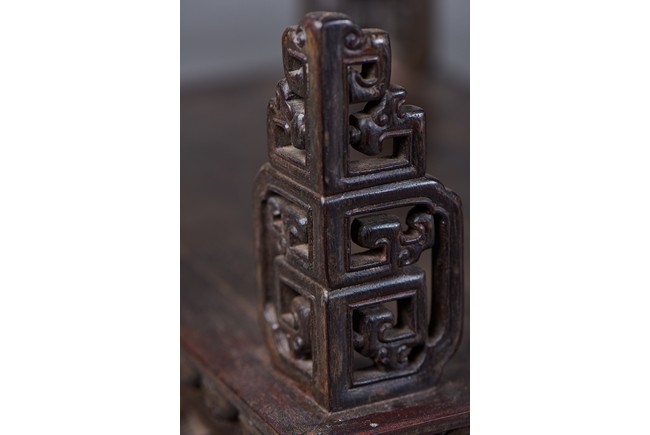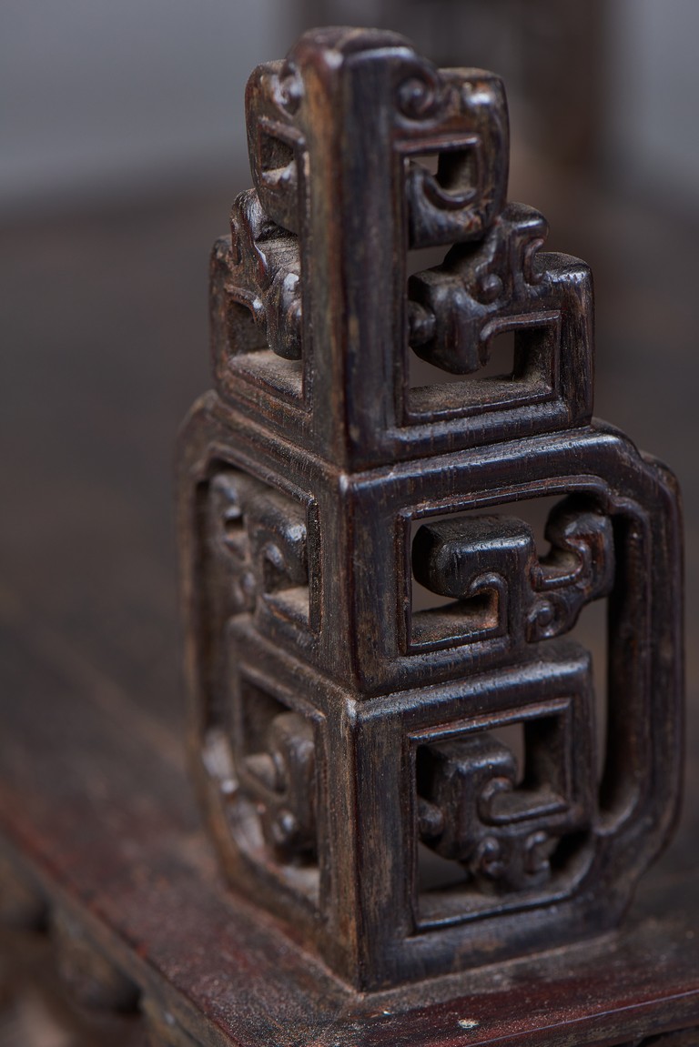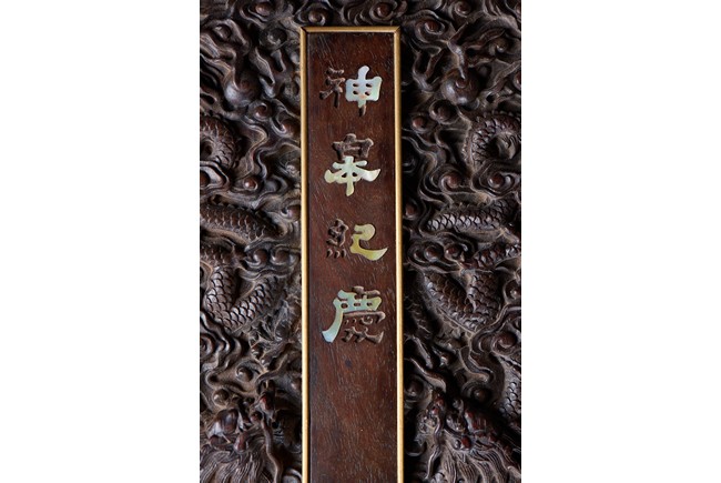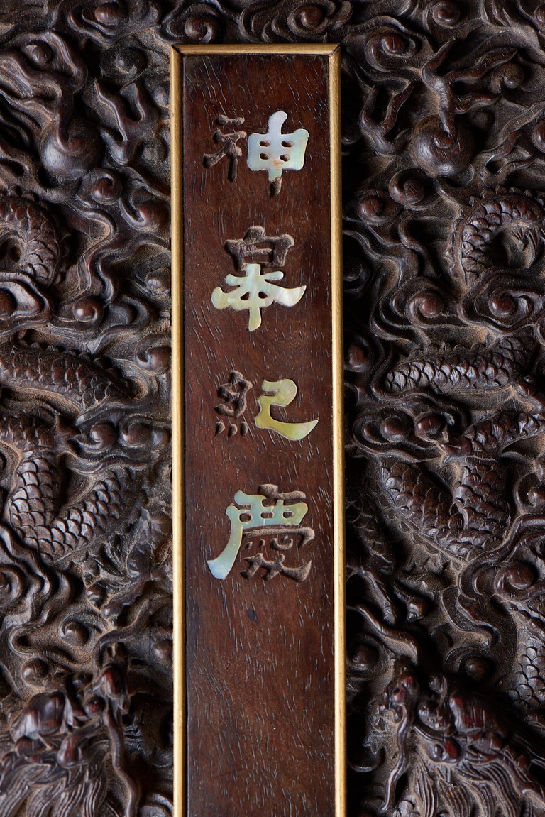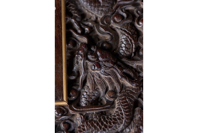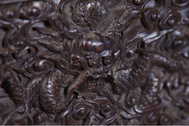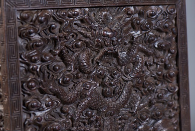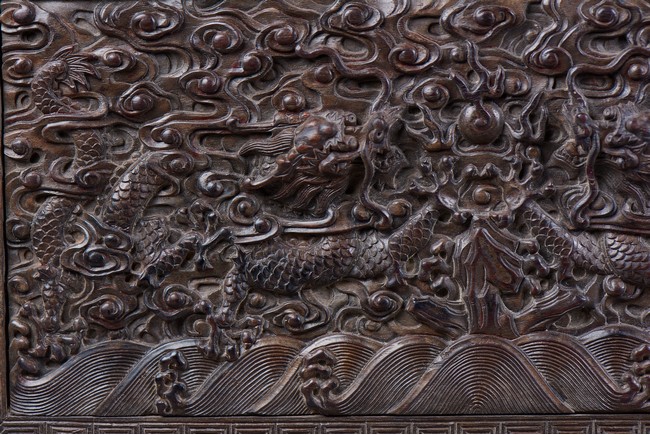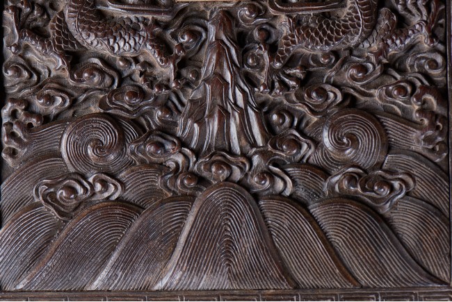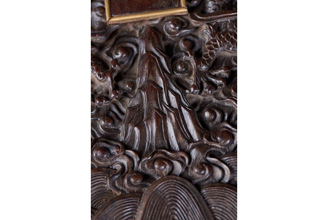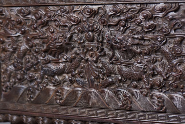 Of rectangular form, the top carved in relief with two scaly dragons descending amidst clouds above cresting waves and mountain and flanking a rectangular panel of four jade inlaid character 'Shen Gao Ji Qing', the cover sides similarly carved with dragon decorations, all supported on a waisted lotus stand with four openwork key-fret balustrades at each corner. Qing Dynasty period.