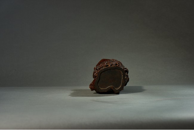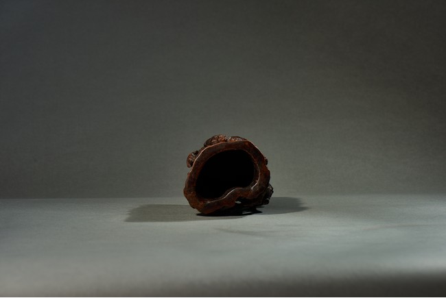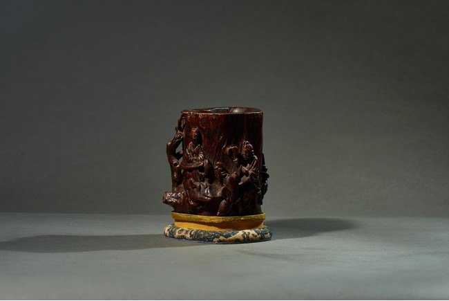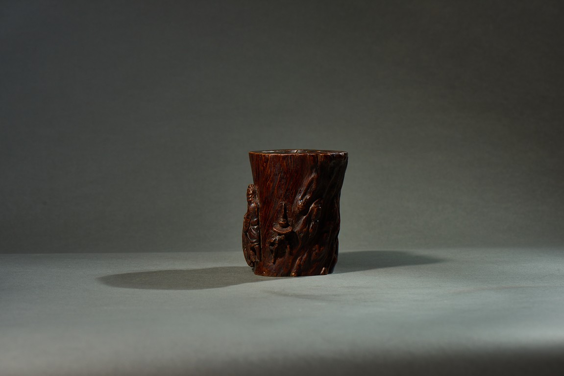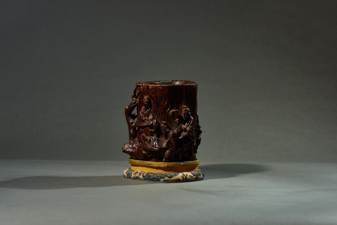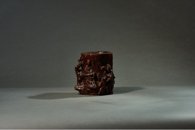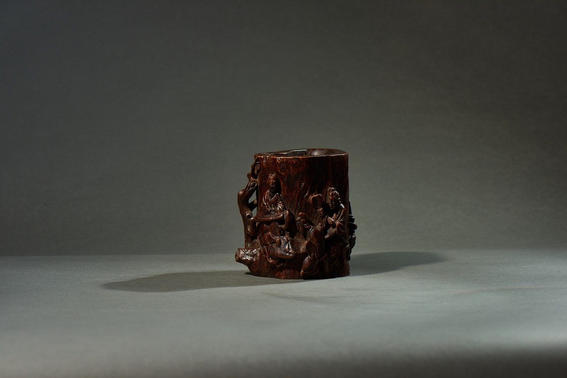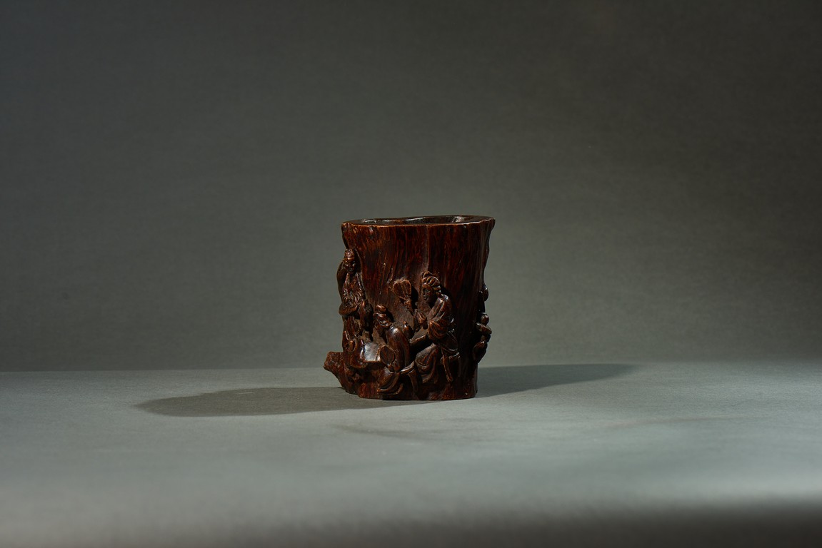 沉香是瑞香種植物所產,帶有濃郁香味,因其佳品可沉於水故名。此筆筒用料頗多,筒身厚大,色澤沉穩,筆筒隨形,波折不整,身形自然,用刀犀利,雕飾人物,人物形像生動,打磨光滑,技法純熟,風格高雅,渾然天成。此筆筒不僅取材別緻,且構思巧妙,雕琢精湛,包漿濃厚,色澤瑩潤,充分體現了文人高雅的生活情趣。