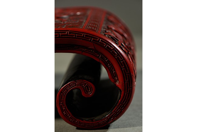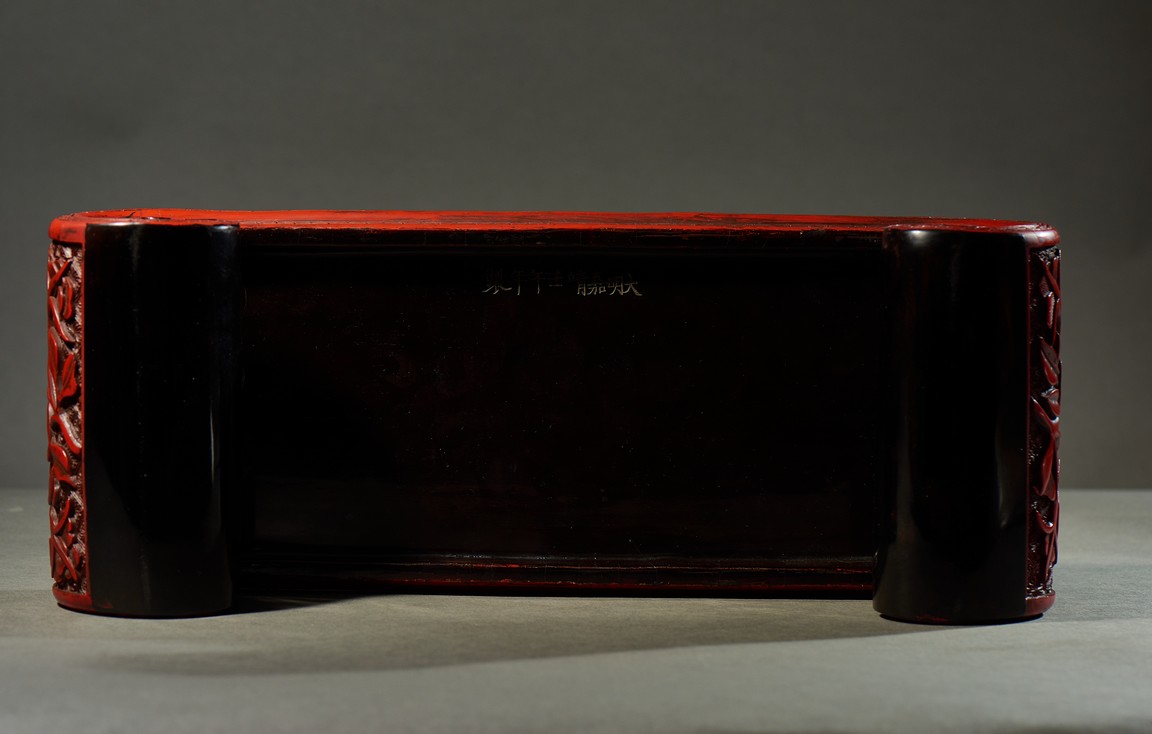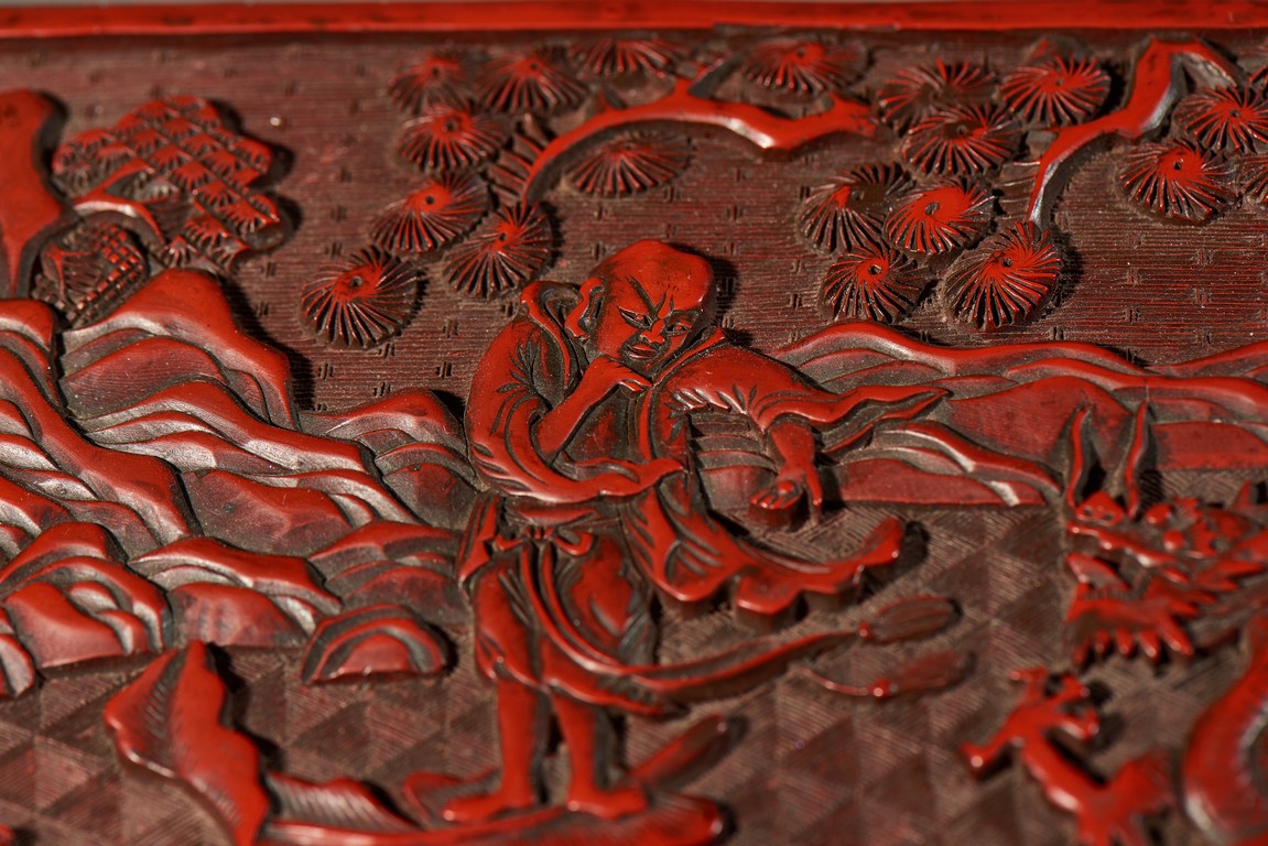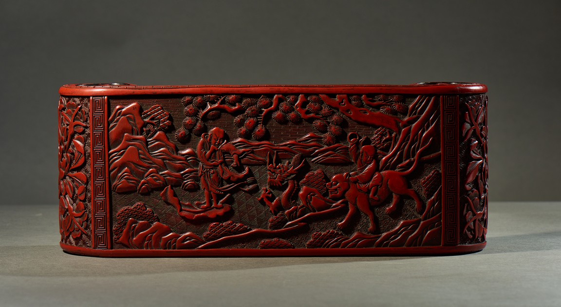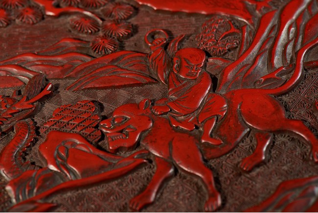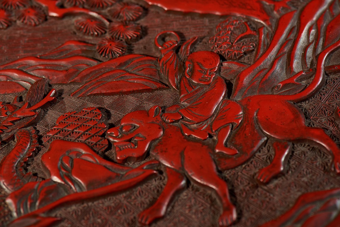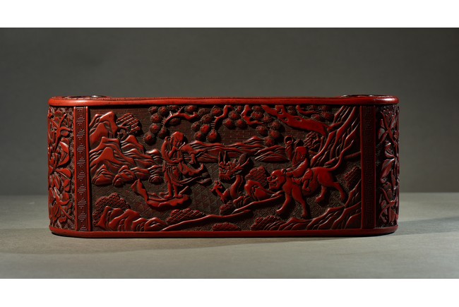 呈書卷式,設計靈巧,兼具實用及賞玩價值。紅雕漆,木胎,繪“降龍伏虎羅漢圖”,伏虎手持法器騎於老虎之上;降龍立於蒼龍邊。畫面繁密,人物雕刻深峻爽朗,運刀嫻熟,韻味頓現, 是難得一見的文房雅器。