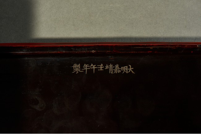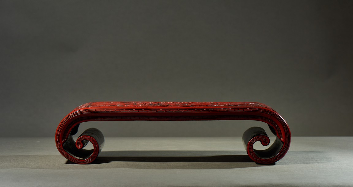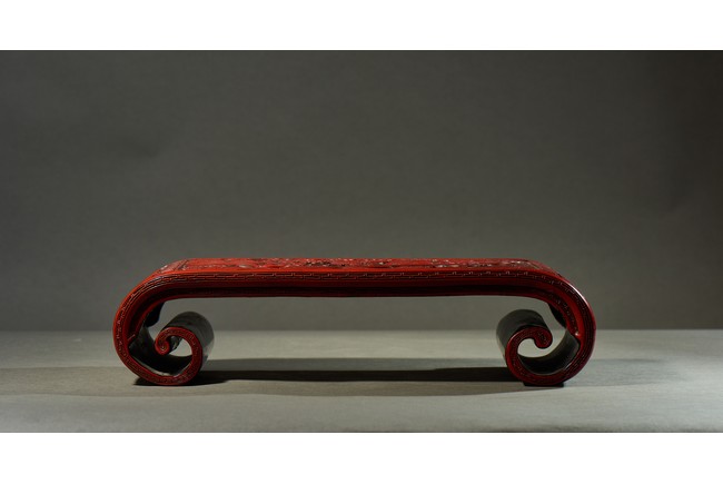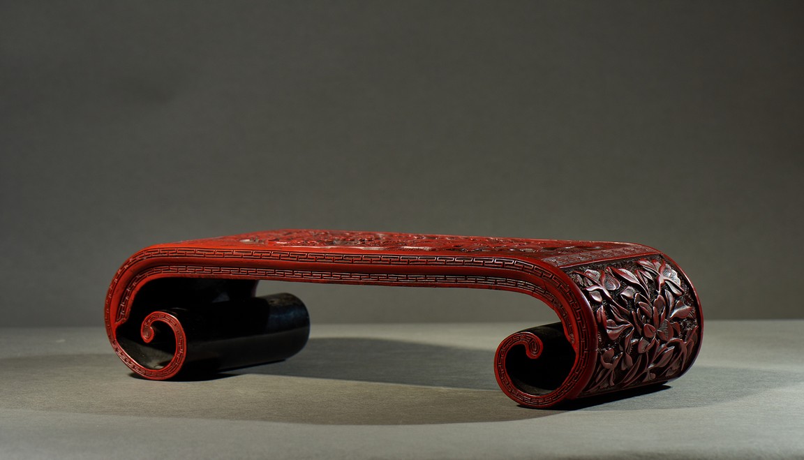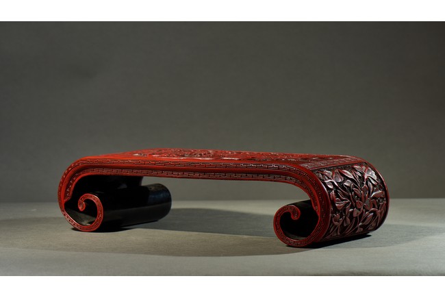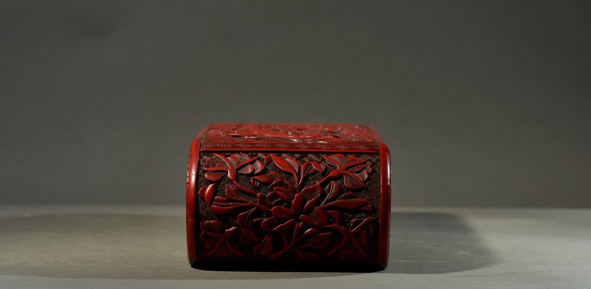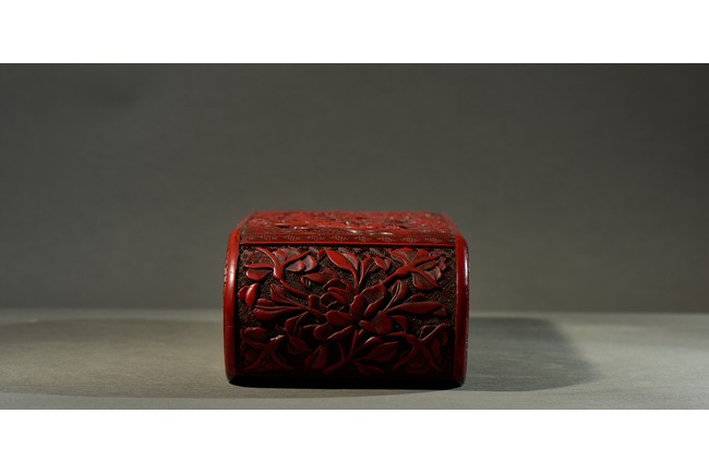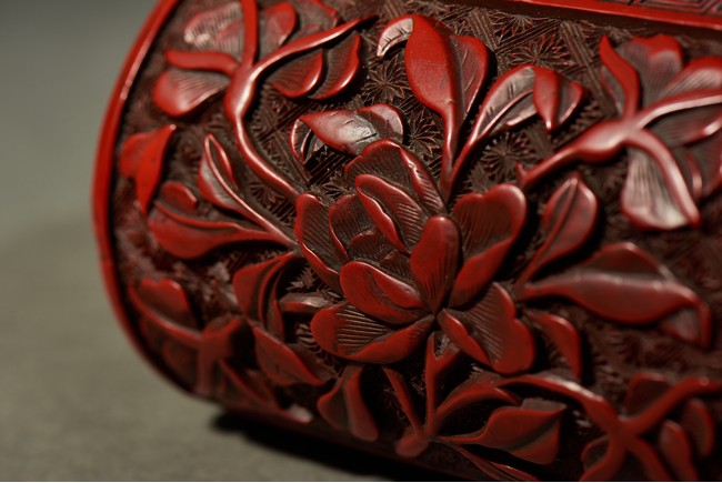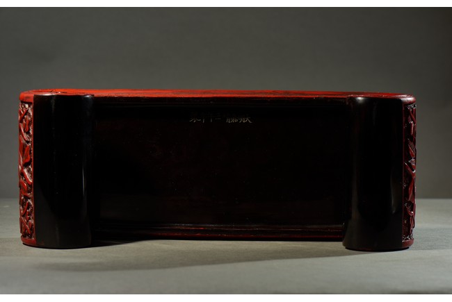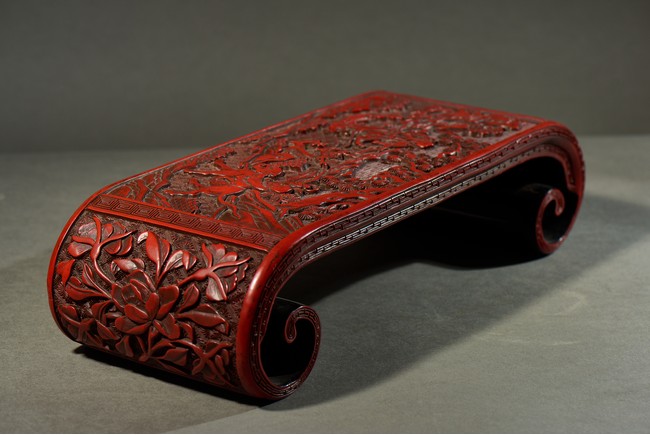 呈書卷式,設計靈巧,兼具實用及賞玩價值。紅雕漆,木胎,繪“降龍伏虎羅漢圖”,伏虎手持法器騎於老虎之上;降龍立於蒼龍邊。畫面繁密,人物雕刻深峻爽朗,運刀嫻熟,韻味頓現, 是難得一見的文房雅器。