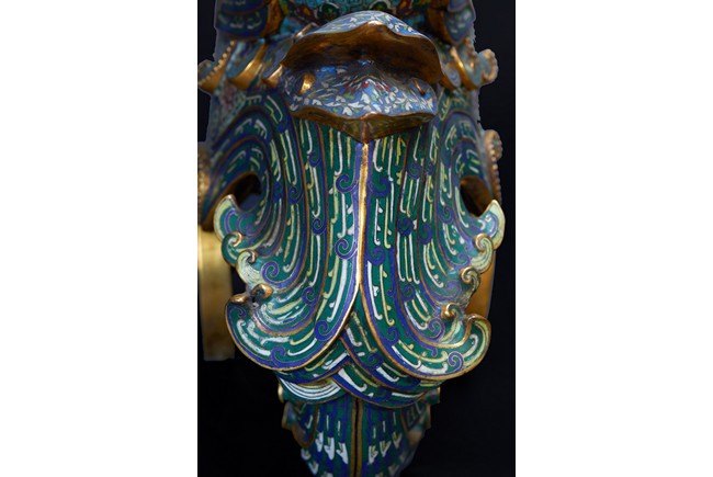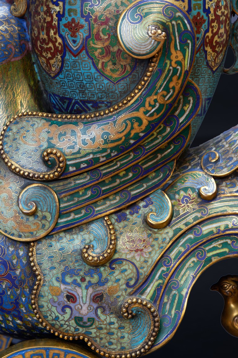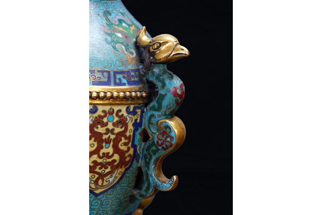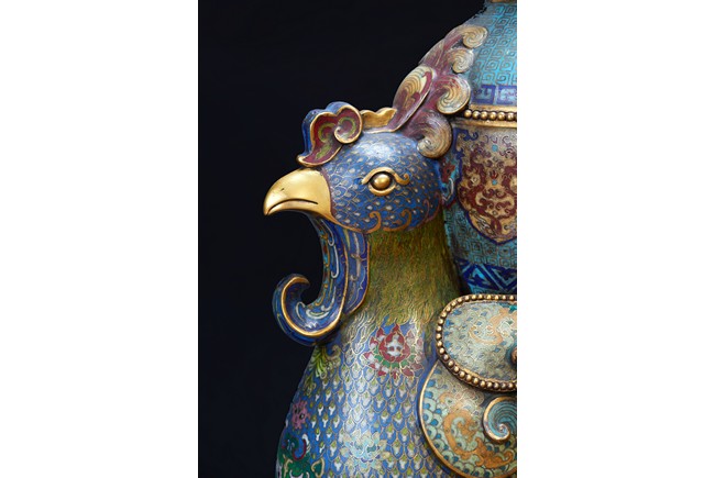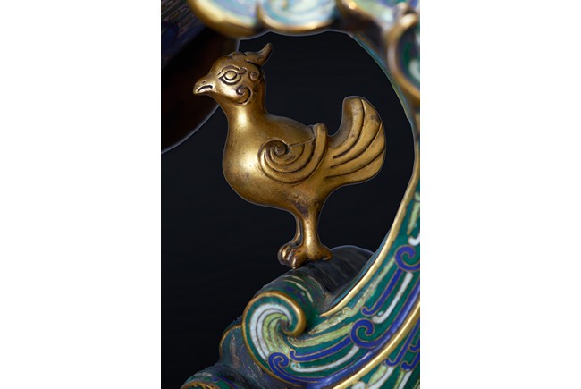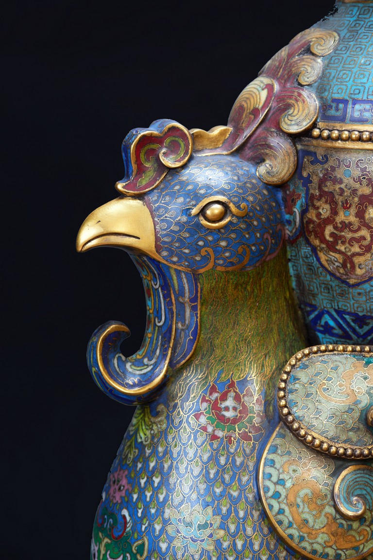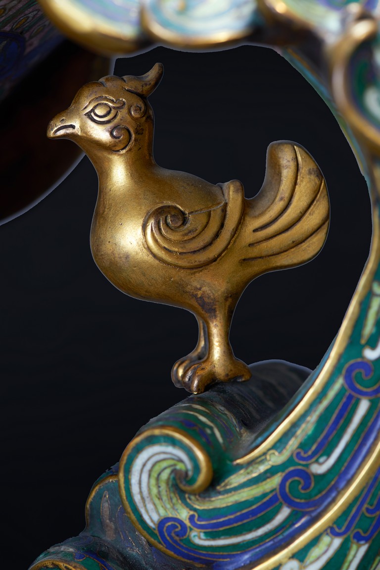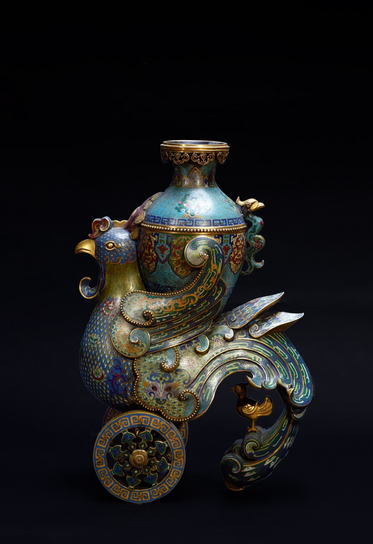 Elaboratedly modelled into a phoenix perched on an axle between two stationary spoked wheels that decorated with key-fret band rim, the feather enamelled with scrolled cloud and lotus pattern, bearing turquois ground baluster vase on ite back, below the larger phoenix curling tail standing a smaller golden baby phoenix. Qing Dynasaty period.