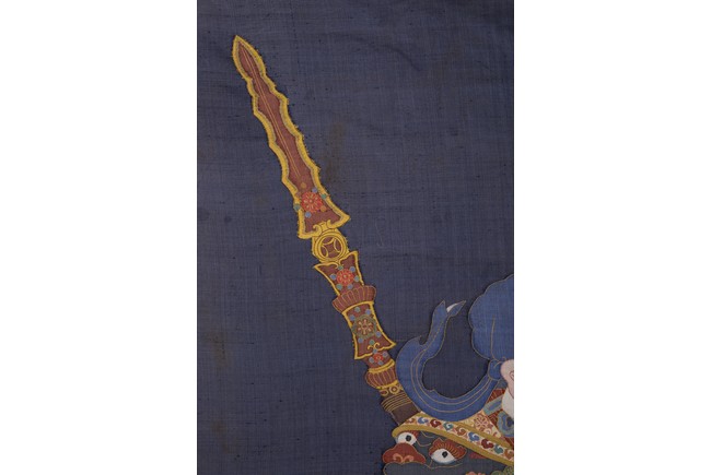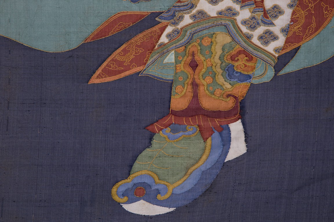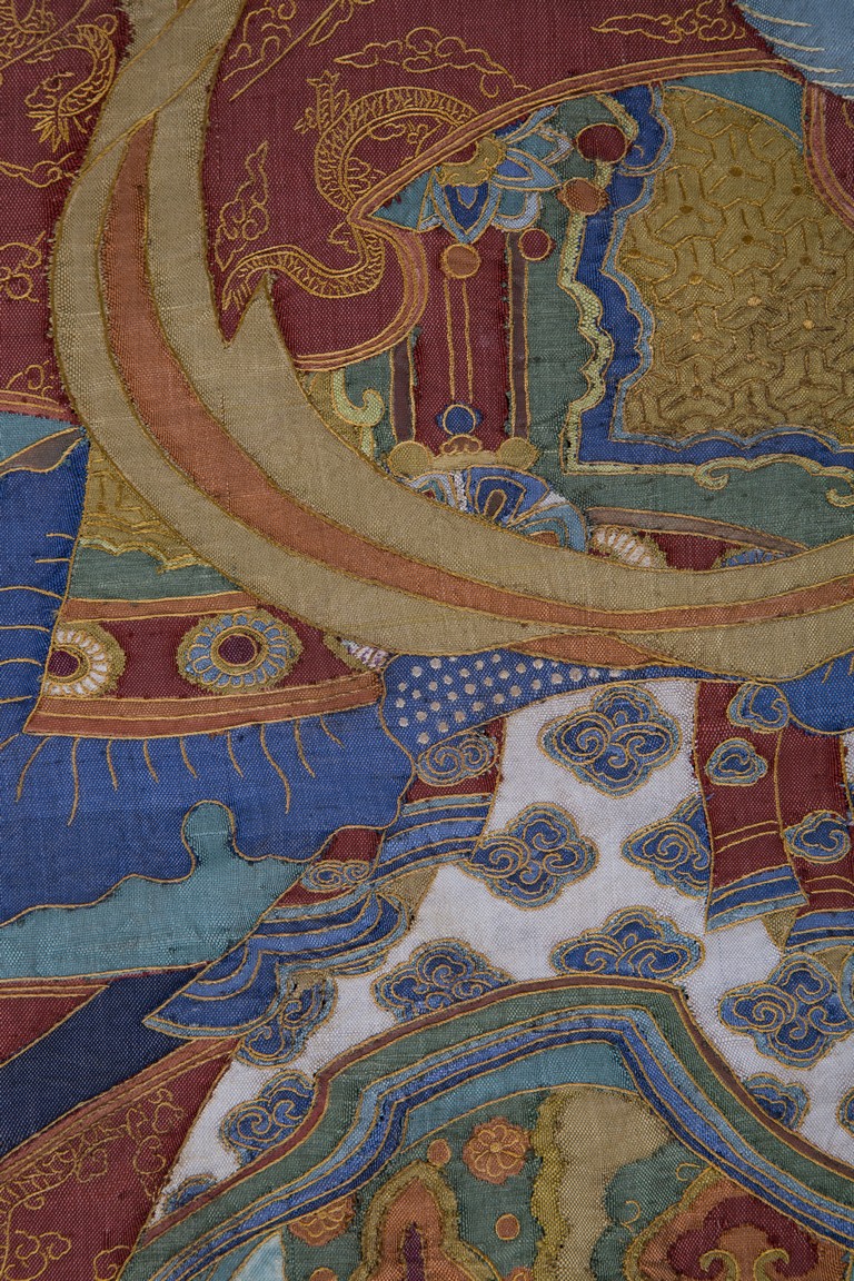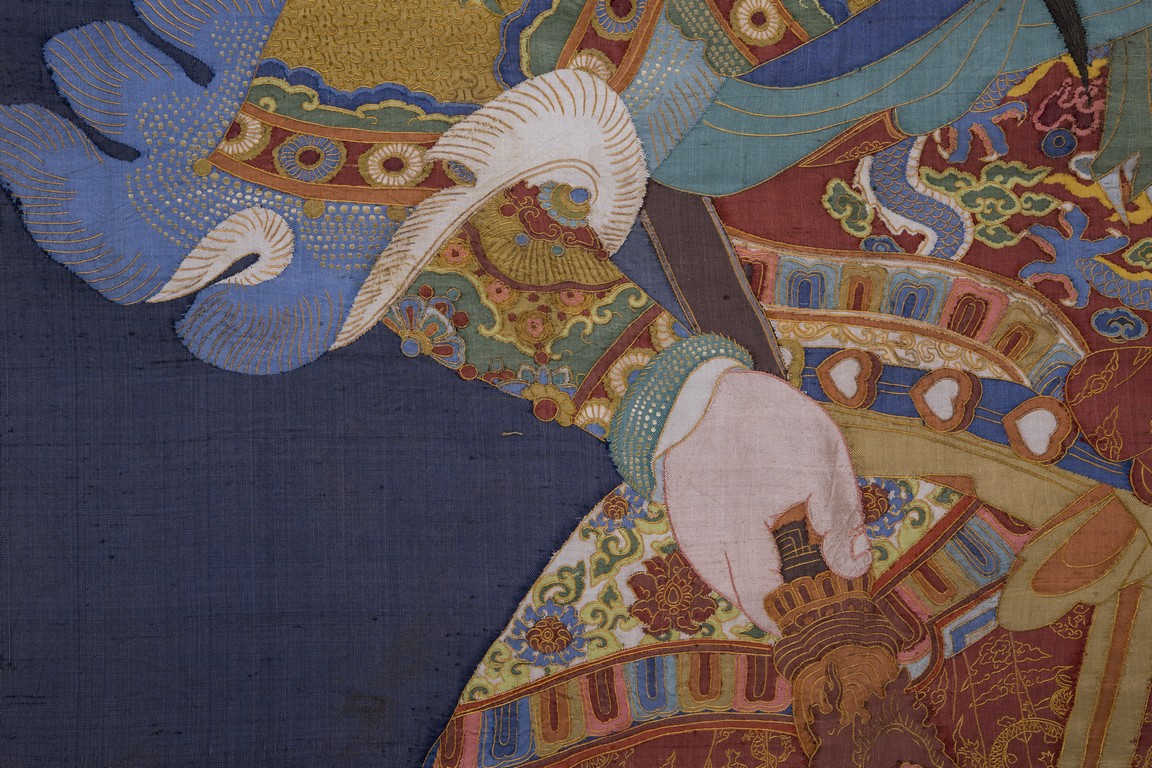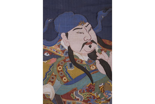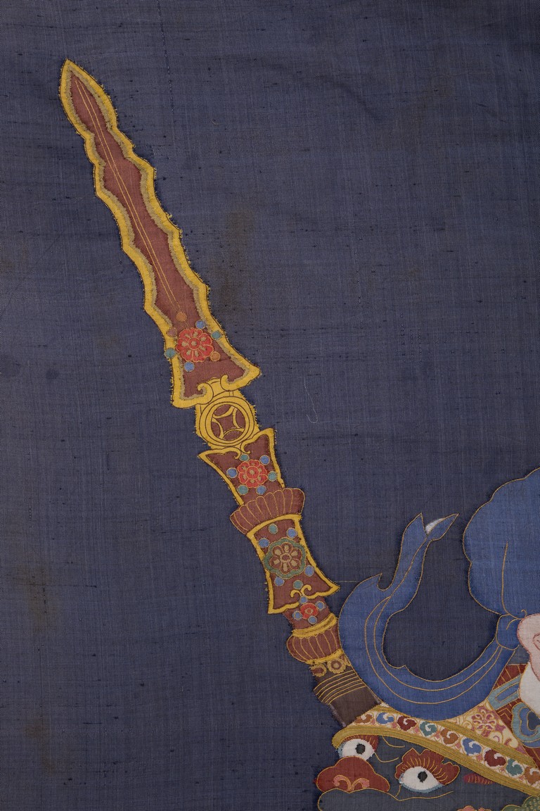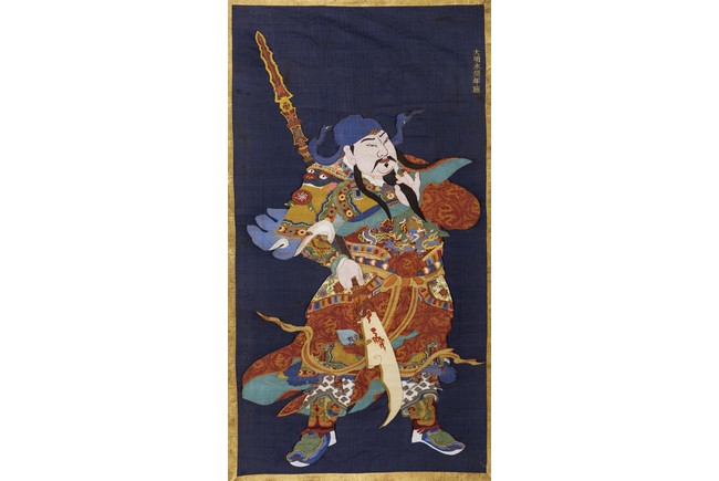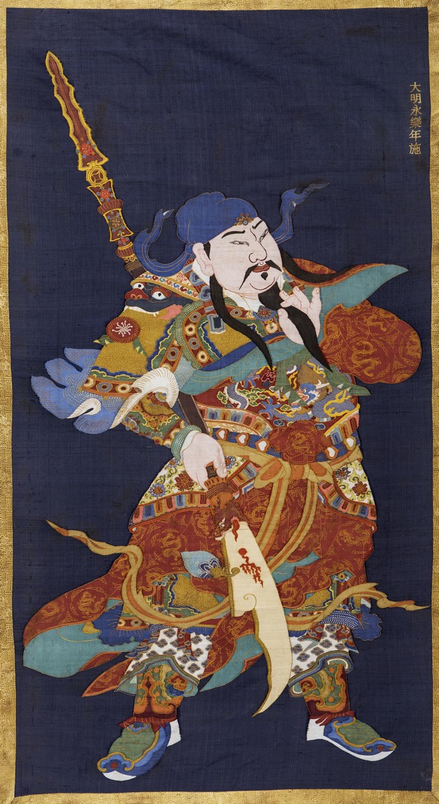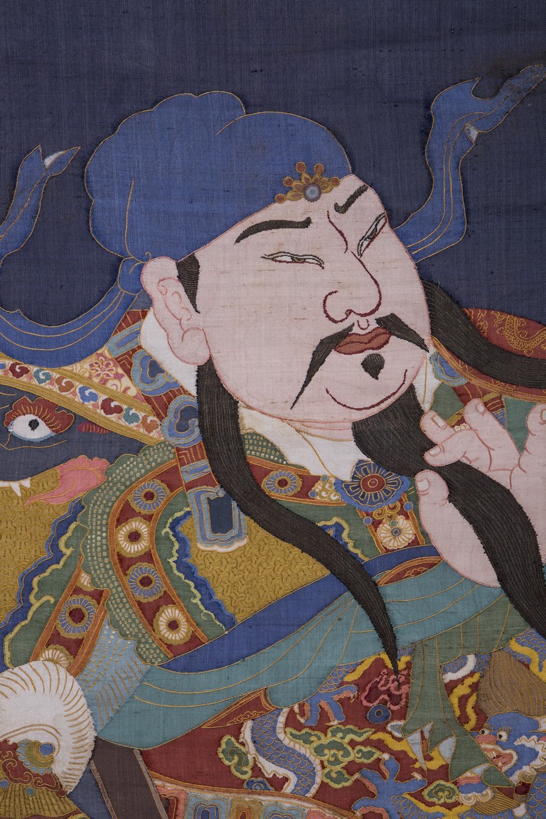Finely embroidered to depict Guan Yu wearing elaborate armor with dragon pattern, right hand grabbing the legendary Dragon Cresent blade, left hand holding long beard, all against blue ground, upper right with inscription.