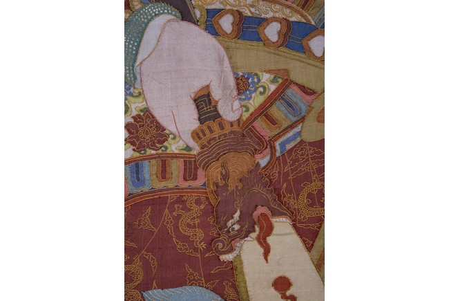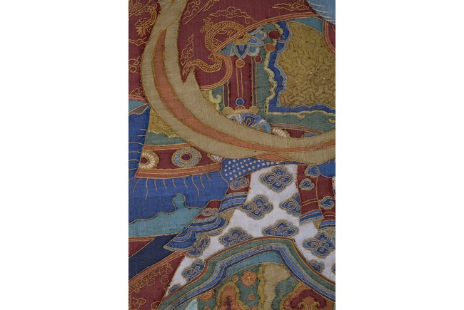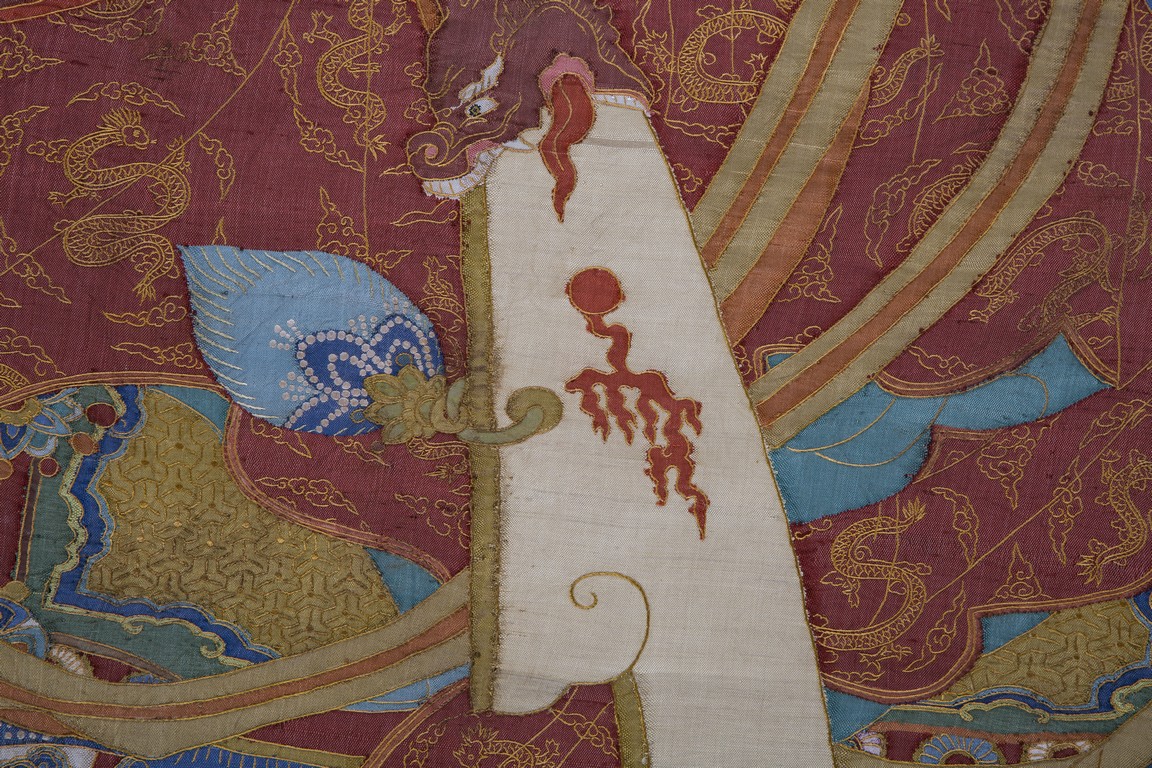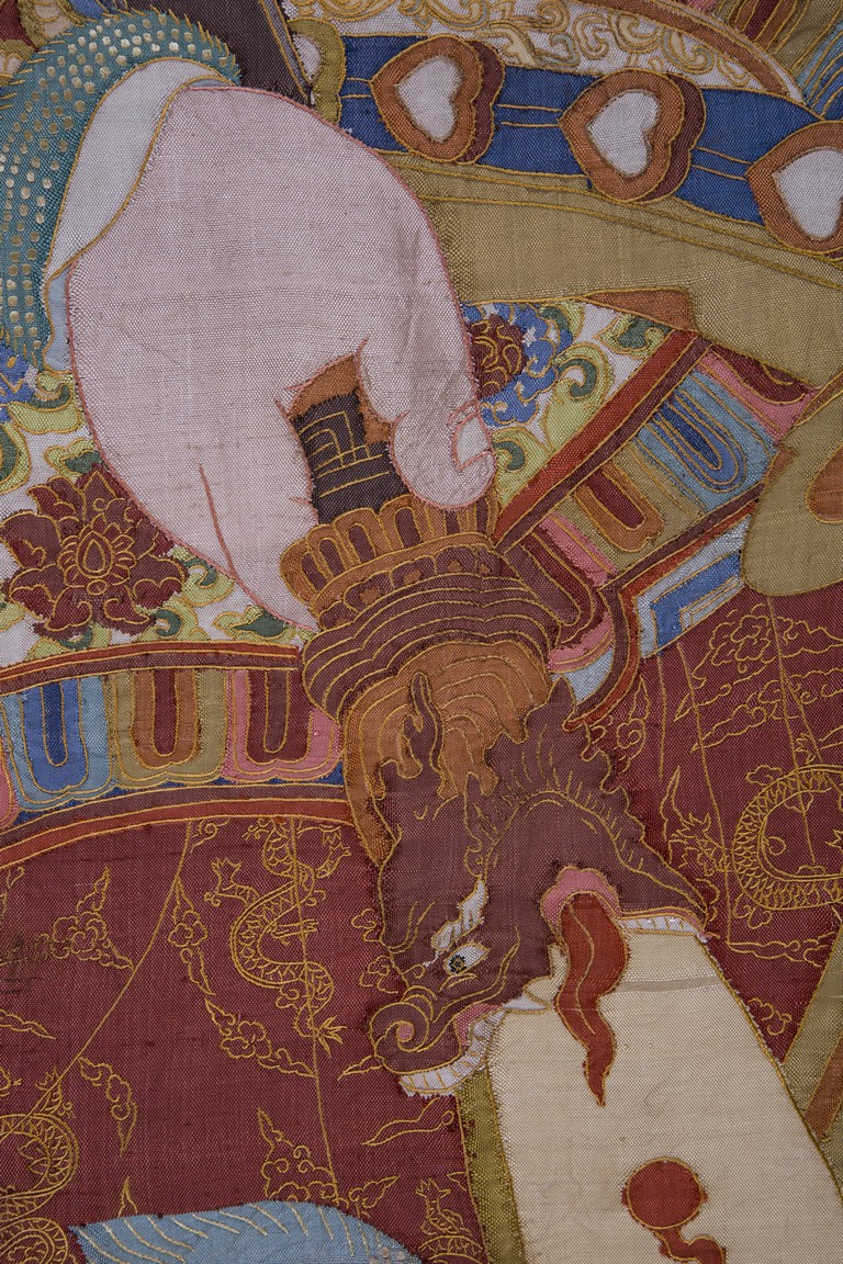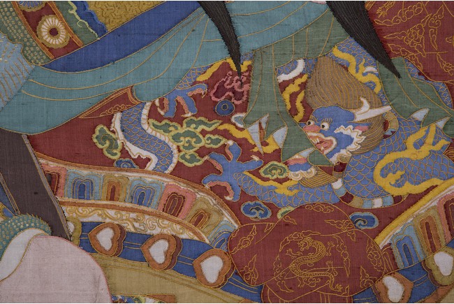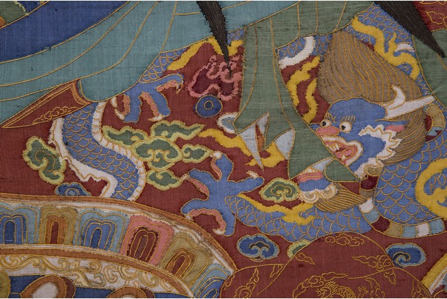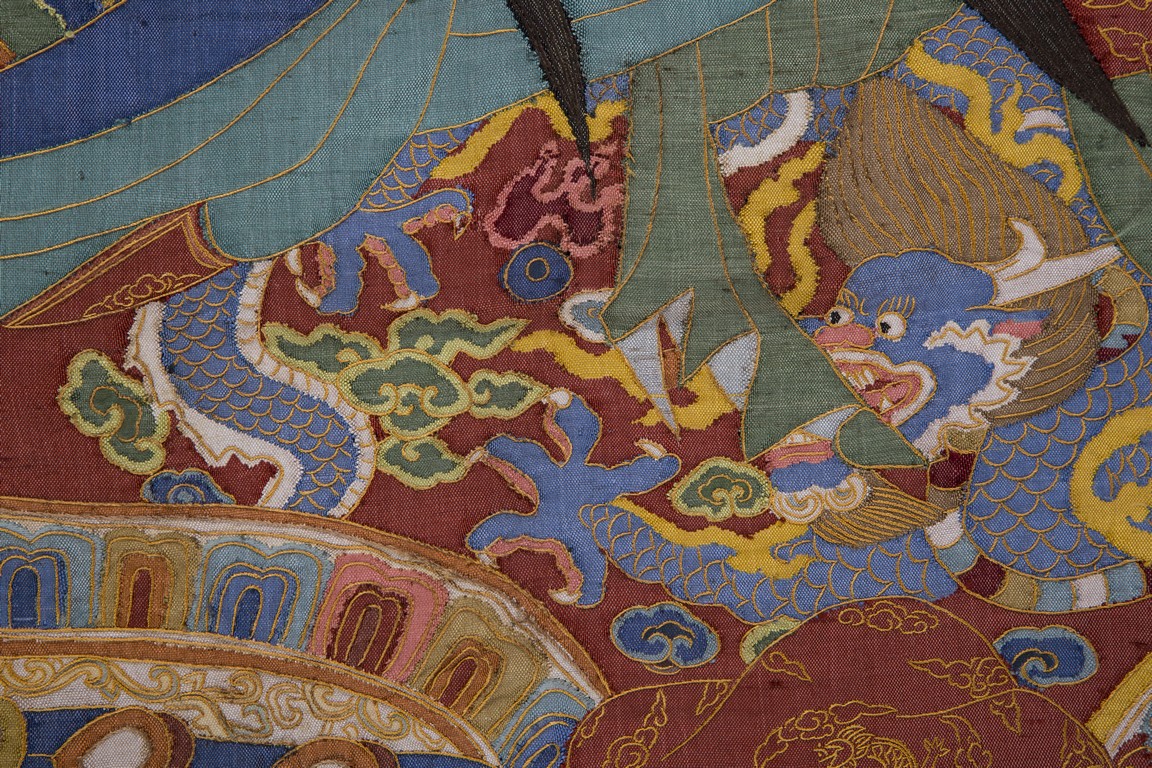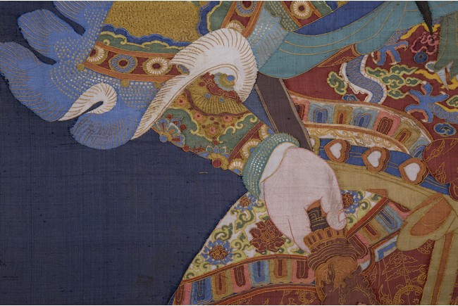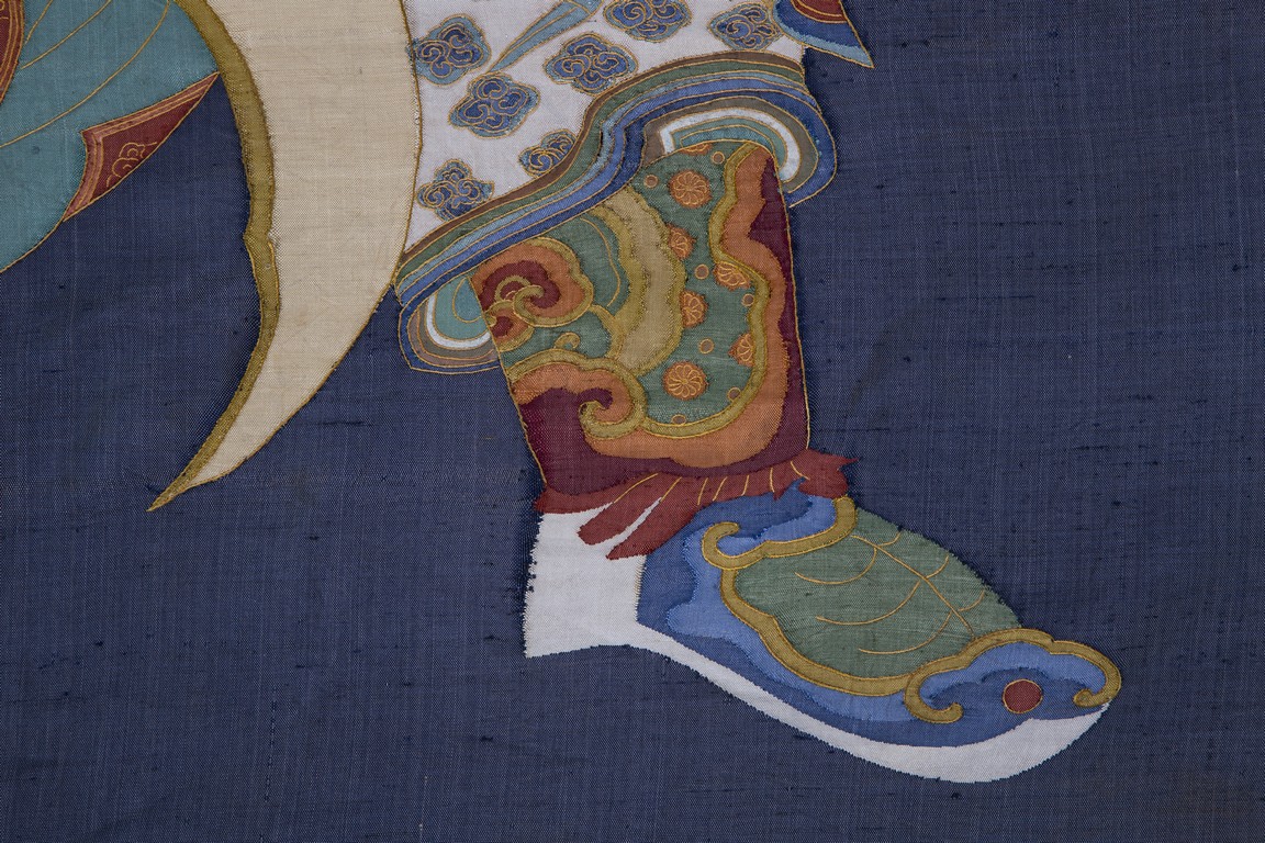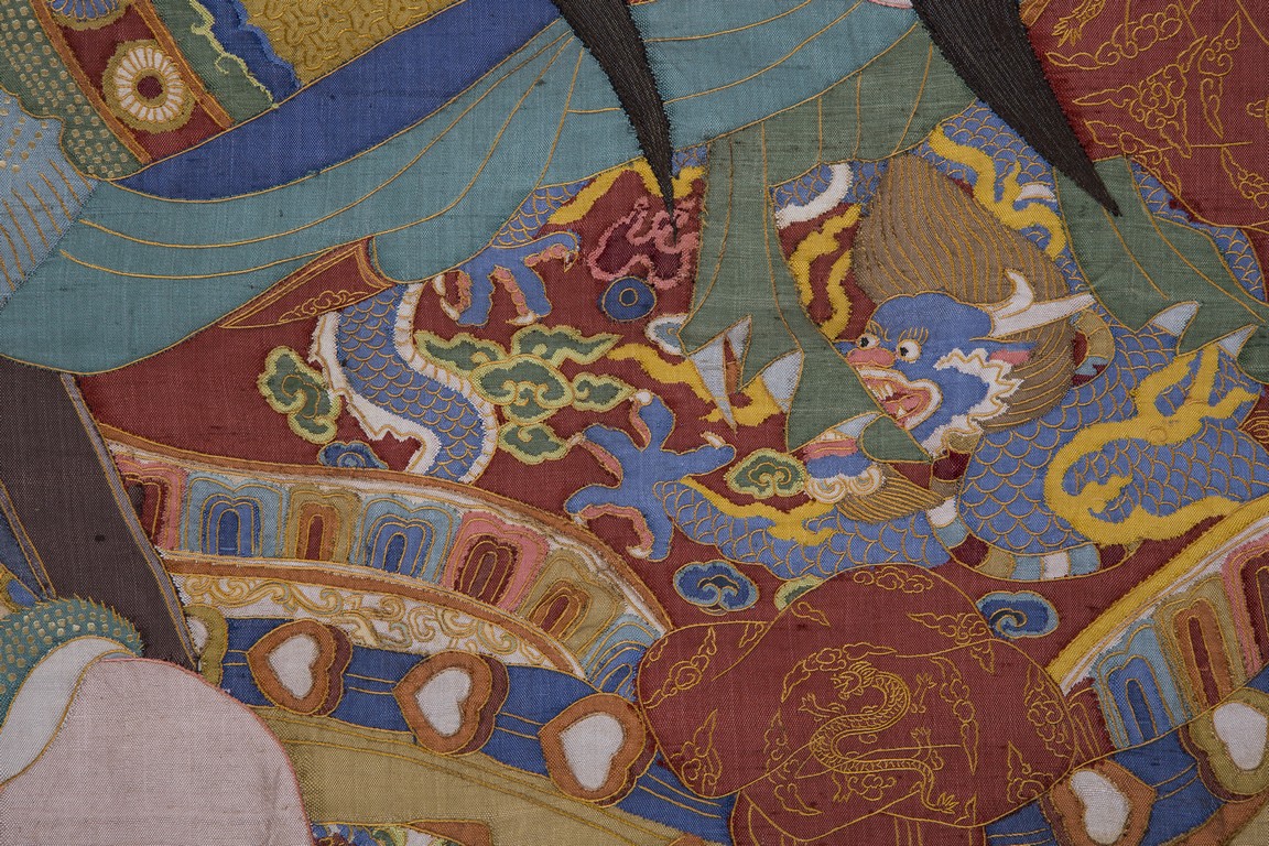 Finely embroidered to depict Guan Yu wearing elaborate armor with dragon pattern, right hand grabbing the legendary Dragon Cresent blade, left hand holding long beard, all against blue ground, upper right with inscription.