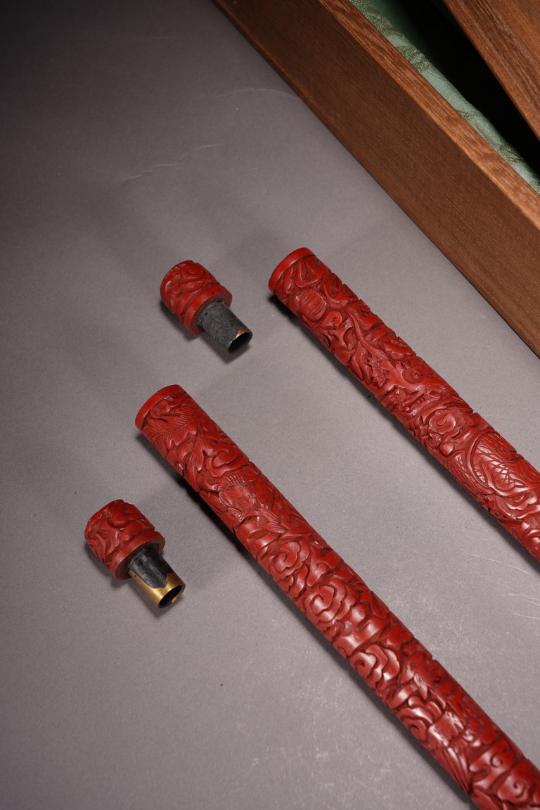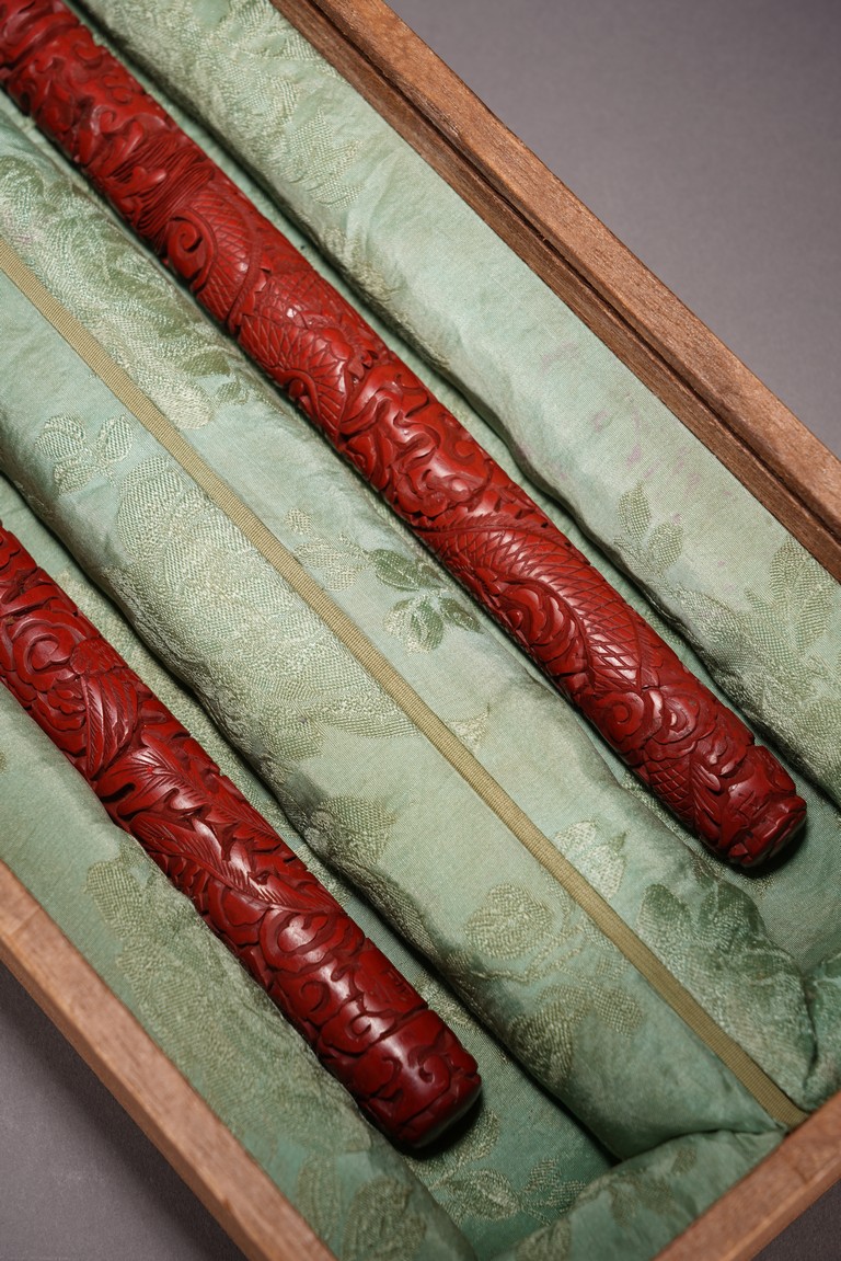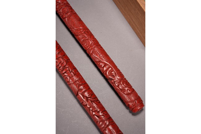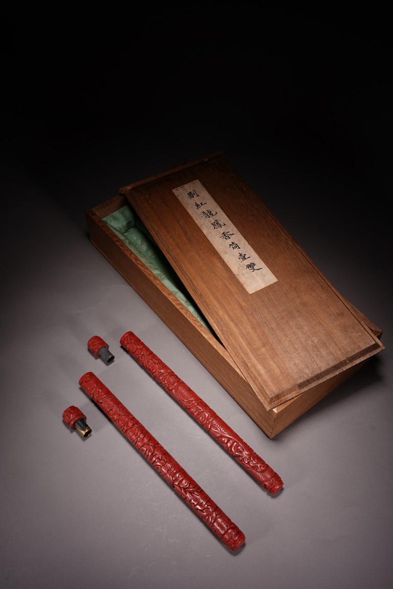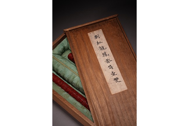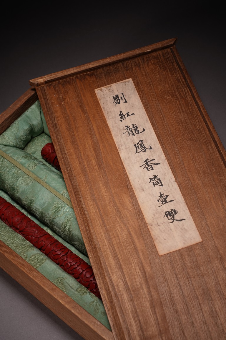 以剔漆工藝製成,採用剔紅工藝,通體剔刻雲龍紋飾,花紋剔刻線條流暢,如行雲流水,手感較佳,是一對製作精美的香道用具。