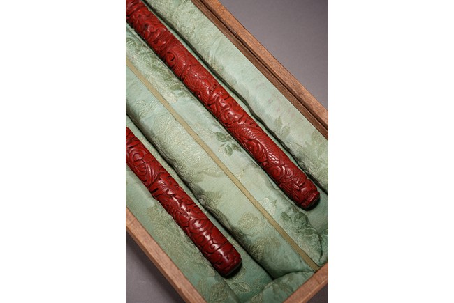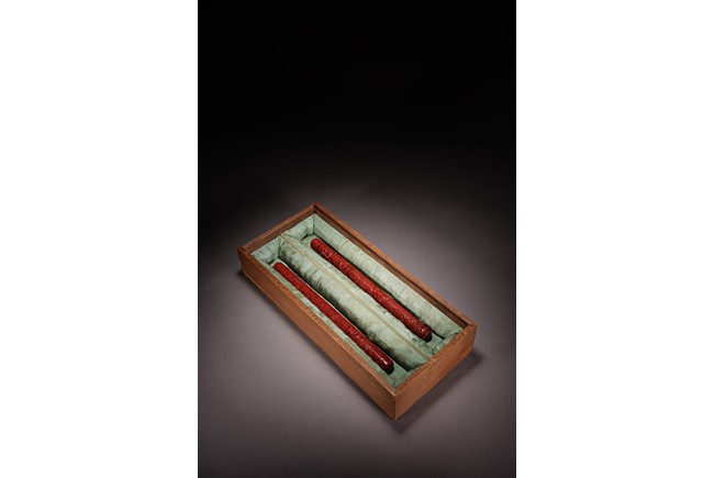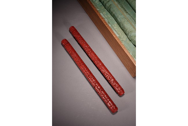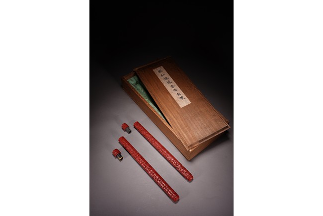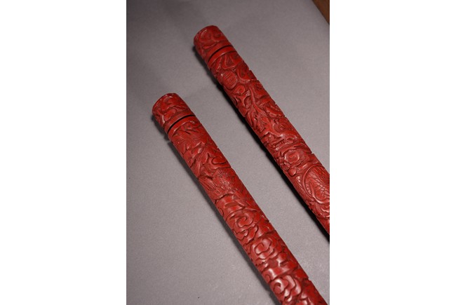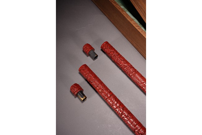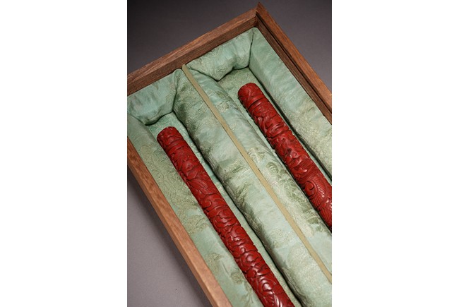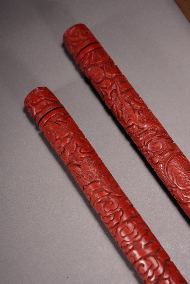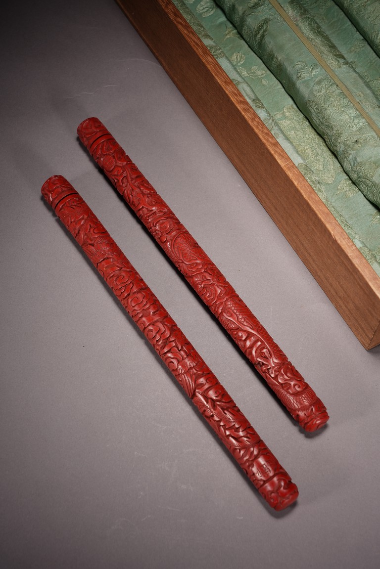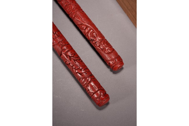 以剔漆工藝製成,採用剔紅工藝,通體剔刻雲龍紋飾,花紋剔刻線條流暢,如行雲流水,手感較佳,是一對製作精美的香道用具。