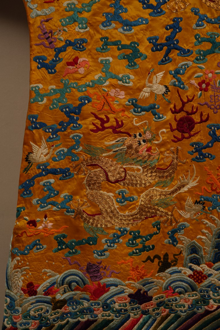 Embroidered with dragons surrounded by bats, cranes, and the Eight Daoist Emblems represented with various flowers including lotus and prunus, all above crashing waves and a lishui border.