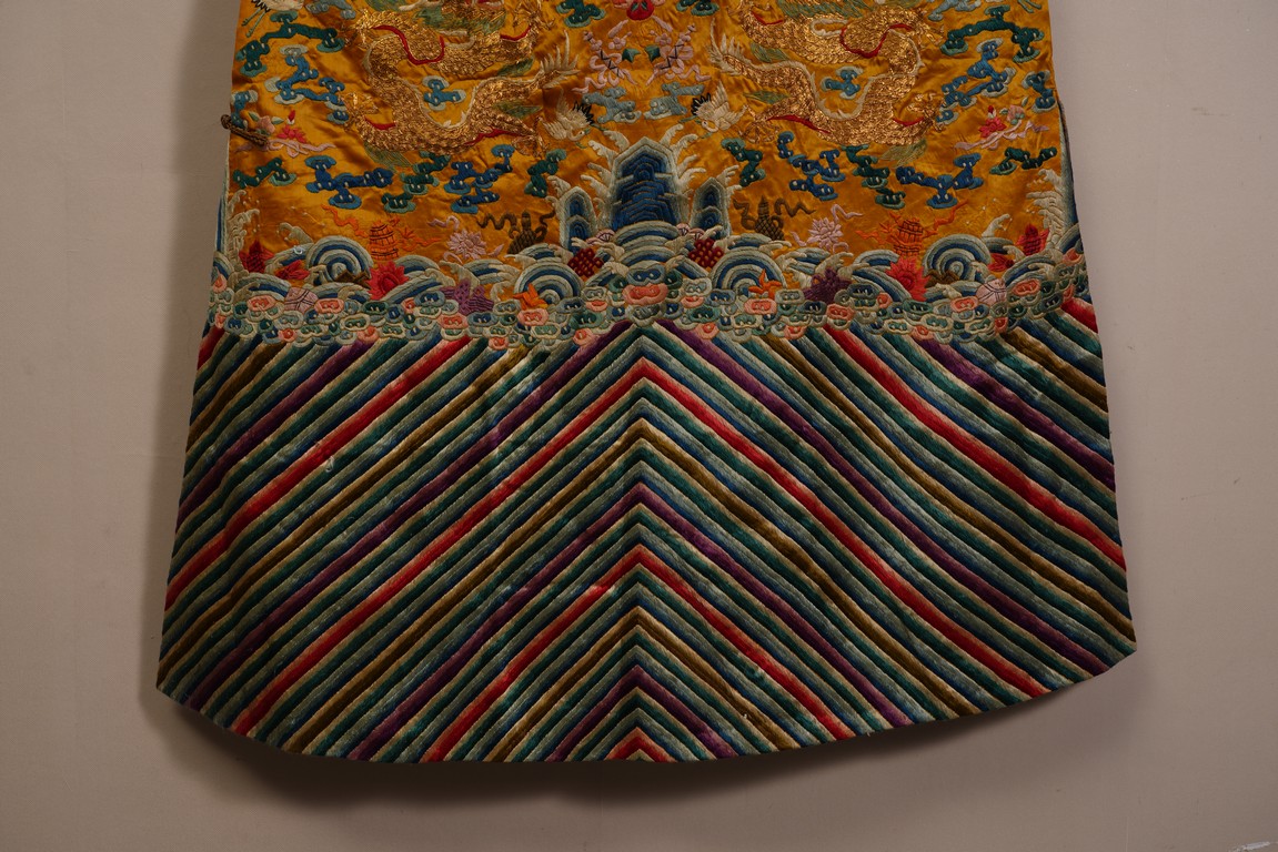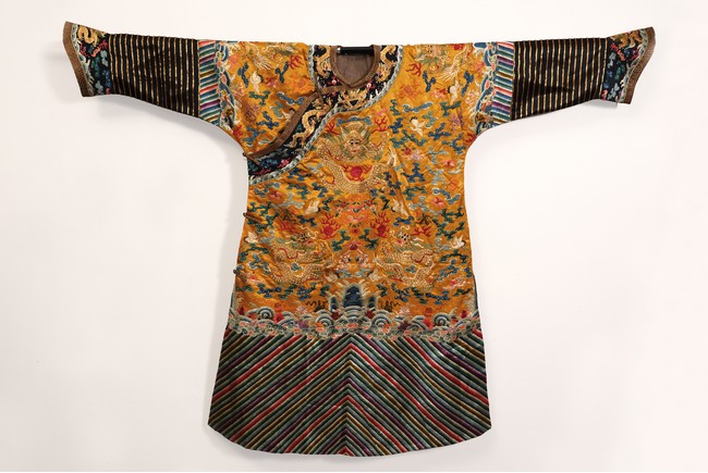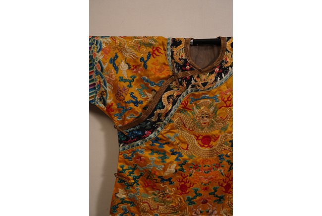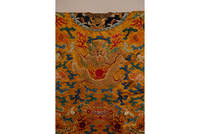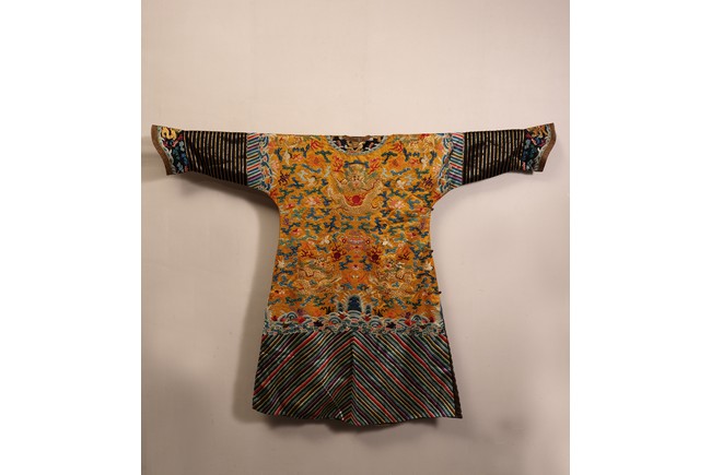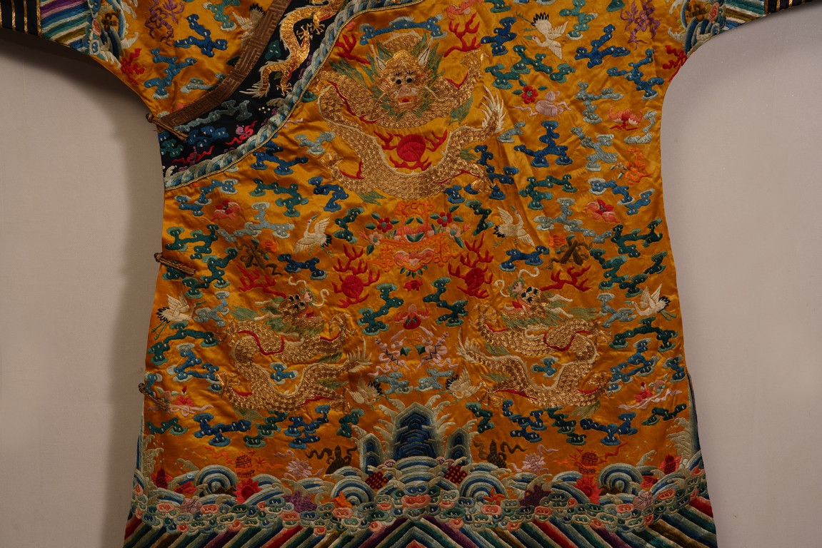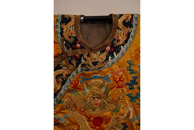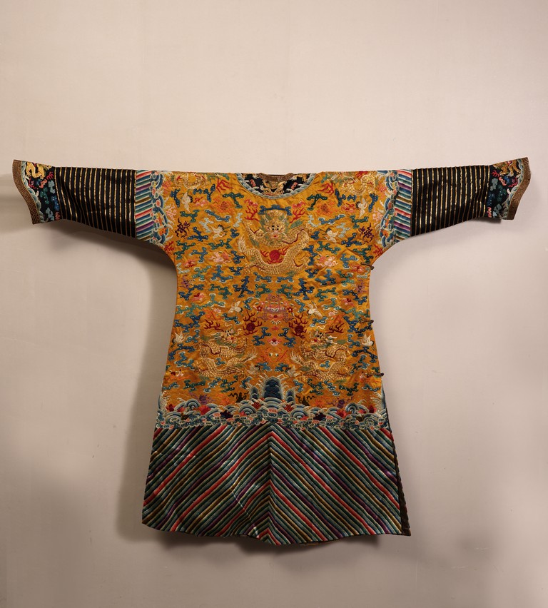 此龍袍圓領,大襟右衽,馬蹄袖。明黃色芝麻紗袍身,醬色素綢裡襯,玄地海水雲龍紋領袖邊。袍面繡五爪金龍紋,前後身、左右肩及底襟繡金龍紋。龍紋間滿繡五色祥雲與紅色蝙蝠,以寓“洪福齊天”。下幅為海水江崖與八寶立水紋,寓意“一統山河”。海面除八寶外,還點綴如意紋。此袍做工規整精細,配色典雅沉穩,盡顯皇室的大氣高貴。