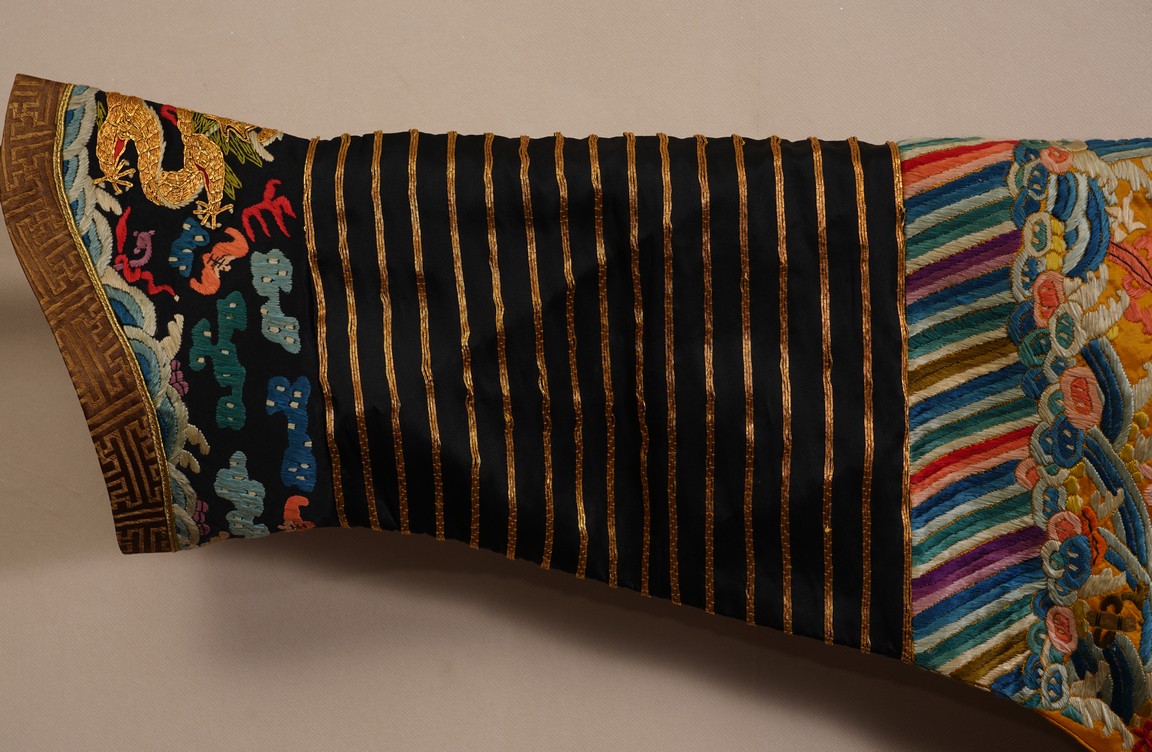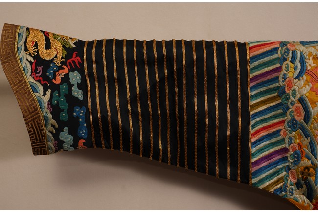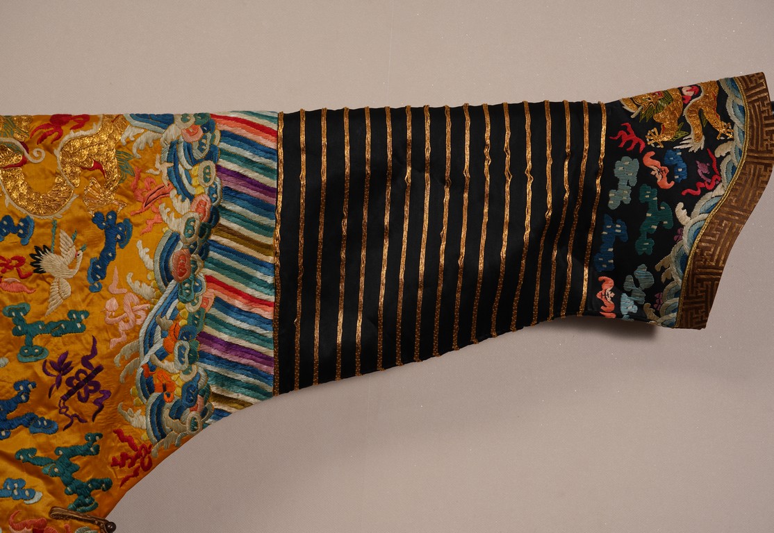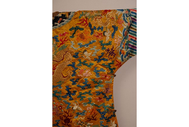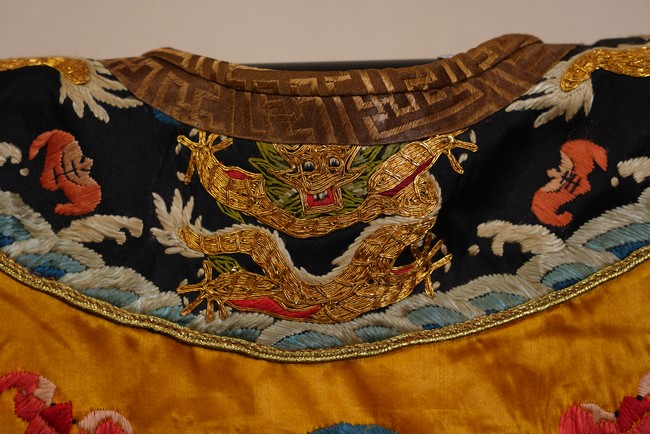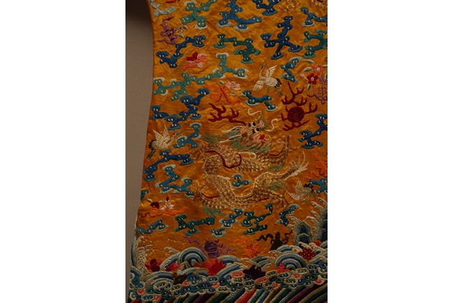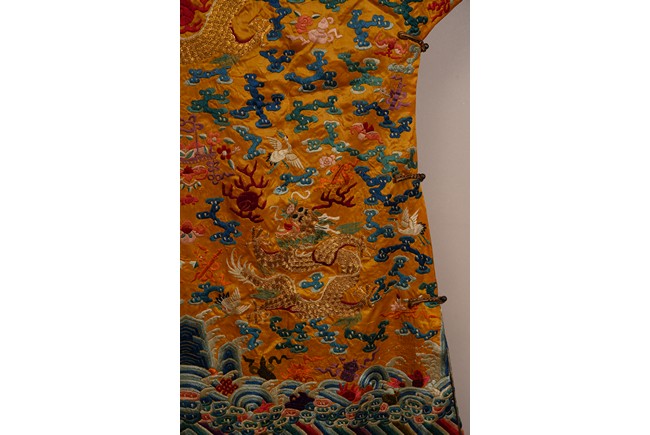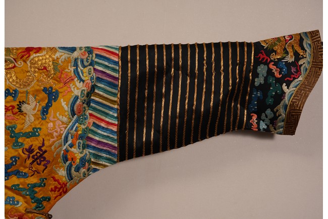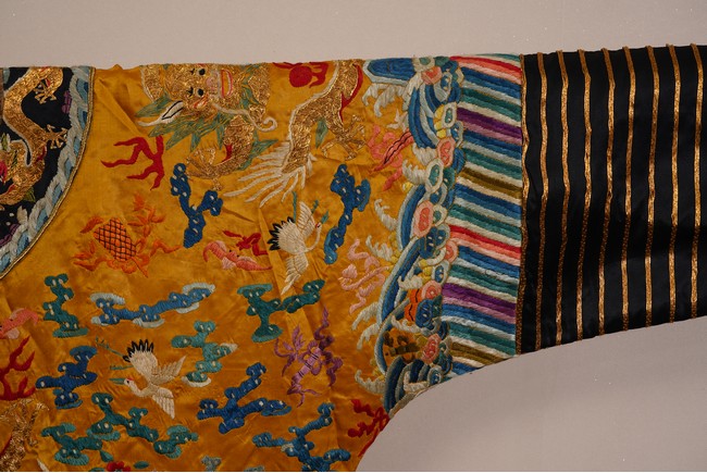 此龍袍圓領,大襟右衽,馬蹄袖。明黃色芝麻紗袍身,醬色素綢裡襯,玄地海水雲龍紋領袖邊。袍面繡五爪金龍紋,前後身、左右肩及底襟繡金龍紋。龍紋間滿繡五色祥雲與紅色蝙蝠,以寓“洪福齊天”。下幅為海水江崖與八寶立水紋,寓意“一統山河”。海面除八寶外,還點綴如意紋。此袍做工規整精細,配色典雅沉穩,盡顯皇室的大氣高貴。