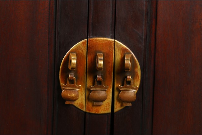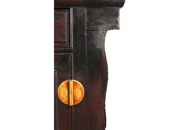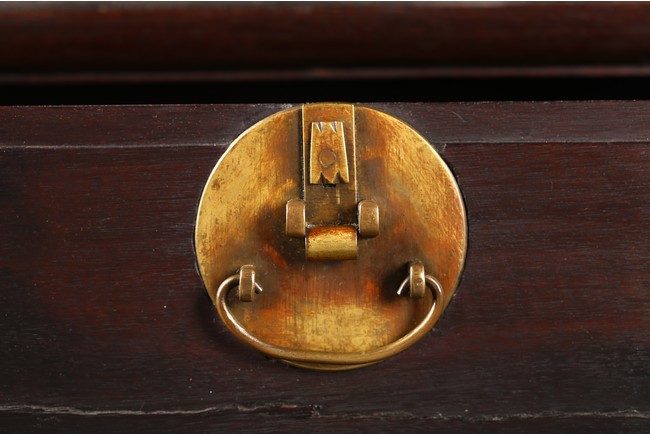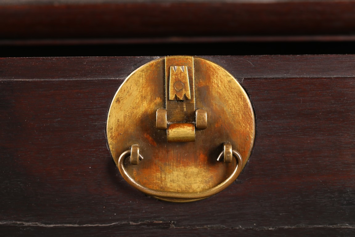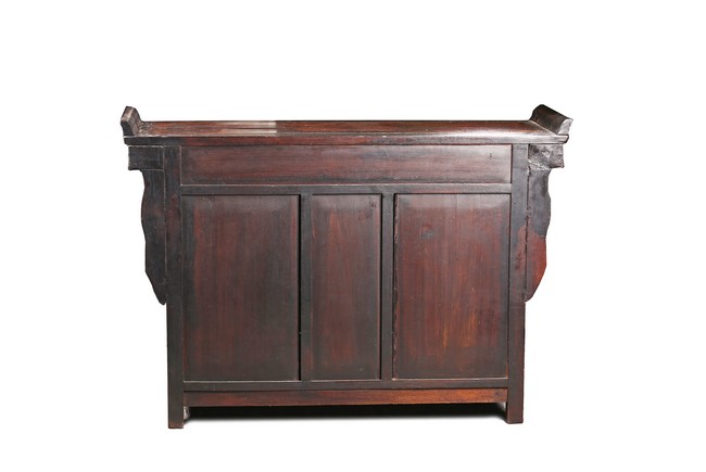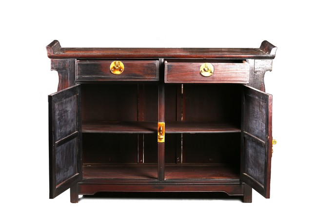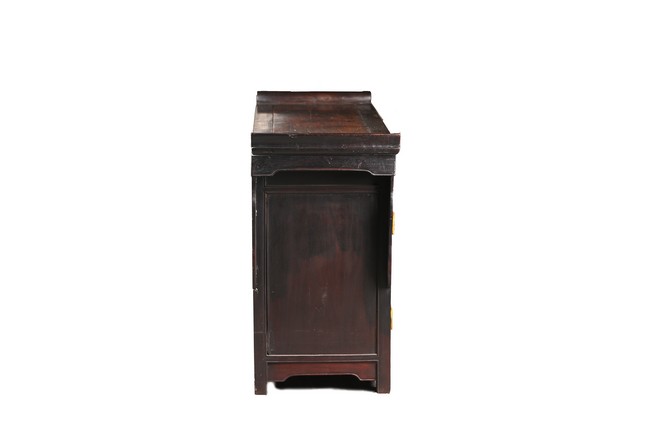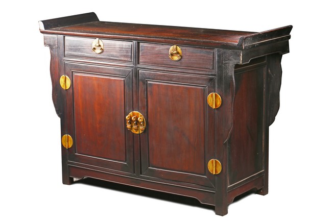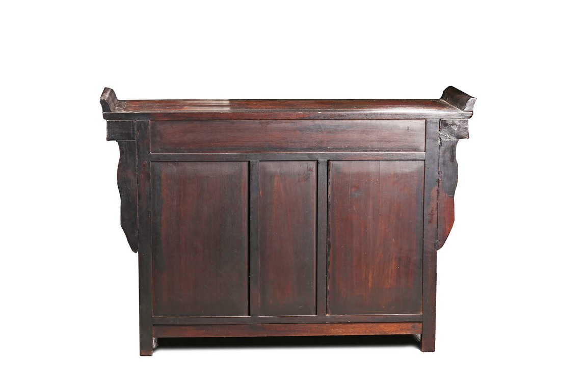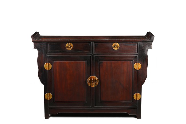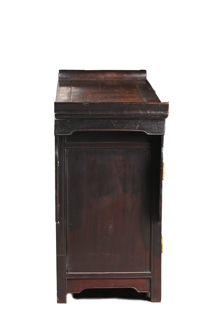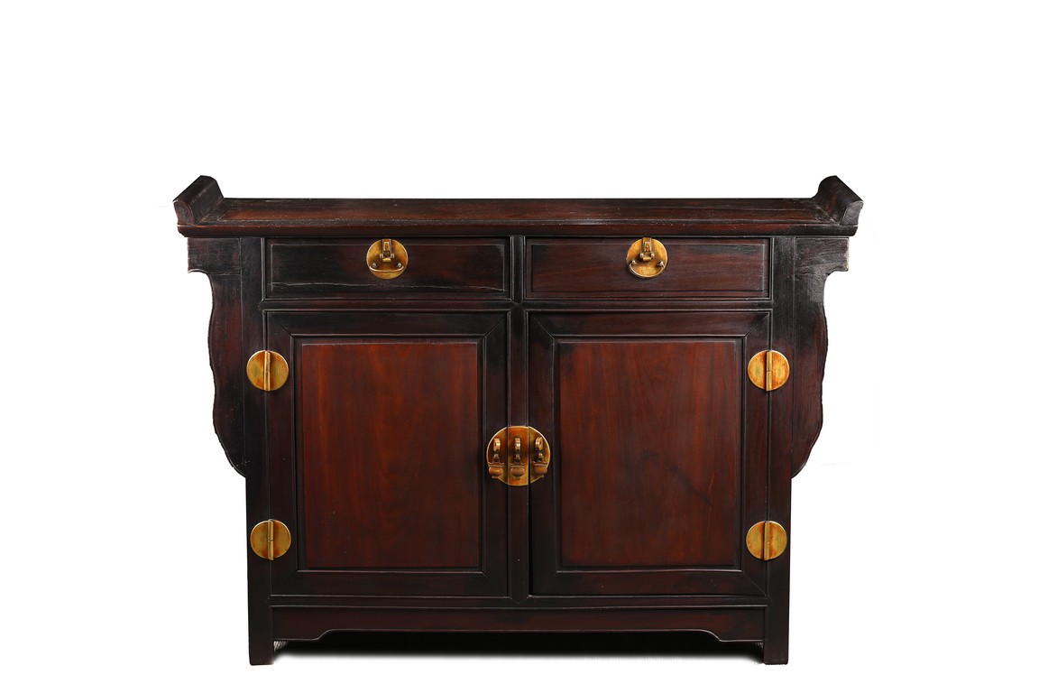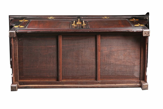 The rectangular top with two panels enclosed in a frame and set with everted flanges to either short end, flanking two drawers above a pair of doors. Republic period.