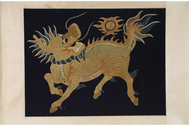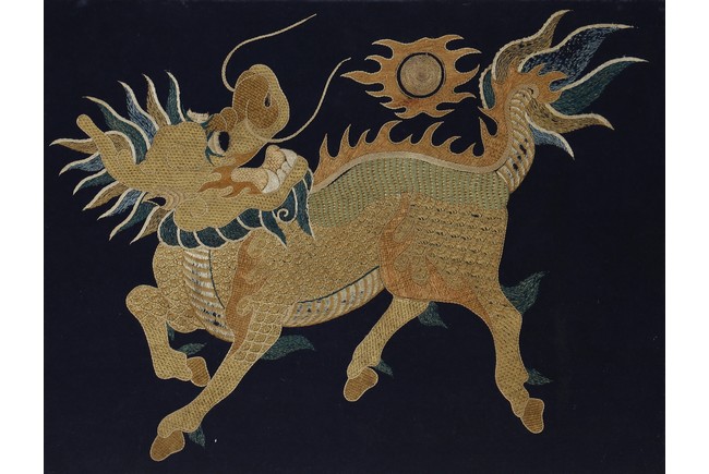 AN EMBROIDERED QILIN PANEL 清 麒麟刺繡掛屏