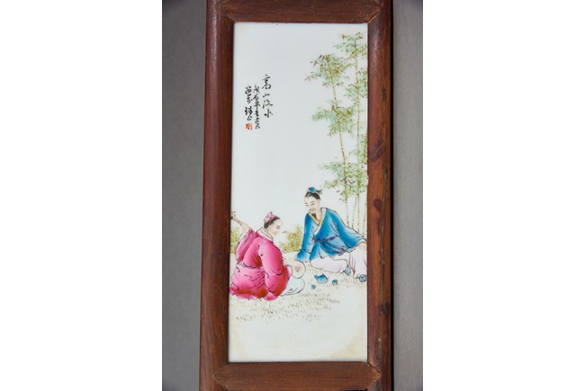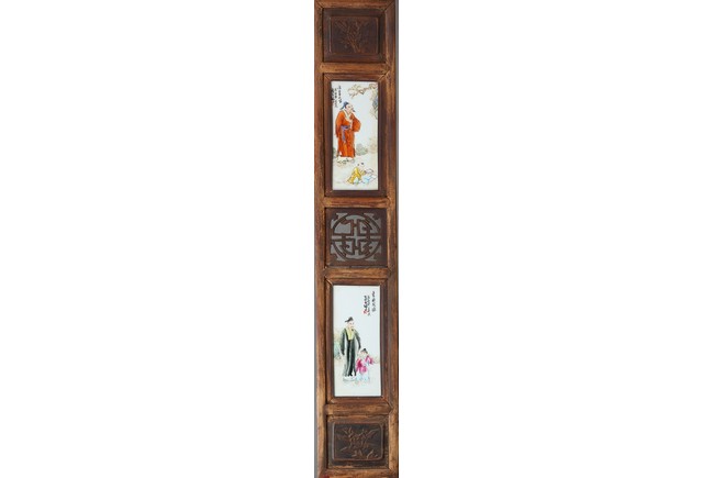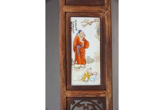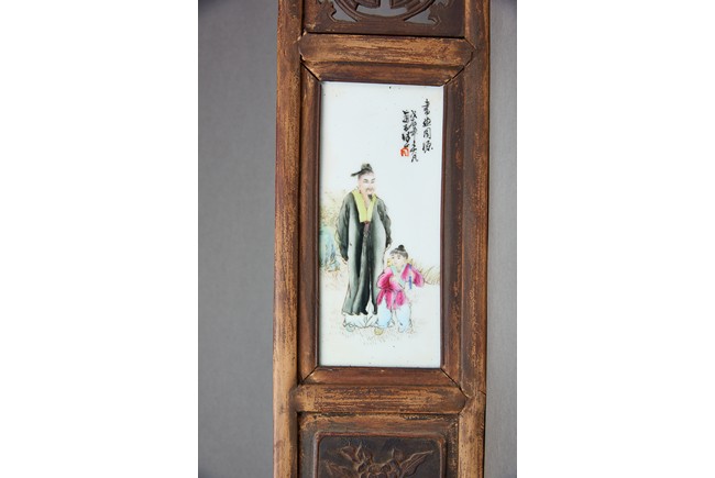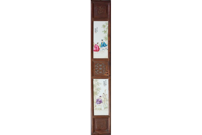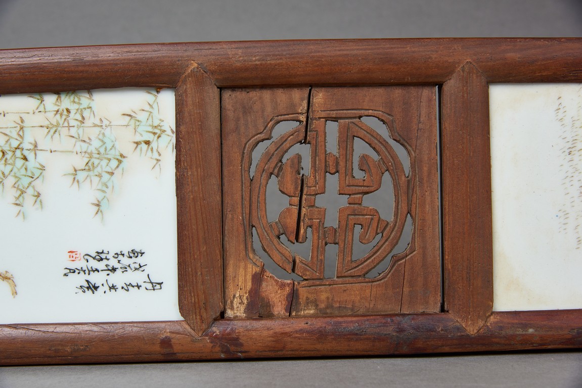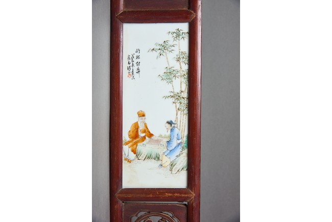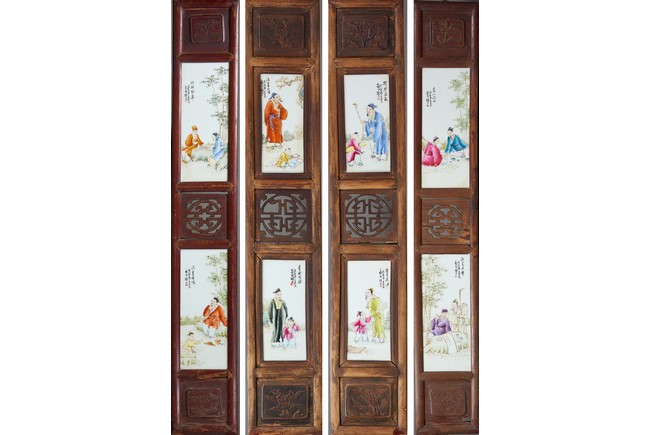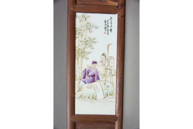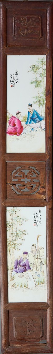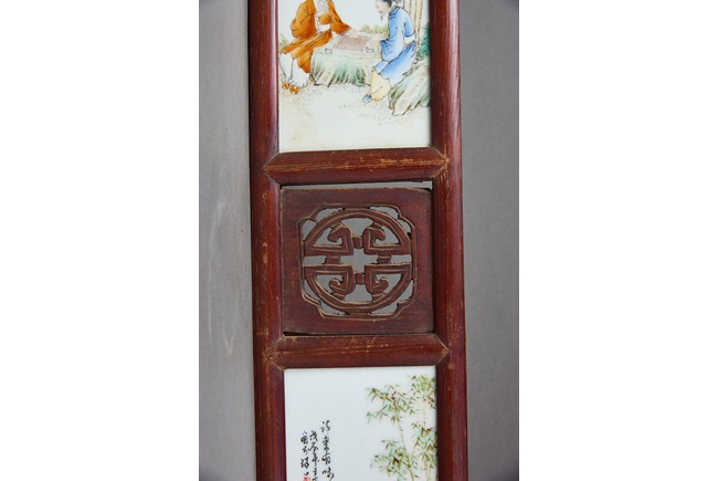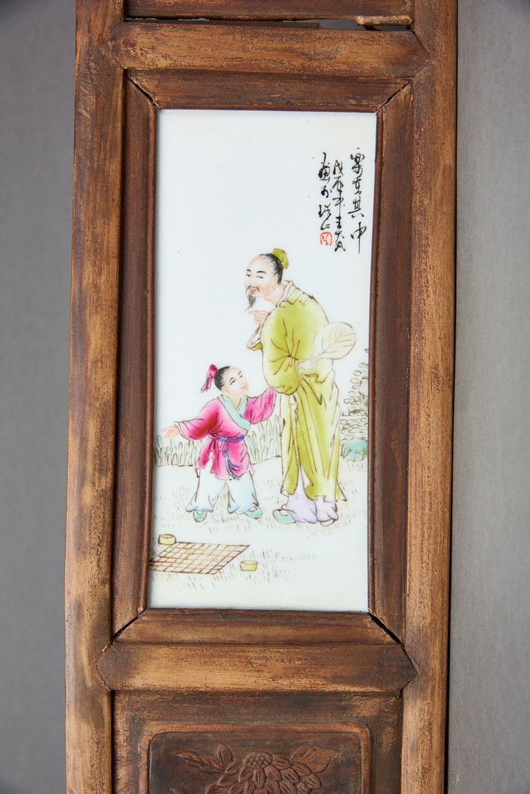 Each famille rose panel painted to depict various story scenes with inscription and painted seal mark, all within carved wood frame.