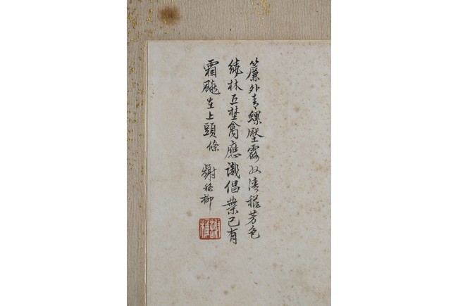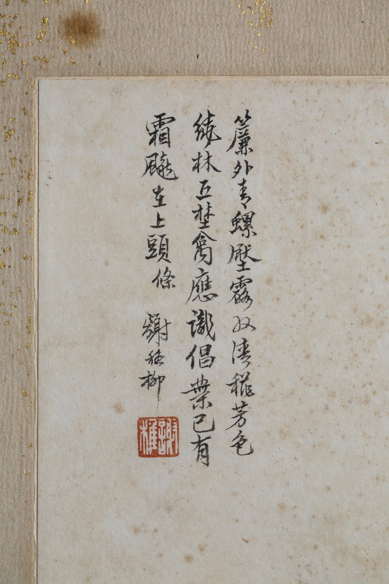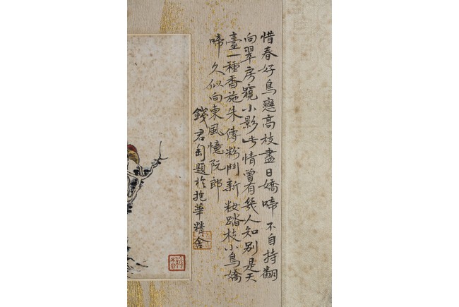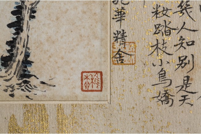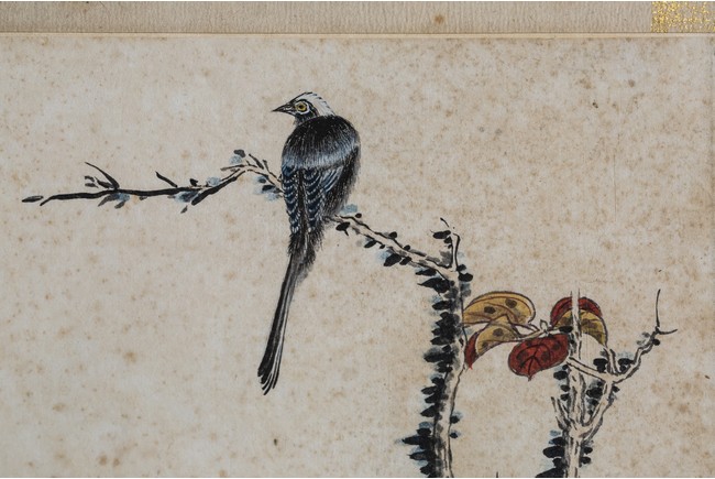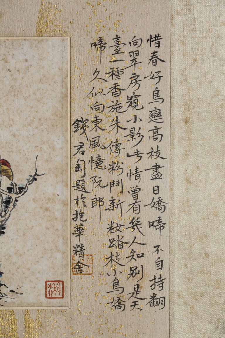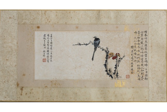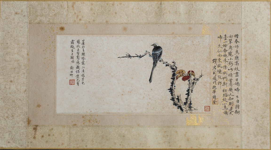 Ink and color on paper. Bird on tree branch. Mounted on paper. Paint inscribed and signed Xie Zhiliu with two seals of the artist. Calligraphy inscribed and signed Qian Juntao with one seal of the artist.