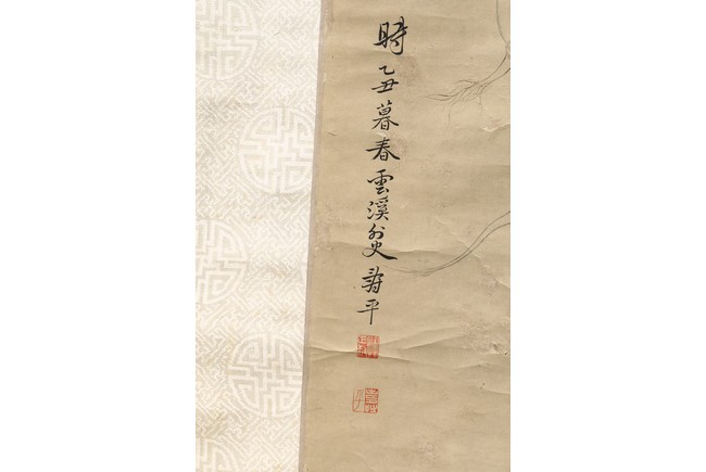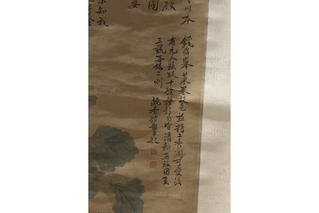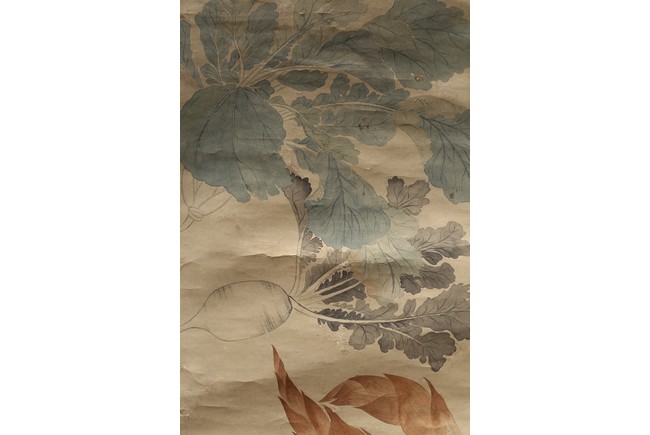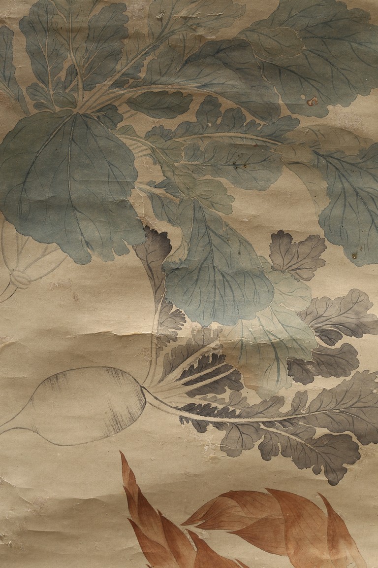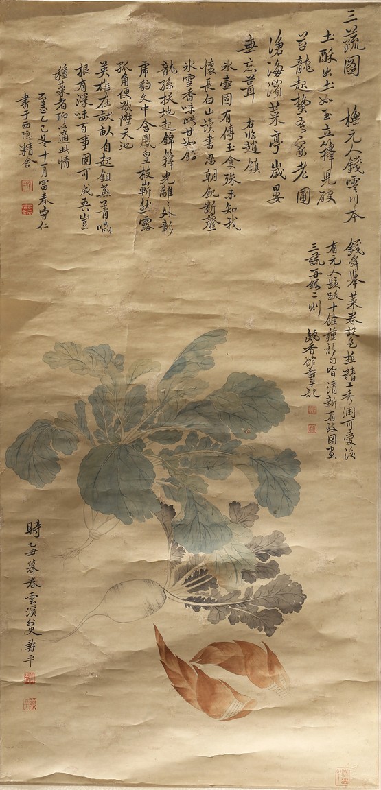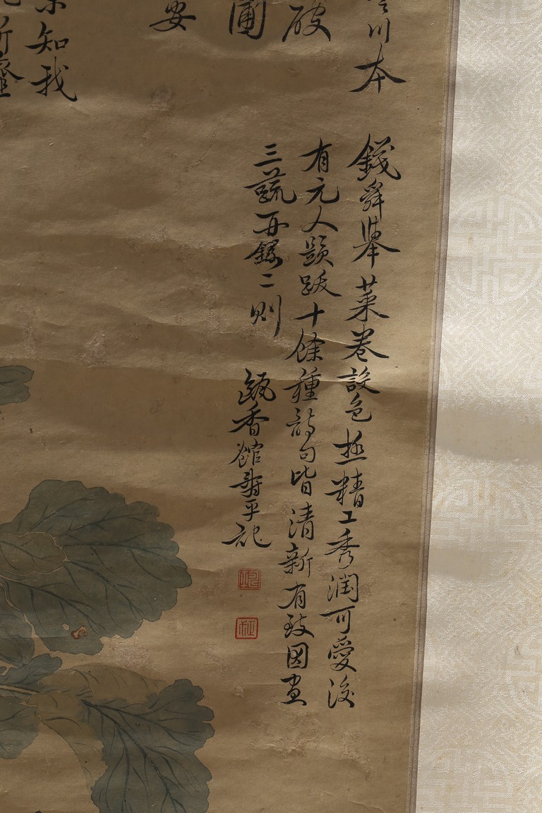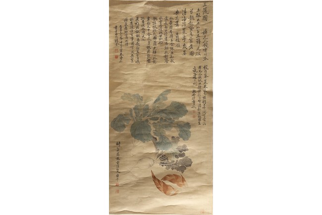 Ink and color on paper. Vegetables. Hanging Scroll. Inscribed and signed Shouping with seven seals of the artist.