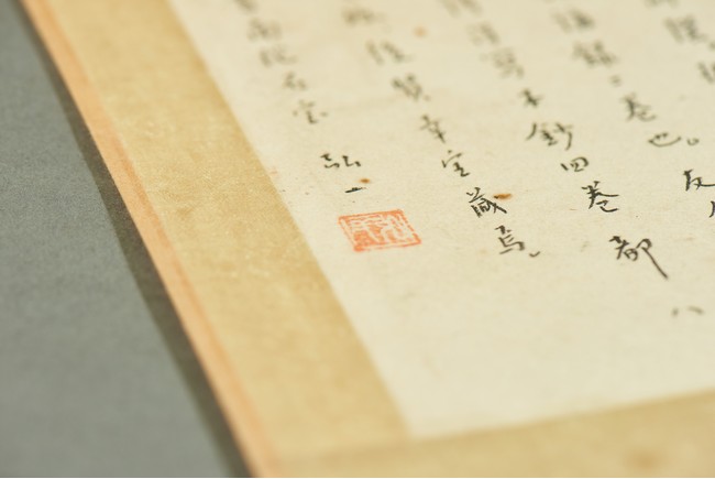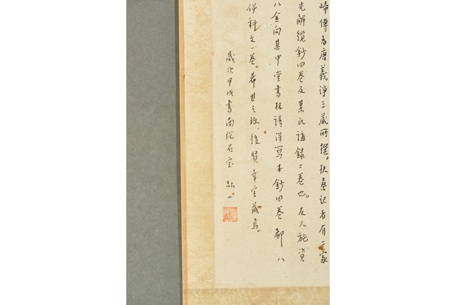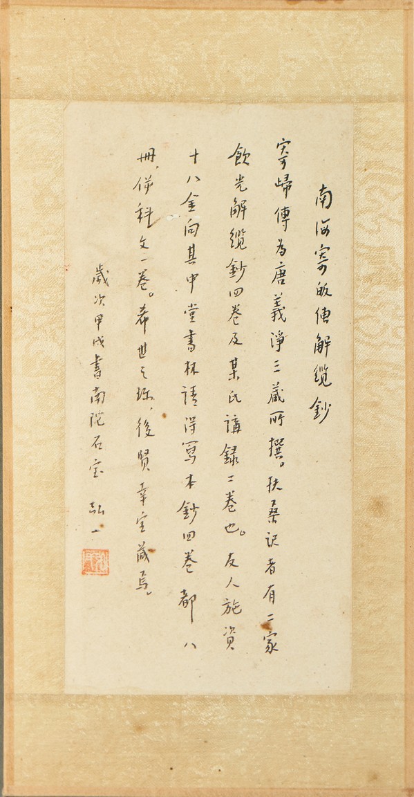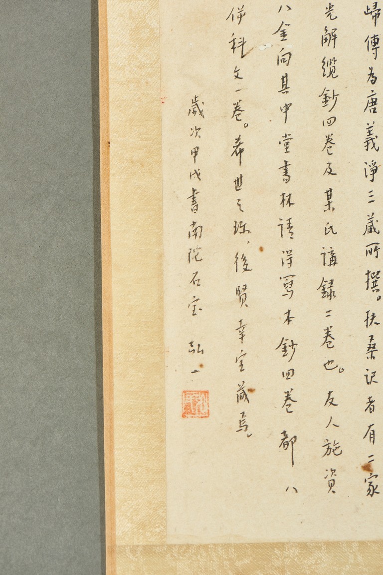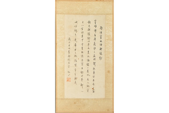 Ink on paper. Calligraphy of Sutra. Mounted on paper. Inscribed and signed Hong Yi with seal of the artist.