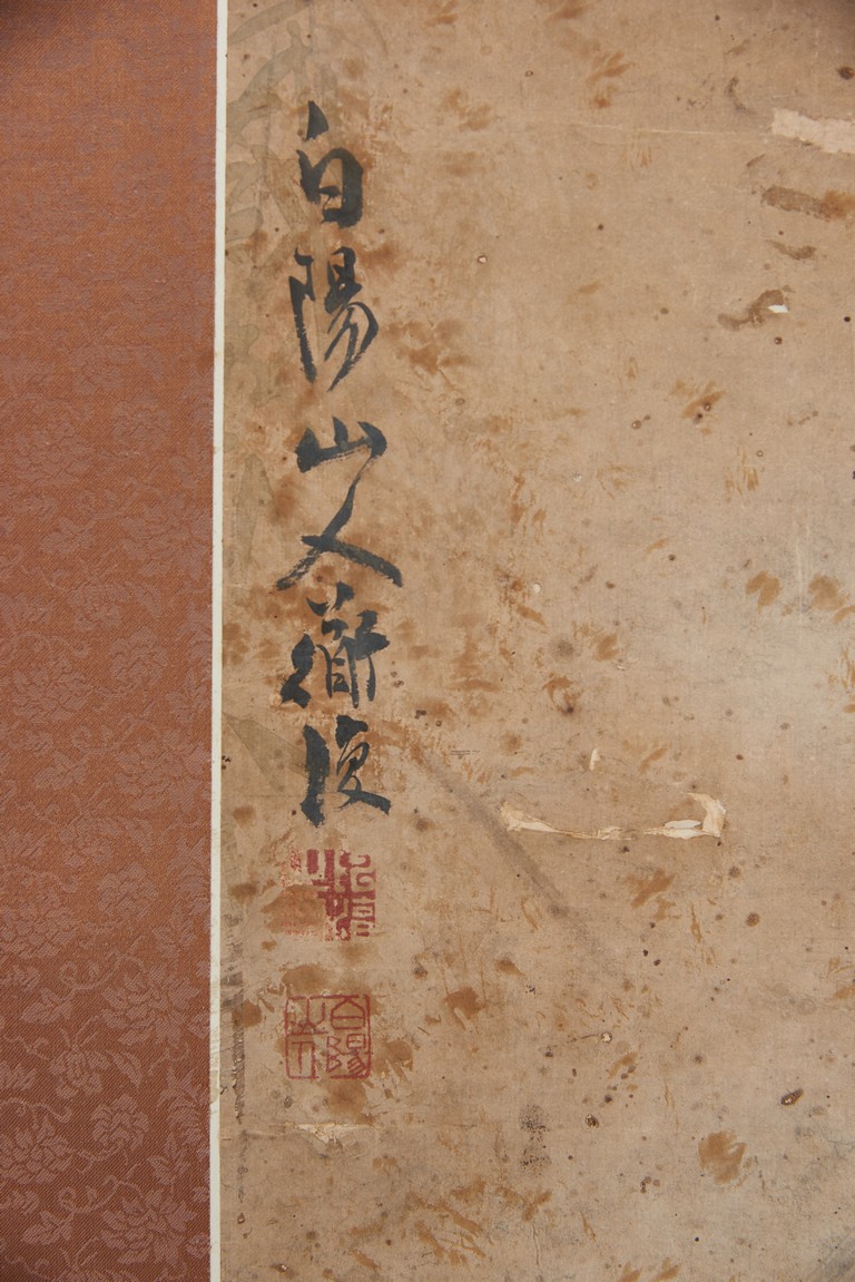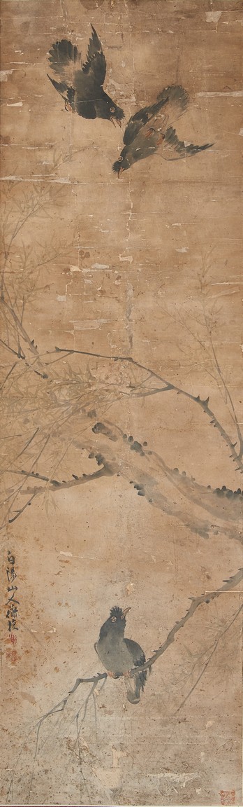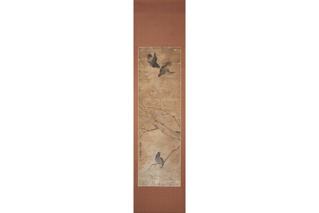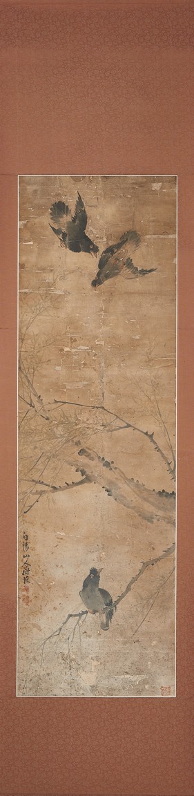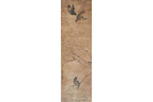 Ink on paper. Birds and Flowers. Hanging scroll. Inscribed and signed Daofu with three seals of the artist.