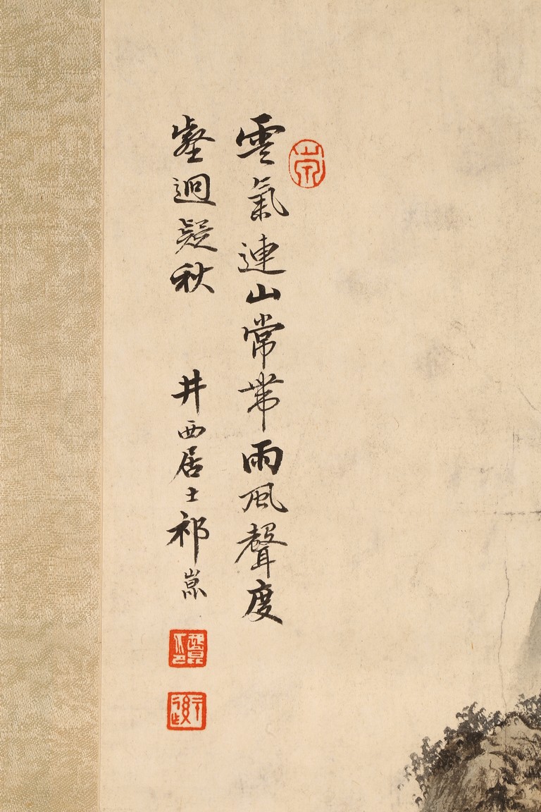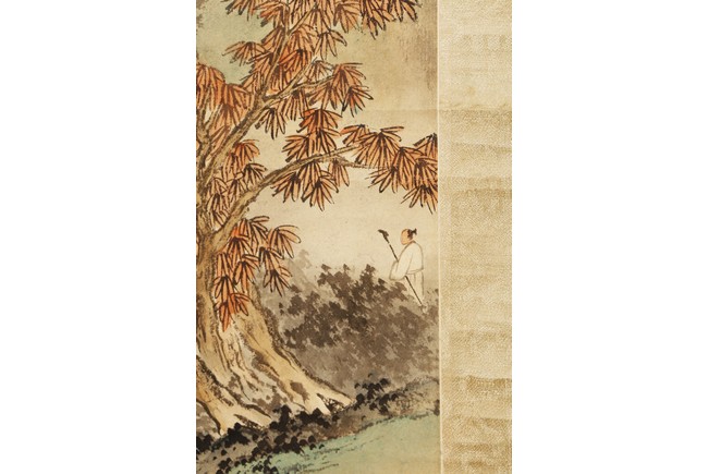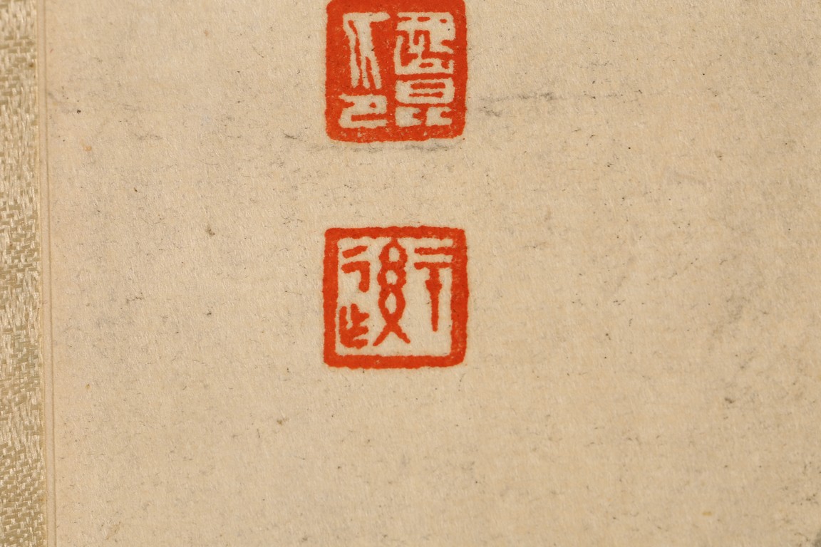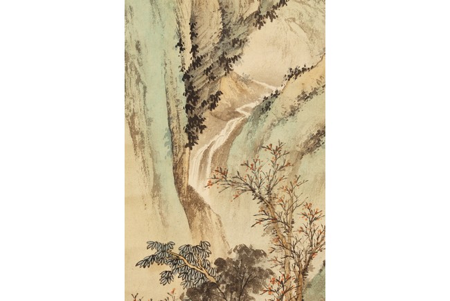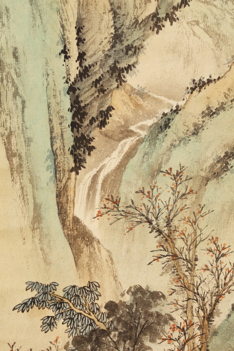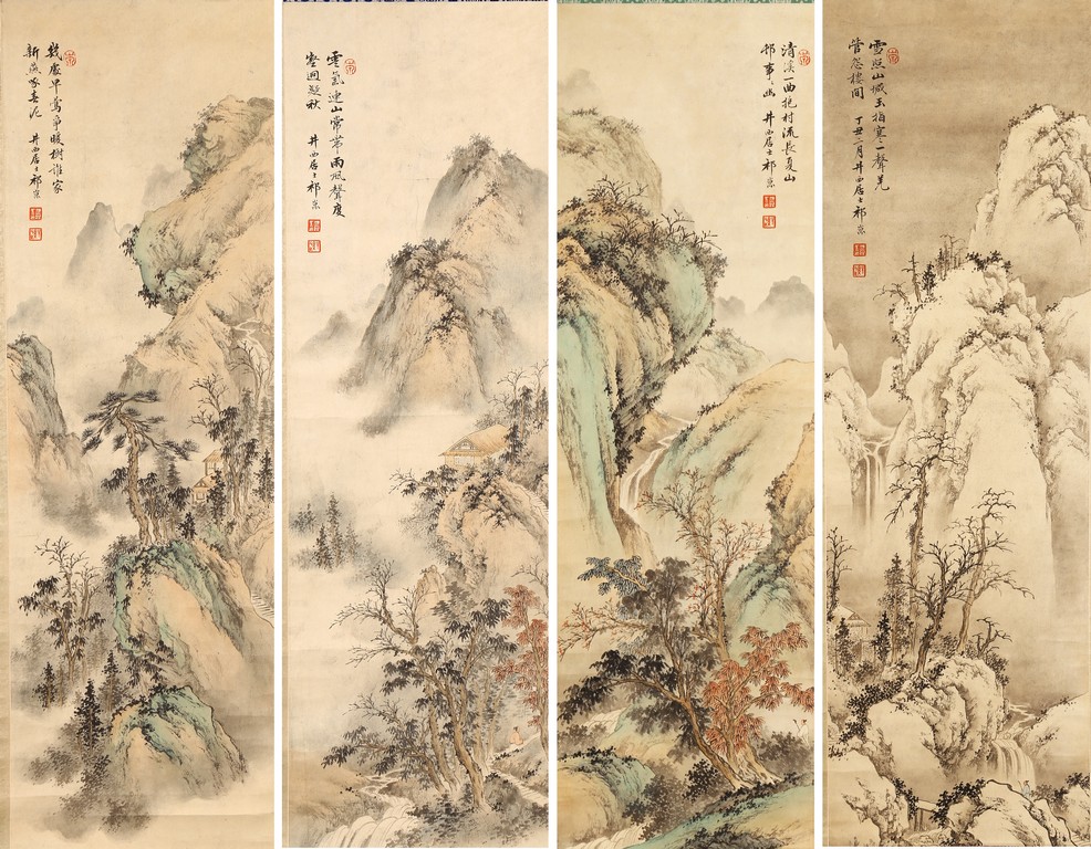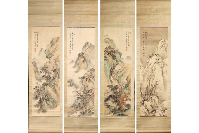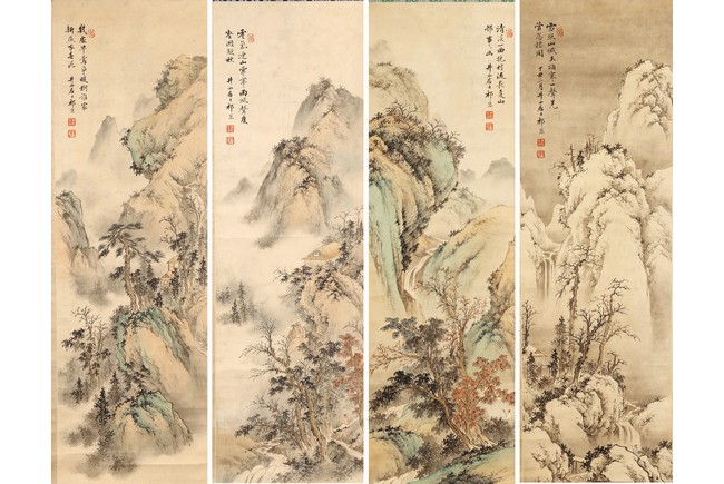 Ink and color on paper. Landscape. Four pieces set hanging scroll. Inscribed and signed Qi Kun with three seals of the artist each paint.